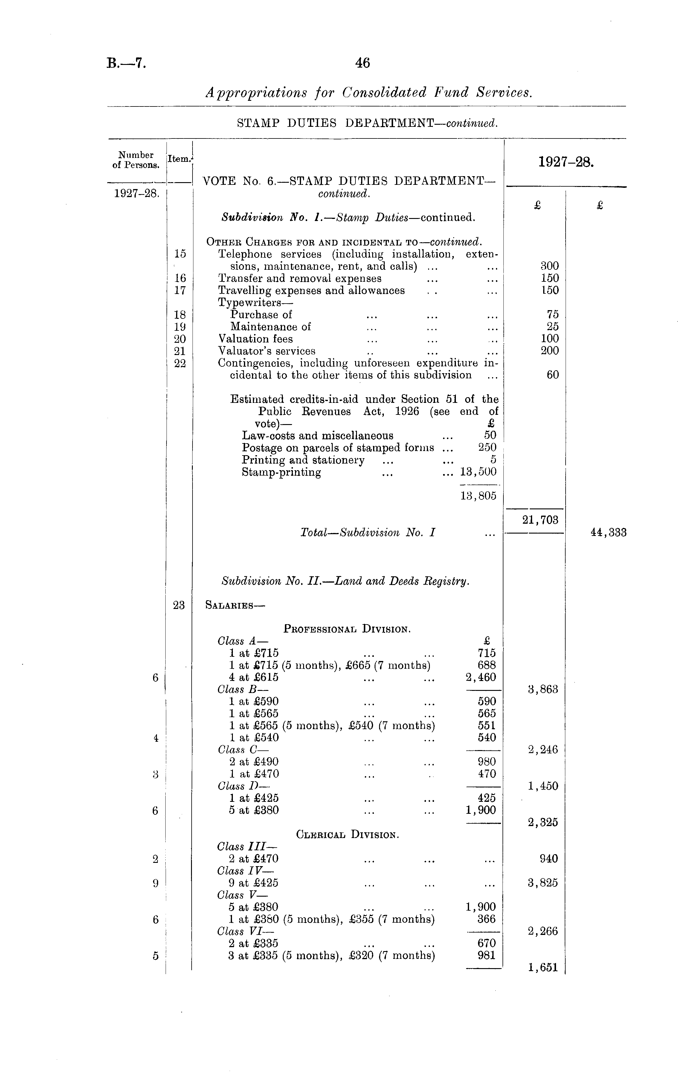 .Si. »"•' 1927-28. VOTE No. 6.—STAMP DUTIES DEPARTMENT— 1927-28. continued. £ £ Subdivision No. 1.—Stamp Duties—continued. Other Charges for and incidental to —continued. 15 Telephone services (including installation, extensions, maintenance, rent, and calls) ... ... 300 j 16 Transfer and removal expenses ... ... 150 17 Travelling expenses and allowances . . ... 150 Typewriters— 18 Purchase of ... ... ... 75 19 Maintenance of ... ... ... 25 20 Valuation fees ... ... ... 100 21 Valuator's services .. ... ... 200 22 Contingencies, including unforeseen expenditure incidental to the other items of this subdivision ... 60 Estimated credits-in-aid under Section 51 of the Public Revenues Act, 1926 (see end of vote) — £ Law-costs and miscellaneous ... 50 Postage on parcels of stamped forms ... 250 j Printing and stationery ... ... 5 Stamp-printing ... ... 13,500 13,805 21,703 Total—Subdivision No. I ... 44,333 Subdivision No. II.—Land and Deeds Registry. 23 Salaries— Professional Division. Glass A— £ 1 at £715 ... ... 715 1 at £715 (5 months), £665 (7 months) 688 6 4 at £615 ... ... 2,460 Class B— 3,863 1 at £590 ... ... 590 1 at £565 ... ... 565 1 at £565 (5 months), £540 (7 months) 551 4 1 at £540 ... ... 540 Glass G— 2,246 2 at £490 ... ... 980 3 1 at £470 ... 470 Glass D— 1,450 1 at £425 ... ... 425 6 5 at £380 ... ... 1,900 —-— 2,325 Clerical Division. Class III— 2 2 at £470 ... ... ... 940 Class IV— 9 9 at £425 ... ... ... 3,825 Class V— 5 at £380 ... ... 1,900 6 1 at £380 (5 months), £355 (7 months) 366 Class VI— —— 2,266 2 at £335 ... ... 670 5 3 at £335 (5 months), £320 (7 months) 981 1,651