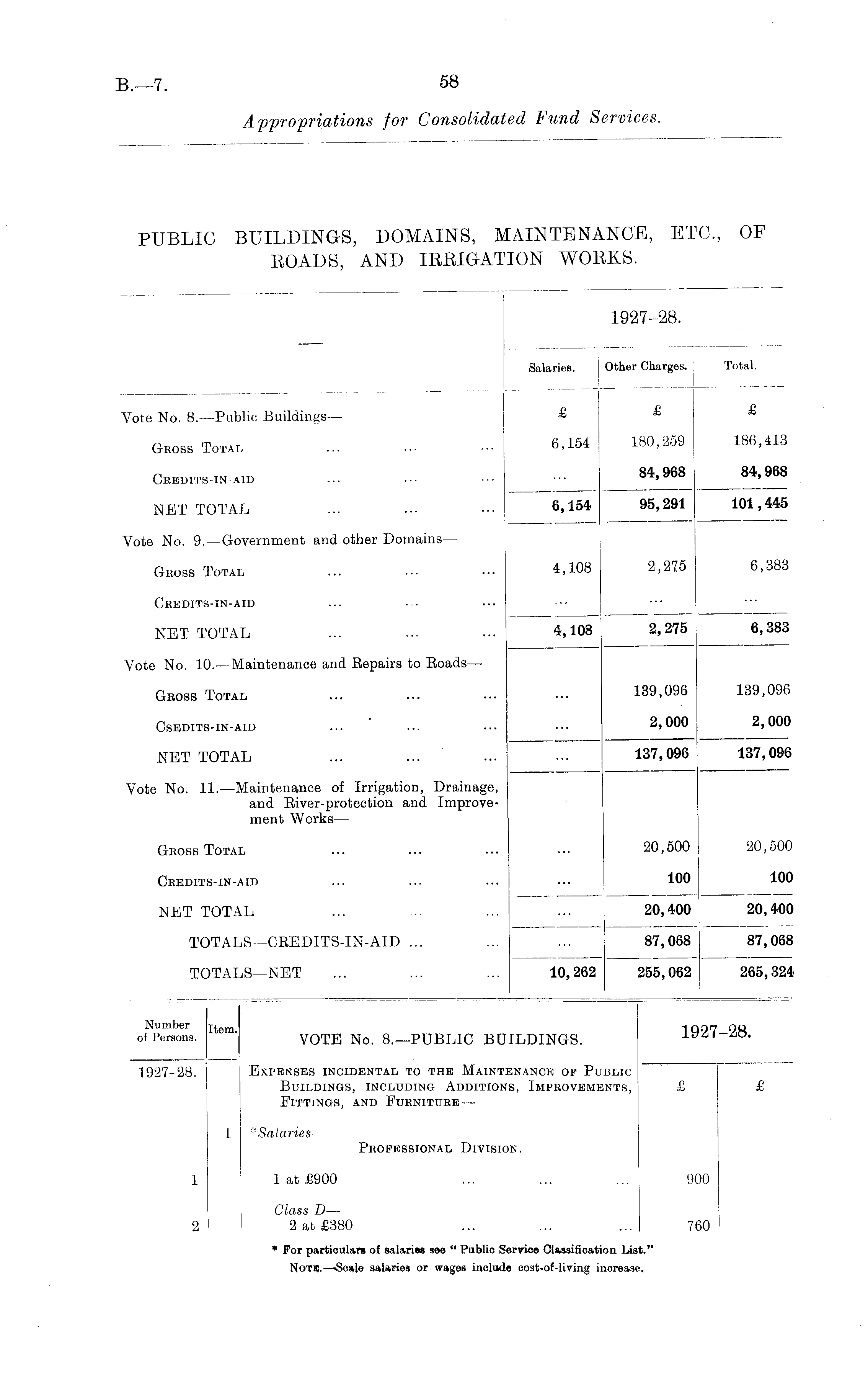 1927-28. Salaries. j Other Charges. Total. Vote No. 8. —Public Buildings— £ £ £ GROSS Total 6,154 180,259 186,413 Credits-in - AID _ 84 > 968 84 ' 968 NET TOTAL ... ... ••• 6,154 95,291 101,445 Vote No. 9.—Government and other Domains— GROSS Total ... ••• 4,108 2,275 6,383 Credits-in-aid NET TOTAL ... ... 4,108 2,275 6,383 Vote No. 10. —Maintenance and Repairs to Eoads— GROSS TOTAL ... ... ... ••• 139,096 139,096 Csedits-IN-AID ... ... ... ••• 2,000 2,000 NET TOTAL ... ... ... 137,096 137,096 Vote No. 11.—Maintenance of Irrigation, Drainage, and River-protection and Improvement Works — Gross Total ... ... ... ... 20,500 20,500 Credits-in-aid ... ... ... ... 100 100 NET TOTAL ... ... ... 20,400 20,400 TOTALS—CREDITS-IN-AID ... ... ... 87,068 87,068 TOTALS—NET ... ... ... 10,262 255,062 265,324 Number Item no of Persons. ' VOTE No. 8.—PUBLIC BUILDINGS. ' AO ' 1927-28. Expenses incidental to the Maintenance of Public Buildings, including Additions, Improvements, £ £ Fittings, and Furniture— 1 * Salaries— Professional Division. 1 1 at £900 ... ... ... 900 Glass D— 2 2 at £380 ... ... ... 760 * For particulars of salaries see " Public Service Classification List." Not®.—Scale salaries or wages include cost-of-living inorease.