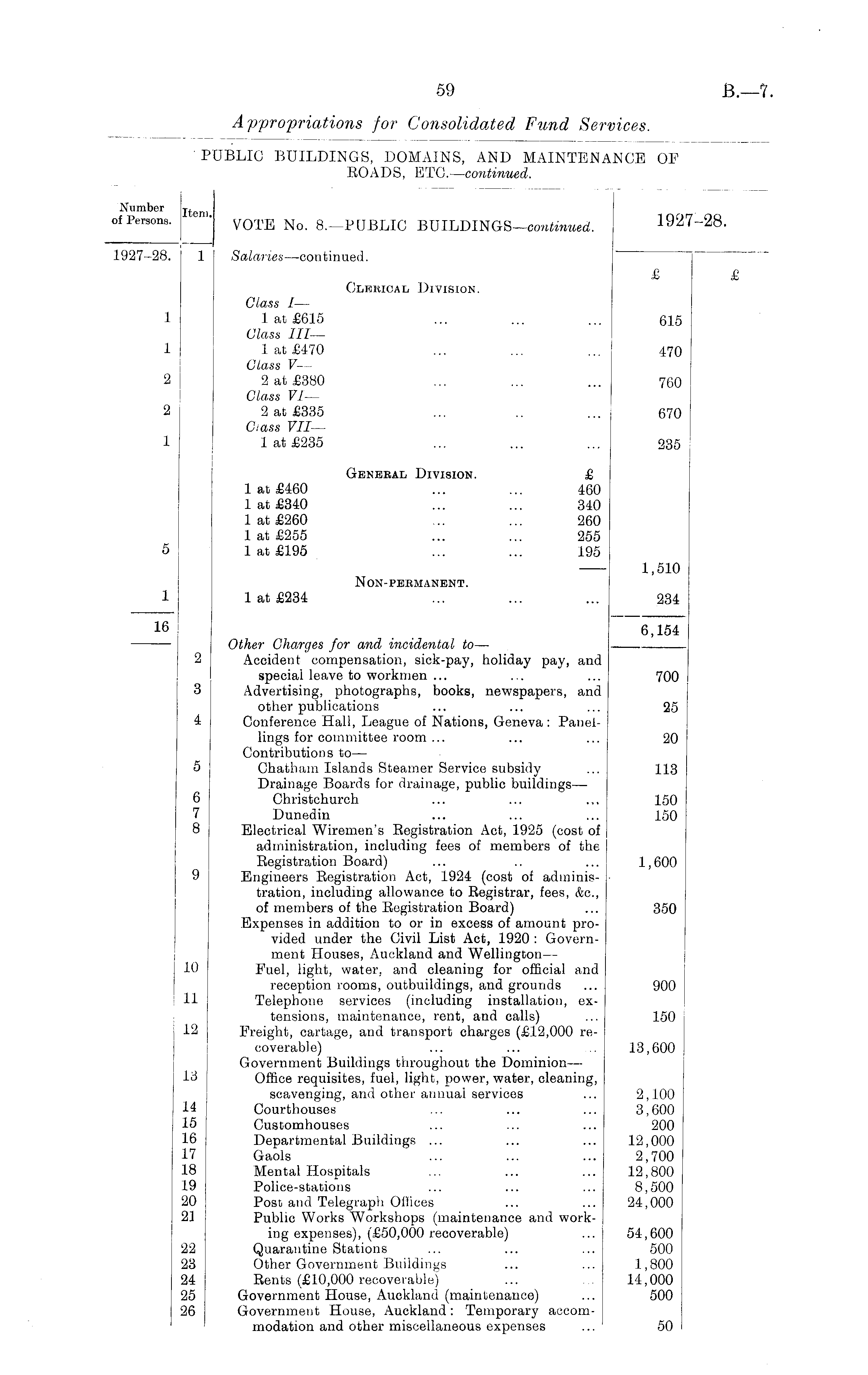 Number jt en , Of Persons. ' ' V0TE No. 8.—PUBLIC BUILDINGS—continued. 1927-28. 1927-28. 1 Salaries—continued. £ £ Clerical Division. Class I— 1 1 at £615 ... ... ... 615 Class III— 1 1 at £470 ... ... ... 470 Class V— 2 j 2 at £380 ... ... ... 760 Class VI— 2 2 at £335 ... .. ... 670 C/ass VII— 1 1 at £235 ... ... ... 235 General Division. £ 1 at £460 ... ... 460 1 at £340 ... ... 340 1 at £260 ... ... 260 1 at £255 ... ... 255 5 1 at £195 ... ... 195 1,510 N ON-PERMANENT. 1 1 at £234 ... ... ... 234 16 6,154 Other Charges for and incidental to— 2 Accident compensation, sick-pay, holiday pay, and special leave to workmen ... ... ... 700 3 Advertising, photographs, books, newspapers, and other publications ... ... ... 25 4 Conference Hall, League of Nations, Geneva : Panellings for committee room ... ... ... 20 Contributions to — 5 Chatham Islands Steamer Service subsidy ... 113 Drainage Boards for drainage, public buildings— 6 Christchurch ... ... ... 150 7 Dunedin ... ... ... 150 8 Electrical Wiremen's Begistration Act, 1925 (cost of administration, including fees of members of the Begistration Board) ... .. ... 1,600 9 Engineers Begistration Act, 1924 (cost of administration, including allowance to Begistrar, fees, &c., of members of the Begistration Board) ... 350 Expenses in addition to or in excess of amount provided under the Civil List Act, 1920 : Government Houses, Auckland and Wellington— 10 Fuel, light, water, and cleaning for official and reception rooms, outbuildings, and grounds ... 900 11 Telephone services (including installation, extensions, maintenance, rent, and calls) ... 150 12 Freight, cartage, and transport charges (£12,000 recoverable) ... ... .. 13,600 Government Buildings throughout the Dominion— 13 Office requisites, fuel, light, power, water, cleaning, scavenging, and other annual services ... 2,100 14 Courthouses ... ... ... 3,600 15 Customhouses ... ... ... 200 16 Departmental Buildings ... ... ... 12,000 17 Gaols ... ... ... 2,700 18 Mental Hospitals ... ... ... 12,800 19 Police-stations ... ... ... 8,500 20 Post, and Telegraph Offices ... ... 24,000 21 Public Works Workshops (maintenance and working expenses), (£50,000 recoverable) ... 54,600 22 Quarantine Stations ... ... ... 500 23 Other Government Buildings ... ... 1,800 24 Bents (£10,000 recoverable) ... 14,000 25 Government House, Auckland (maintenance) ... 500 | 26 Government House, Auckland : Temporary accommodation and other miscellaneous expenses ... 50