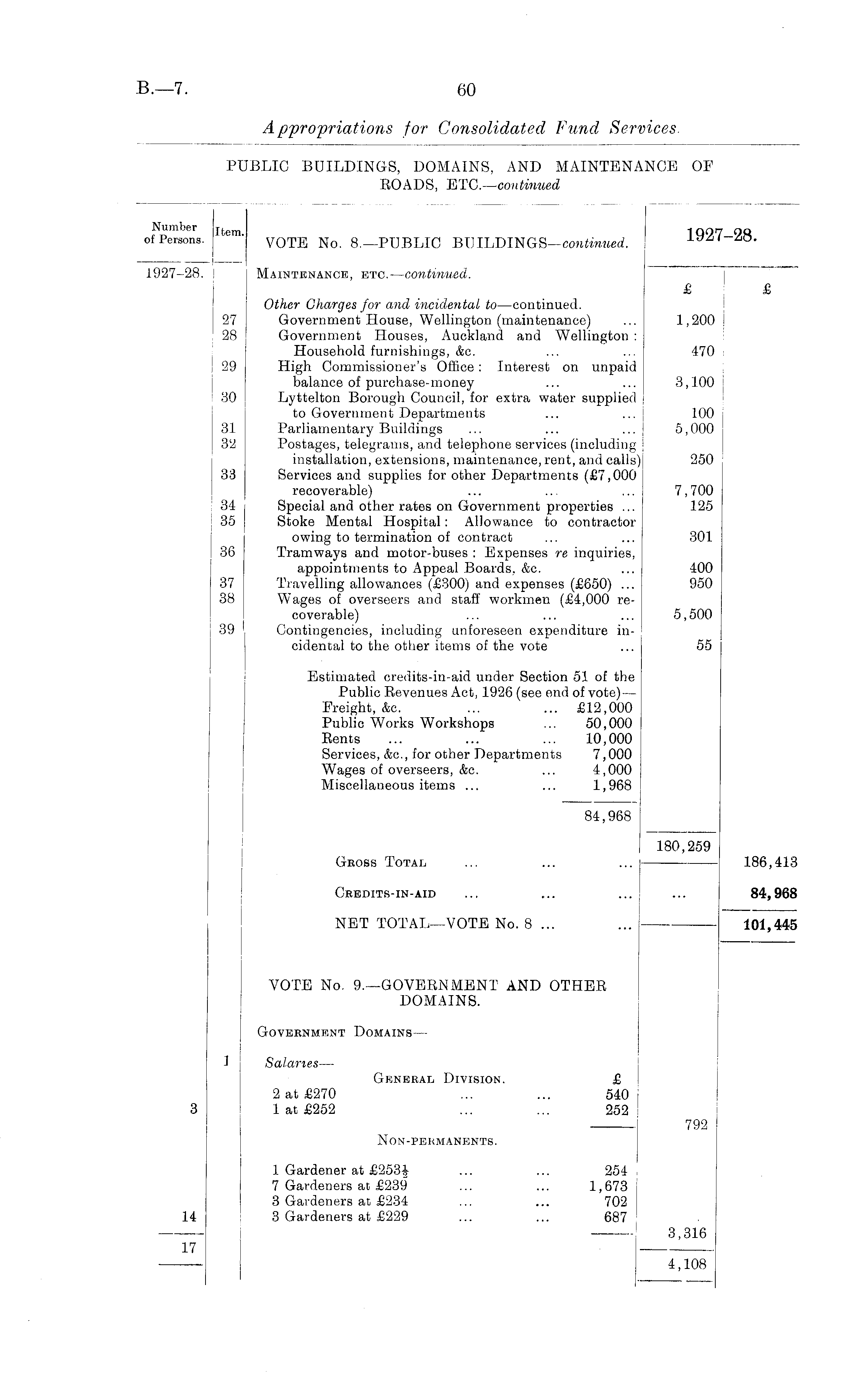 Number Ifcem _ Q07_0Q of Persons. VOTE No. 8.—PUBLIC BUILDINGS—continued. 1927-28. I Maintenance, etc. —continued. \ £ £ Other Charges for and incidental to —continued. 27 Government House, Wellington (maintenance) ... 1,200 28 Government Houses, Auckland and Wellington : Household furnishings, &c. ... ... 470 29 High Commissioner's Office: Interest on unpaid balance of purchase-money ... ... 3,100 j 80 Lyttelton Borough Council, for extra water supplied to Government Departments ... ... 100 31 Parliamentary Buildings ... ... ... 5,000 32 Postages, telegrams, and telephone services (including installation, extensions, maintenance, rent, and calls) 250 33 Services and supplies for other Departments (£7,000 recoverable) ... ... ... 7,700 I 34 Special and other rates on Government properties ... 125 35 Stoke Mental Hospital: Allowance to contractor owing to termination of contract ... ... 301 36 Tramways and motor-buses : Expenses re inquiries, appointments to Appeal Boards, &c. ... 400 37 Travelling allowances (£300) and expenses (£650) ... 950 38 Wages of overseers and staff workmen (£4,000 recoverable) ... ... ... 5,500 39 Contingencies, including unforeseen expenditure incidental to the other items of the vote ... 55 Estimated credits-in-aid under Section 51 of the Public Revenues Act, 1926 (see end of vote) — Freight, &c. ... ... £12,000 Public Works Workshops ... 50,000 Rents ... ... ... 10,000 Services, &c., for other Departments 7,000 Wages of overseers, &c. ... 4,000 Miscellaneous items ... ... 1,968 84,968 180,259 Gross Total ... ... ... 186,413 Credits-in-aid ... ... ... ... 84,968 NET TOTAL—VOTE No. 8 ... ... 101,445 VOTE No. 9.—GOVERNMENT AND OTHER DOMAINS. Government Domains— ] Salaries— General Division. £ 2 at £270 ... ... 540 3 1 at £252 ... ... 252 792 Non-permanents. 1 Gardener at £253J ... ... 254 7 Gardeners at £239 ... ... 1,673 3 Gardeners at £234 ... ... 702 14 3 Gardeners at £229 ... ... 687 3,316 17 —— 4,108