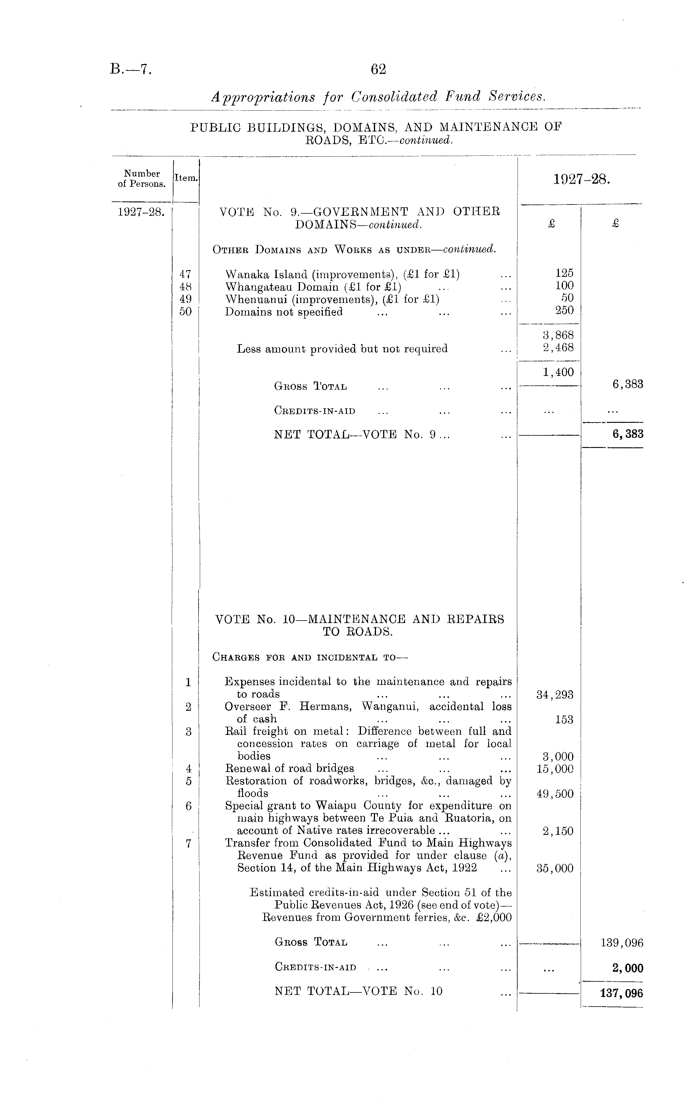 of N p™. Item - 1927-28. 1927-28. VOTE No. 9.—GOVERNMENT AND OTHER DOMAINS—continued. £ £ Other Domains and Works as under —continued. 47 Wanaka Island (improvements), (£1 for £1) ... 125 48 Whangateau Domain (£1 for £1) ... ... 100 49 Whenuanui (improvements), (£1 for £1) ... 50 50 Domains not specified ... ... ... 250 3,868 Less amount provided but not required ... 2,468 1,400 Gross Total ... ... ... 6,383 Credits-in-aid ... NET TOTAL—VOTE No. 9... ... 6,383 VOTE No. 10—MAINTENANCE AND REPAIRS TO ROADS. Charges for and incidental to — 1 Expenses incidental to the maintenance and repairs to roads ... ... ... 34,293 2 Overseer F. Hermans, Wanganui, accidental loss of cash ... ... ... 153 3 Rail freight on metal: Difference between full and concession races on carriage of metal for local bodies ... ... ... 3,000 4 Renewal of road bridges ... ... ... 15,000 5 Restoration of roadworks, bridges, &c., damaged by floods ... ... ... 49,500 6 Special grant to Waiapu County for expenditure on main highways between Te Puia and Ruatoria, on account of Native rates irrecoverable ... ... 2,150 7 Transfer from Consolidated Eund to Main Highways Revenue Fund as provided for under clause (a), Section 14, of the Main Highways Act, 1922 ... 35,000 Estimated credits-in-aid under Section 51 of the Public Revenues Act, 1926 (see end of vote) — Revenues from Government ferries, &c. £2,000 GROSS Total ... ... ... —— 139,096 Credits-in-aid ... ... ... ... 2,000 NET TOTAL—VOTE No. 10 ... ' 137,096