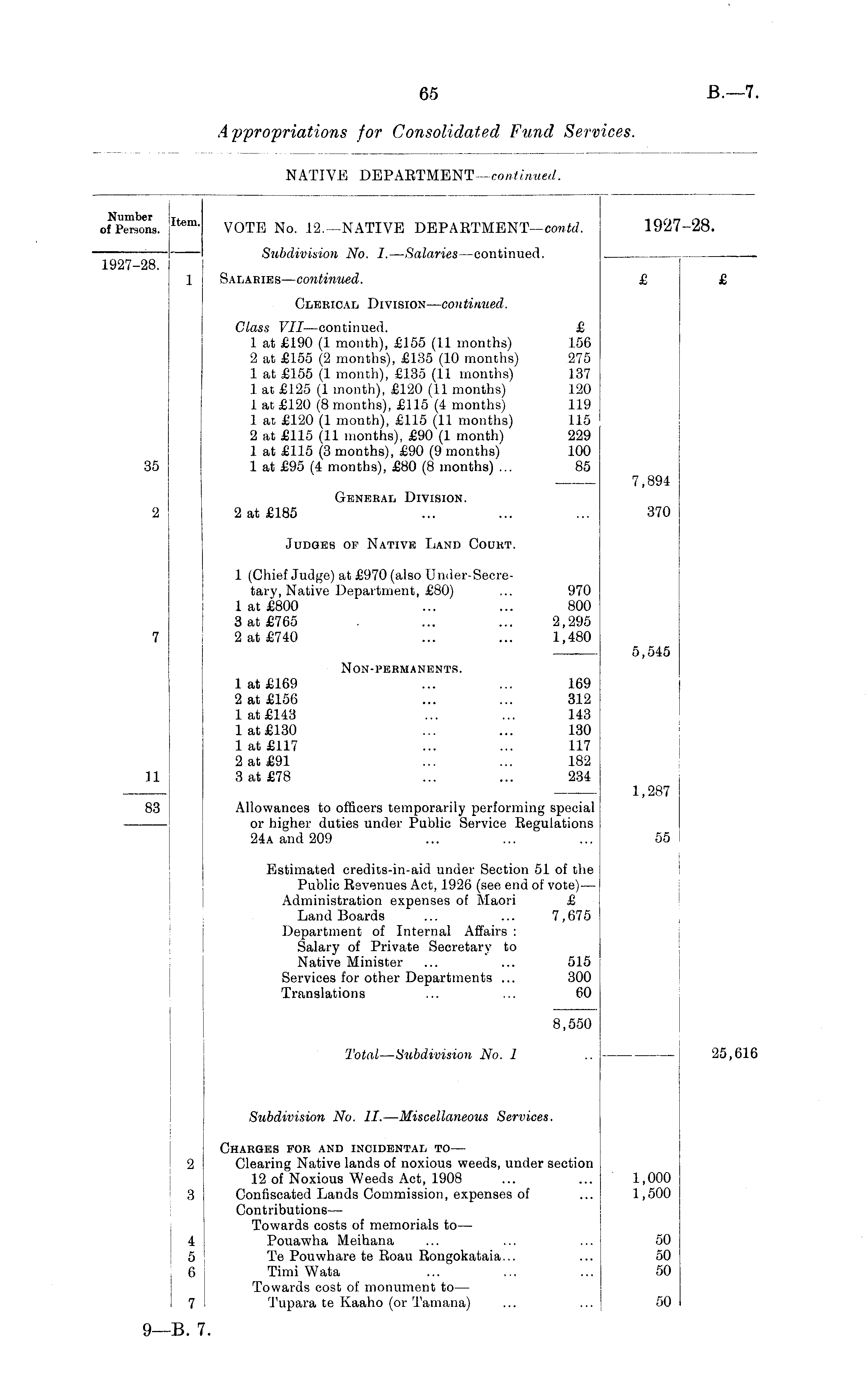 Item " VOTE No. 12.—NATIVE DEPARTMENT —contd. 1927-28. — Subdivision No. I. —Salaries—continued. __ 1927-28. 1 Salaries—continued. £ £ Clerical Division —continued. Class VII —continued. £ 1 at £190 (1 month), £155 (11 months) 156 2 at £155 (2 months), £135 (10 months) 275 1 at £155 (1 month), £135 (11 months) 137 1 at £125 (1 month), £120 (11 months) 120 1 at £120 (8 months), £115 (4 months) 119 1 at £120 (1 month), £115 (11 months) 115 2 at £115 (11 months), £90 (1 month) 229 1 at £115 (3 months), £90 (9 months) 100 35 1 at £95 (4 months), £80 (8 months) ... 85 7,894 General Division. 2 2 at £185 ... ... ... 370 Judges op Native Land Court. 1 (Chief Judge) at £970 (also Under-Secre-tary, Native Department, £80) ... 970 1 at £800 ... ... 800 3 at £765 ... ... 2,295 7 2 at £740 ... ... 1,480 — 5,545 Non-permanents. 1 at £169 ... ... 169 2 at £156 ... ... 312 1 at £143 ... ... 143 1 at £130 ... ... 130 1 at £117 ... ... 117 2 at £91 ... ... 182 11 3 at £78 ... ... 234 —1,287 83 Allowances to officers temporarily performing special or higher duties under Public Service Regulations 24a and 209 ... ... ... 55 Estimated credits-in-aid under Section 51 of the Public Revenues Act, 1926 (see end of vote) — Administration expenses of Maori £ Land Boards ... ... 7,675 Department of Internal Affairs : Salary of Private Secretary to Native Minister ... ... 515 Services for other Departments ... 300 Translations ... ... 60 8,550 Total—Subdivisio7i No. 1 .. 25,616 Subdivision No. II. —Miscellaneous Services. Charges for and incidental to — 2 Clearing Native lands of noxious weeds, under section 12 of Noxious Weeds Act, 1908 ... ... 1,000 3 Confiscated Lands Commission, expenses of ... 1,500 Contributions — Towards costs of memorials to— 4 Pouawha Meihana ... ... ... 50 5 Te Pouwhare te Roau Rongokataia... ... 50 6 Timi Wata ... ... ... 50 Towards cost of monument to— 7 Tupara te Kaaho (or Tamana) ... ... 50
