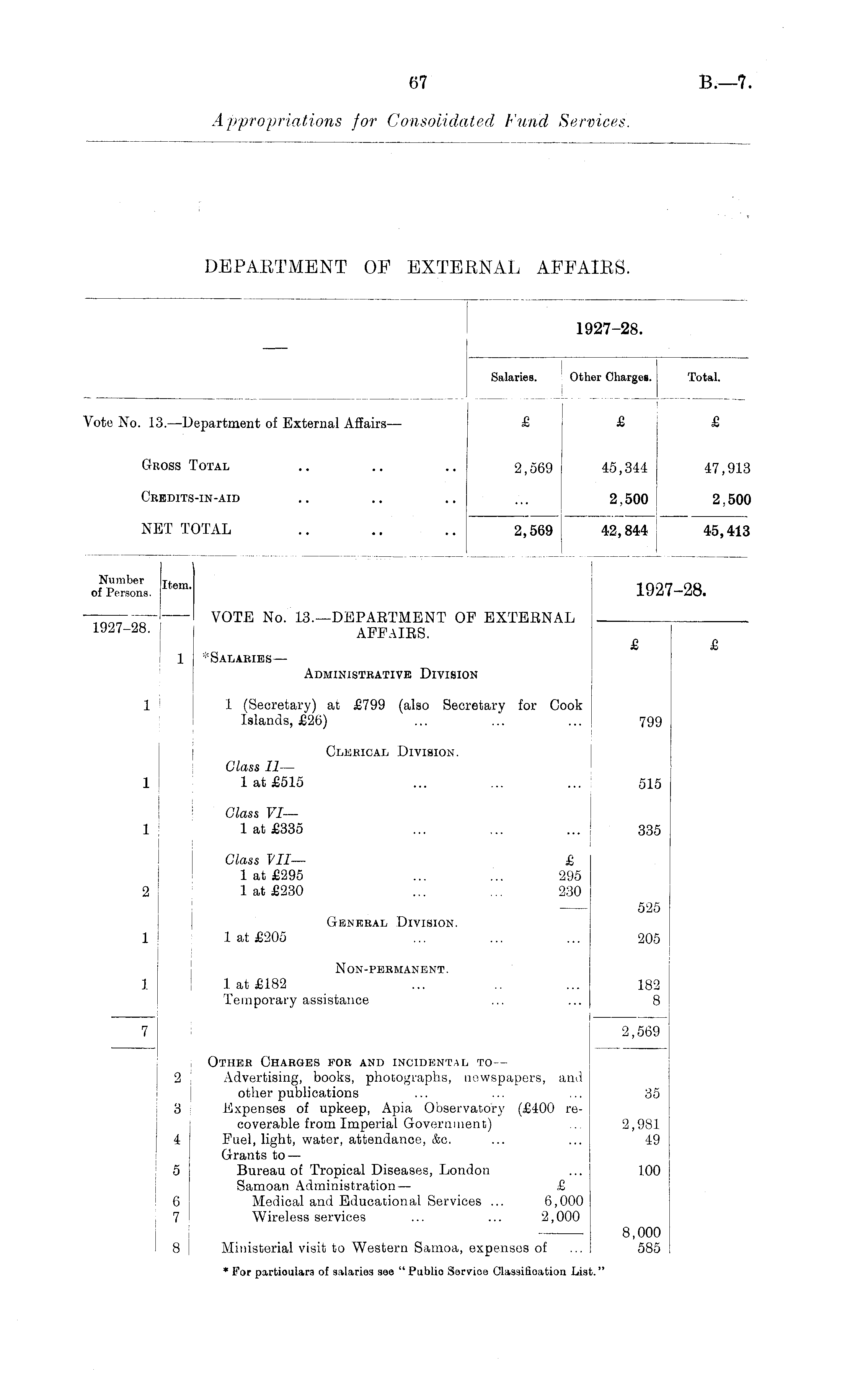 1927-28. Salaries. Other Charges. Total. Vote No. 13.—Department of External Affairs — £ £ £ GROSS Total .. .. .. 2,569 45,344 47,913 CREDITS-IN-AID .. .. .. ... 2,500 2,500 NET TOTAL .. .. .. 2,569 42,844 45,413 \ ofpei. Ilem ' 1927-28. —— VOTE No. 13.—DEPARTMENT OF EXTERNAL 1927-28. AFFAIRS. £ £ 1 '"Salaries— Administrative Division 1 j 1 (Secretary) at £799 (also Secretary for Cook Islands, £26) ... ... ... 799 Clerical Division. Glass 11—• 1 1 at £515 ... ... ... 515 Glass VI— 1 1 at £335 ... ... ... 335 Class VII— £ 1 at £295 ... ... 295 2 1 at £230 ... ... 230 525 General Division. 1 1 at £205 ... ... ... 205 Non-permanent. 1 ! 1 at £182 ... ... 182 Temporary assistance ... ... 8 I 7 2,569 Other Charges for and incidental to — 2 Advertising, books, photographs, newspapers, and other publications ... ... ... 35 3 Expenses of upkeep, Apia Observatory (£400 recoverable from Imperial Government) ... 2,981 j 4 Fuel, light, water, attendance, &c. ... ... 49 Grants to — 5 Bureau of Tropical Diseases, London ... 100 Samoan Administration— £ 6 Medical and Educational Services ... 6,000 7 Wireless services ... ... 2,000 8,000 I 8 | Ministerial visit to Western Samoa, expenses of ... 585 * For partioulara of salaries see " Publio Service Classification List."