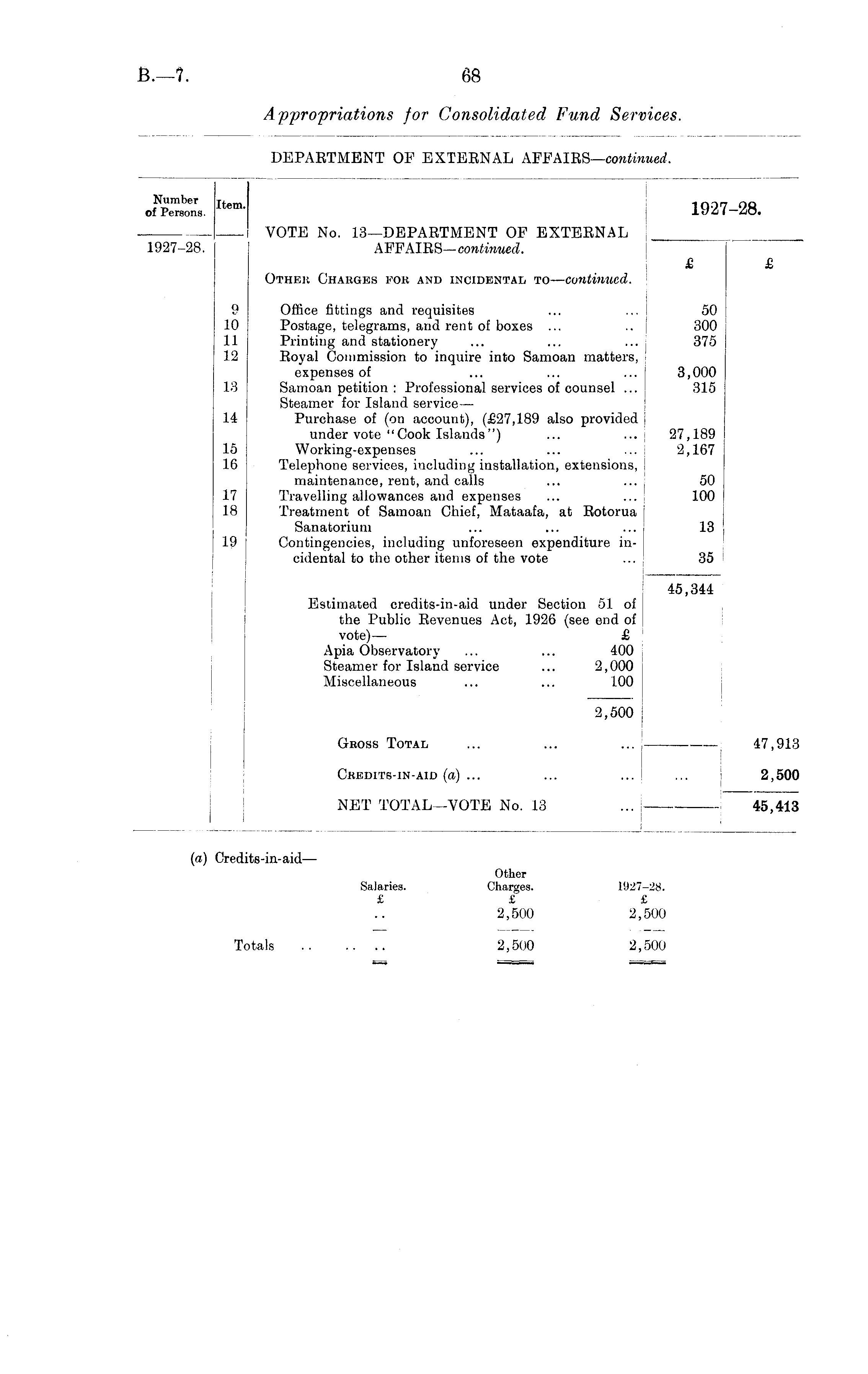 of Persons. [ Item j 1927-28. VOTE No. 13—DEPARTMENT OP EXTERNAL j 1927-28. AFFAIRS— continued. I £ £ Othek Charges for and incidental to—continued. 9 Office fittings and requisites ... ... : 50 10 Postage, telegrams, and rent of boxes ... .. 300 11 Printing and stationery ... ... ... 375 12 Royal Commission to inquire into Samoan matters, ' expenses of ... ... ... 3,000 13 Samoan petition : Professional services of counsel ... 315 Steamer for Island service— 14 Purchase of (on account), (£27,189 also provided J under vote "Cook Islands") ... ... I 27,189 15 Working-expenses ... ... ... i 2,167 16 Telephone services, including installation, extensions, maintenance, rent, and calls ... ... 50 17 Travelling allowances and expenses ... ... 100 18 Treatment of Samoan Chief, Mataafa, at Rotorua Sanatorium ... ... ... 13 ' 19 j Contingencies, including unforeseen expenditure incidental to the other items of the vote ... 35 45,344 Estimated credits-in-aid under Section 51 of the Public Revenues Act, 1926 (see end of vote) — £ Apia Observatory ... ... 400 Steamer for Island service ... 2,000 Miscellaneous ... ... 100 2,500 GROSS Total ... ... ... — 47,913 Credits-in-aid (a) ... ... ... ... 2,500 NET TOTAL—VOTE No. 13 ... 45,413