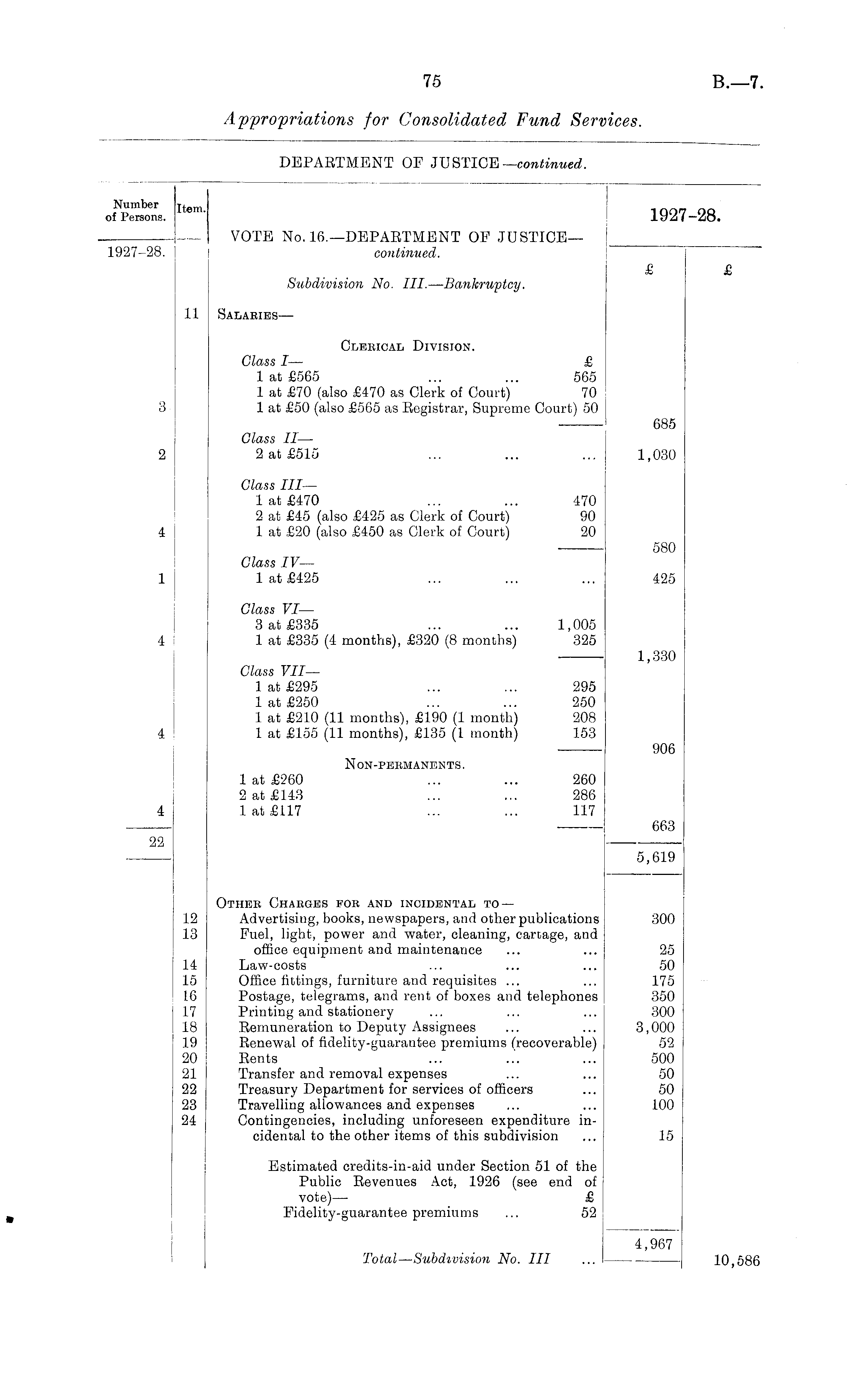 Number T f . m of Persons. 1927—28. VOTE No. 16.—DEPARTMENT OF JUSTICE— 1927-28. continued. £ £ Subdivision No. III.—Bankruptcy. 11 Salaries— Clerical Division. Glass I— £ 1 at £565 ... ... 565 1 at £70 (also £470 as Clerk of Court) 70 3 1 at £50 (also £565 as Registrar, Supreme Court) 50 685 Glass II— 2 I 2 at £515 ... ... ... 1,030 Glass III— 1 at £470 ... ... 470 2 at £45 (also £425 as Clerk of Court) 90 4 1 at £20 (also £450 as Clerk of Court) 20 • 580 Glass IV— 1 1 at £425 ... ... ... 425 Glass 71— 3 at £335 ... ... 1,005 4 1 1 at £335 (4 months), £320 (8 months) 325 1,330 Class VII— 1 at £295 ... ... 295 1 at £250 ... ... 250 1 at £210 (11 months), £190 (1 month) 208 4 | 1 at £155 (11 months), £135 (1 month) 153 • 906 N ON-PERMANEN TS. 1 at £260 ... ... 260 2 at £143 ... ... 286 4 1 at £117 ... ... 117 663 22 5,619 Other Charges for and incidental to — 12 Advertising, books, newspapers, and other publications 300 13 Fuel, light, power and water, cleaning, cartage, and office equipment and maintenance ... ... 25 14 Law-costs ... ... ... 50 15 Office fittings, furniture and requisites ... ... 175 16 Postage, telegrams, and rent of boxes and telephones 350 I 17 Printing and stationery ... ... ... 300 | 18 Remuneration to Deputy Assignees ... ... 3,000 19 Renewal of fidelity-guarantee premiums (recoverable) 52 20 Rents ... ... ... 500 21 Transfer and removal expenses ... ... 50 22 Treasury Department for services of officers ... 50 23 Travelling allowances and expenses ... ... 100 24 Contingencies, including unforeseen expenditure incidental to the other items of this subdivision ... 15 Estimated credits-in-aid under Section 51 of the Public Revenues Act, 1926 (see end of vote) — £ Fidelity-guarantee premiums ... 52 4,967 Total —Subdivision No. Ill ... 10,586