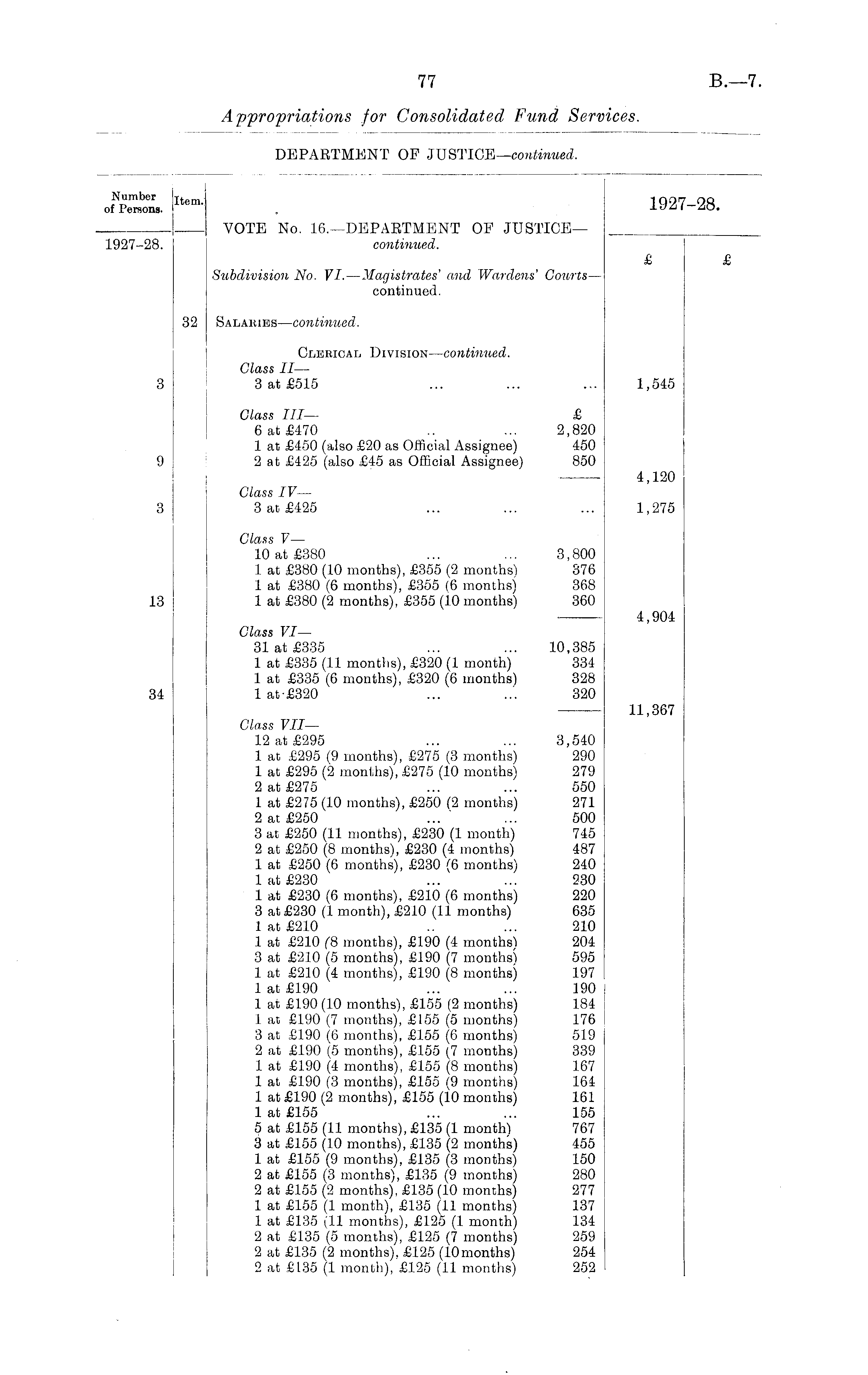 ofPerrons. . 1927-28. VOTE No. 16.—DEPARTMENT OF JUSTICE— 1927-28. continued. £ £ Subdivision No. VI. —Magistrates' and Wardens' Courts — continued. 32 Salaries—continued. Clerical Division —continued. Glass II— 3 3 at £515 ... ... ... 1,545 Glass III— £ 6 at £470 .. ... 2,820 1 at £450 (also £20 as Official Assignee) 450 9 1 2 at £425 (also £45 as Official Assignee) 850 4,120 Class IV— 3 3 at. £425 ... ... ... 1,275 Class V— 10 at £380 ... ... 3,800 1 at £380 (10 months), £355 (2 months) 376 1 at £380 (6 months), £355 (6 months) 368 13 1 at £380 (2 months), £355 (10 months) 360 4,904 Class VI— 31 at £335 ... ... 10,385 1 at £335 (11 months), £320 (1 month) 334 1 at £335 (6 months), £320 (6 months) 328 34 1 at-£320 ... 320 11,367 Class VII— 12 at £295 ... ... 3,540 1 at £295 (9 months), £275 (3 months) 290 1 at £295 (2 months), £275 (10 months) 279 2 at £275 ... ... 550 1 at £275 (10 months), £250 (2 months) 271 2 at £250 ... ' ... 500 3 at £250 (11 months), £230 (1 month) 745 2 at £250 (8 months), £230 (4 months) 487 1 at £250 (6 months), £230 (6 months) 240 1 at £230 ... ... 230 1 at £230 (6 months), £210 (6 months) 220 3 at £230 (1 month), £210 (11 months) 635 1 at £210 .. ... 210 1 at £210 (8 months), £190 (4 months) 204 3 at £210 (5 months), £190 (7 months) 595 1 at £210 (4 months), £190 (8 months) 197 1 at £190 ... ... 190 1 at £190 (10 months), £155 (2 months) 184 1 at £190 (7 months), £155 (5 months) 176 3 at £190 (6 months), £155 (6 months) 519 2 at £190 (5 months), £155 (7 months) 339 1 at £190 (4 months), £155 (8 months) 167 1 at £190 (3 months), £155 (9 months) 164 1 at £190 (2 months), £155 (10 months) 161 1 at £155 ... ... 155 5 at £155 (11 months), £135 (1 month) 767 at £155 (10 months), £135 (2 months) 455 1 at £155 (9 months), £135 (3 months) 150 2 at £155 (3 months), £135 (9 months) 280 2 at £155 (2 months), £135 (10 months) 277 1 at £155 (1 month), £135 (11 months) 137 1 at £135 (11 months), £125 (1 month) 134 2 at £135 (5 months), £125 (7 months) 259 2 at £135 (2 months), £125 (lOmonths) 254 2 at £135 (1 month), £125 (11 months) 252
