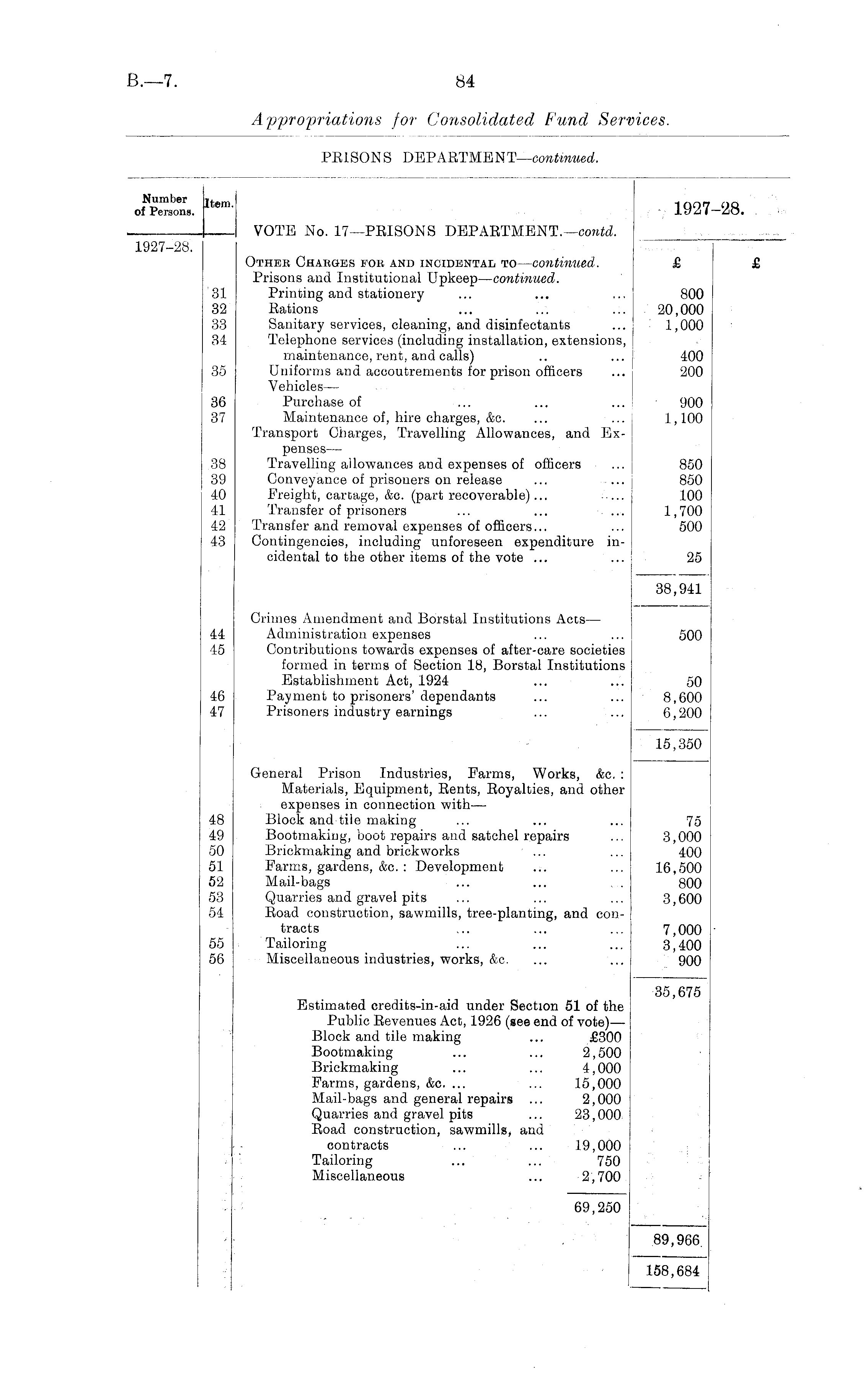 ofCons. Item - 1927-28. VOTE No. 17—PRISONS DEPARTMENT.—contd. 1927-28. Other Charges for and incidental to —continued. £ £ Prisons and Institutional Upkeep—continued. 31 Printing and stationery ... ... ... 800 32 Rations ... ... ... 20,000 33 Sanitary services, cleaning, and disinfectants ... 1,000 34- Telephone services (including installation, extensions, maintenance, rent, and calls) .. ... 400 35 Uniforms and accoutrements for prison officers ... 200 Vehicles— 36 Purchase of ... ... ... 900 37 Maintenance of, hire charges, &c. ... ... 1,100 Transport Charges, Travelling Allowances, and Expenses— 38 Travelling allowances and expenses of officers ... 850 39 Conveyance of prisoners on release ... ... 850 40 Freight, cartage, &c. (part recoverable)... ... 100 41 Transfer of prisoners ... ... ... 1,700 42 Transfer and removal expenses of officers... ... 500 43 Contingencies, including unforeseen expenditure incidental to the other items of the vote ... ... 25 38,941 Crimes Amendment and Borstal Institutions Accs — 44 Administration expenses ... ... 500 45 Contributions towards expenses of after-care societies formed in terms of Section 18, Borstal Institutions Establishment Act, 1924 ... ... 50 46 Payment to prisoners'dependants ... ... 8,600 47 Prisoners industry earnings ... ... 6,200 15,350 General Prison Industries, Farms, Works, &c. : Materials, Equipment, Rents, Royalties, and other expenses in connection with— 48 Block and tile making ... ... ... 75 49 Bootmaking, boot repairs and satchel repairs ... 3,000 50 Brickmaking and brickworks ... ... 400 51 Farms, gardens, &c. : Development ... ... 16,500 52 Mail-bags ... ... . 800 53 Quarries and gravel pits ... ... ... 3,600 54 Road construction, sawmills, tree-planting, and contracts ... ... ... 7,000 ' 55 Tailoring ... ... ... 3,400 56 Miscellaneous industries, works, &c. ... ... 900 35,675 Estimated credits-in-aid under Section 51 of the Public Revenues Act, 1926 (see end of vote) — Block and tile making ... £300 Bootmaking ... ... 2,500 Brickmaking ... ... 4,000 Farms, gardens, &c. ... ... 15,000 Mail-bags and general repairs ... 2,000 Quarries and gravel pits ... 23,000 Road construction, sawmills, and contracts ... ... 19,000 Tailoring ... ... 750 Miscellaneous ... 2,700 69,250 89,966. 158,684 —