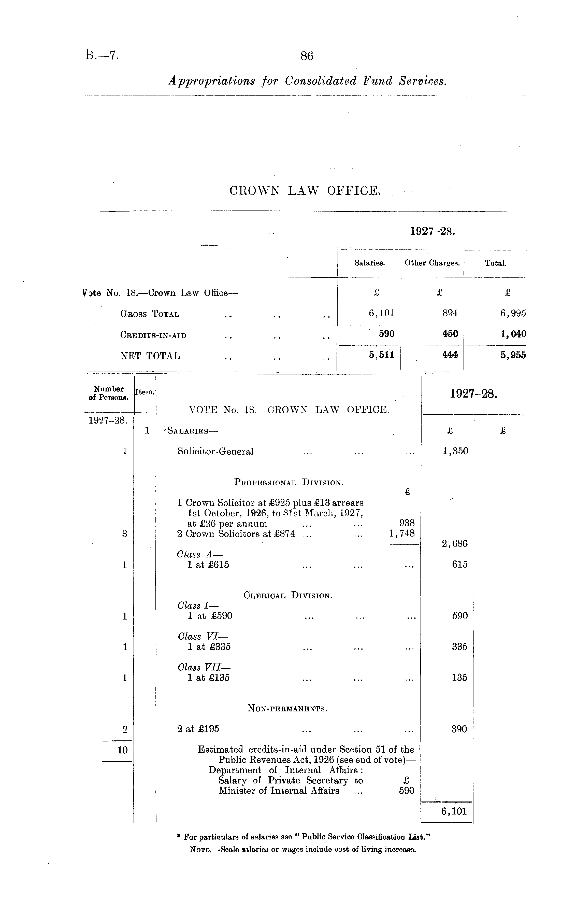 1927-28. Salaries. | Other Charges. ! Total. ■ I ' . j Vote No. 18. —Crown Law Office— t £ £ GROSS Total .. .. .. 6,101 894 6,995 CBEDITS-in-AID .. .. .. 590 450 1,040 NET TOTAL .. .. .. 5,511 444 5,955 Jf£L 1927-28. VOTE No. 18.—CROWN LAW OFFICE. 1927-28. 1 "Salaries— £ £ 1 Solicitor-General ... ... 1,350 PllOFESSIONAL DIVISION. £ 1 Crown Solicitor at £925 plus £13 arrears 1st October, 1926, to 31st March, 1927, at £26 per annum ... ... 938 3 2 Crown Solicitors at £874 ... ... 1,748 2,686 Glass A— 1 1 at £615 ... ... ... 615 Clerical Division. Class I— 1 1 at £590 ... ... ... 590 Class VI— 1 1 at £335 ... ... ... 335 Class VII— 1 1 at £135 ... ... ... 135 Non-permanents. 2 2 at £195 ... ... ... 390 10 Estimated credits-in-aid under Section 51 of the j Public Revenues Act, 1926 (see end of vote) — Department of Internal Affairs: Salary of Private Secretary to £ Minister of Internal Affairs ... 590 6,101 * For particulars of salaries see " Public Servioe Classification List." Note. —-Scale salaries or wages include cost-of-living increase.