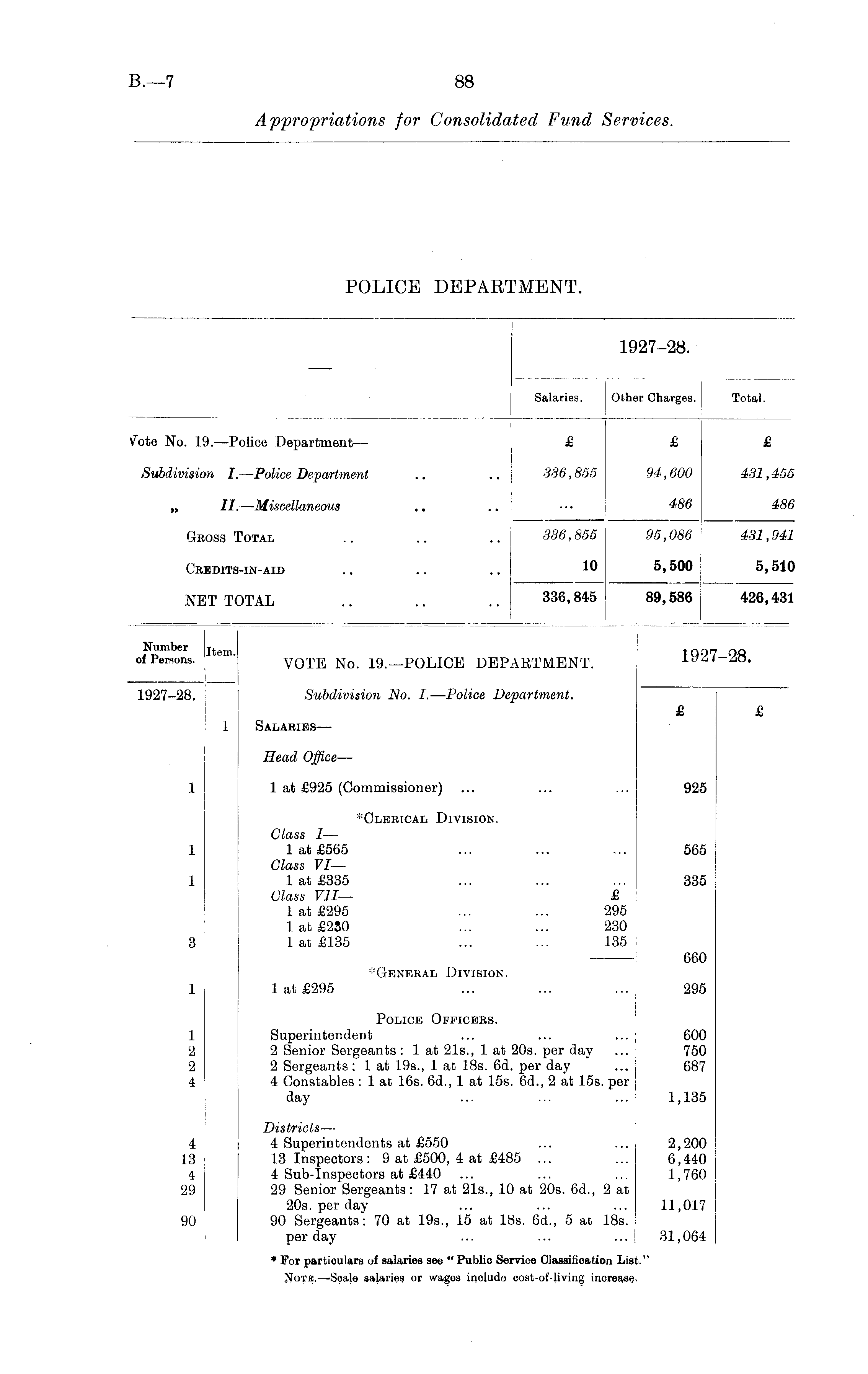 1927-28. Salaries. J Other Charges. ! Total. No. 19.—Police Department— £ £ £ Subdivision I. —Police Department .. .. 336,855 94,600 431,455 „ II. —•Miscellaneous .. .. ■■■ 486 486 GROSS TOTAL .. .. .. 336,855 95,086 431,941 Credits-IN-AID .. .. .. 10 5,500 5,510 NET TOTAL .. .. .. 336,845 89,586 426,431 i Number item. 1Q97 OQ of Persons. VOTE No. 19.—POLICE DEPARTMENT. LV&i-M. 1927-28. Subdivision No. I.—Police Department. £ £ 1 Salaries— Head Office — 1 1 at £925 (Commissioner) ... ... ... 925 *Clerical Division. Class I— 1 1 at £565 ... ... ... 565 Glass VI— 1 1 at £335 ... ... ... 335 Class VII— £ 1 at £295 ... ... 295 1 at £230 ... ... 230 3 1 at £135 ... ... 135 — 660 Division. 1 1 at £295 ... ... ... 295 Police Officers. 1 Superintendent ... ... ... 600 2 2 Senior Sergeants : 1 at 21s., 1 at 20s. per day ... 750 2 2 Sergeants: 1 at 19s., 1 at 18s. 6d. per day ... 687 4 j 4 Constables : 1 at 16s. 6d., 1 at 15s. 6d., 2 at 15s. per day ... ... ... 1,135 Districts — 4 I 4 Superintendents at £550 ... ... 2,200 13 13 Inspectors: 9 at £500, 4 at £485 ... ... 6,440 4 4 Sub-Inspectors at £440 ... ... ... 1,760 29 29 Senior Sergeants: 17 at 21s., 10 at 20s. 6d., 2 at 20s. per day ... ... ... 11,017 90 90 Sergeants: 70 at 19s., 15 at 18s. 6d., 5 at 18s. per day ... ... ... 31,064 * For particulars of salaries see " Public Service Classification List." Note. —Scale salaries or wages inolude cost-of-living increase.