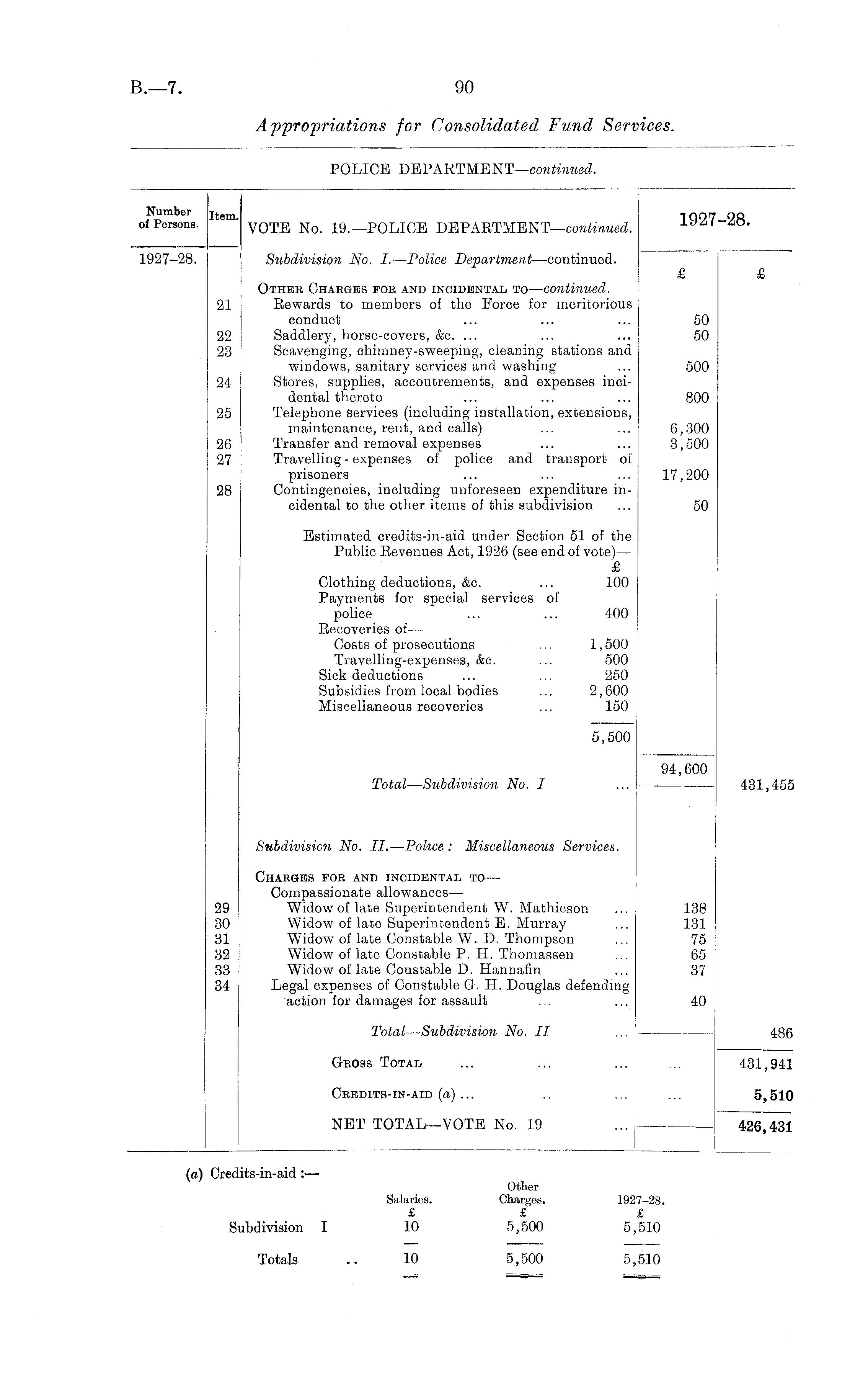 (a) Credits-in-aid: — Other Salaries. Charges. 1927-28. £ £ £ Subdivision I 10 5,500 5,510 Totals .. 10 5,500 5,510