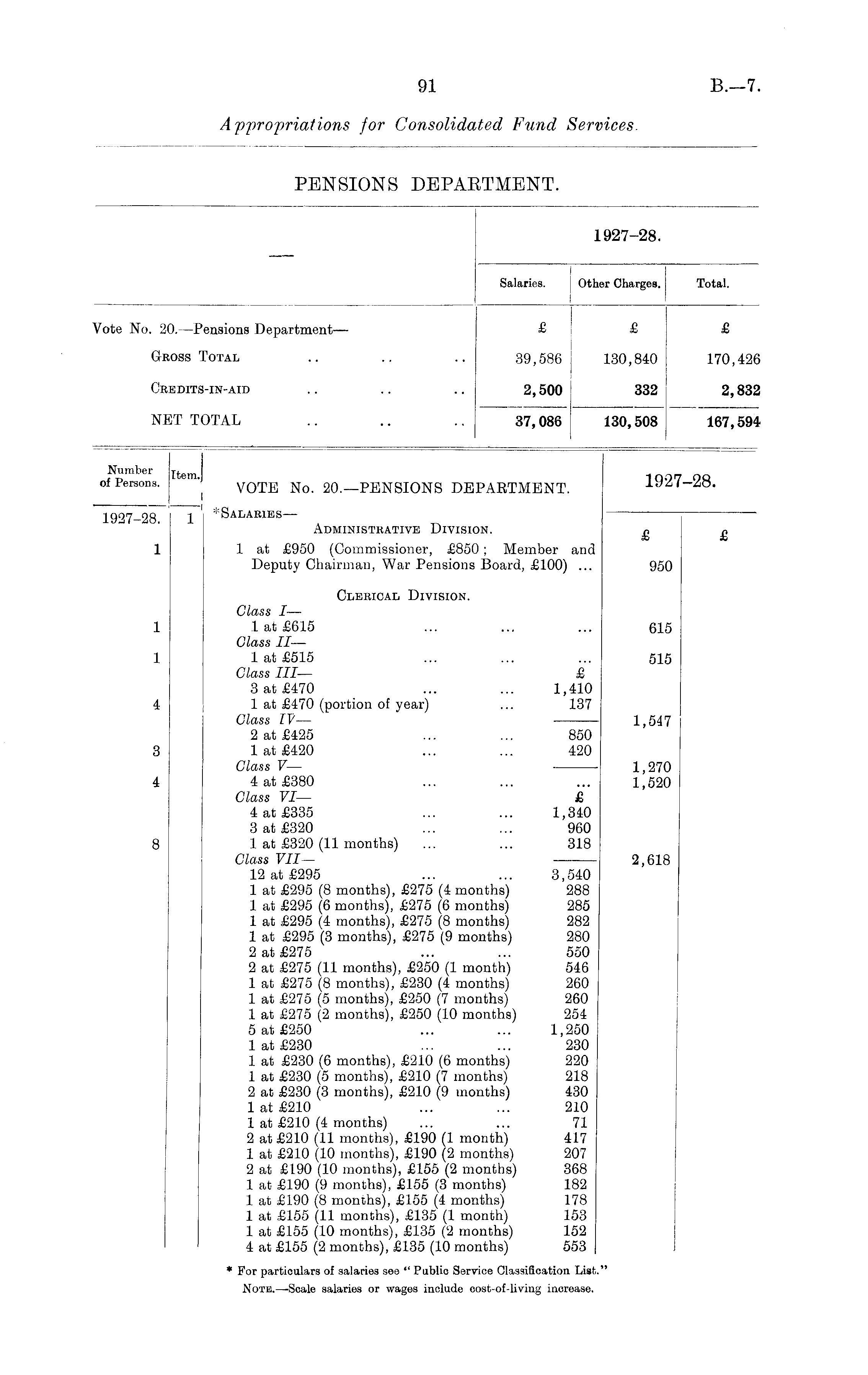 1927-28. I ' —— Salaries. | Other Charges. Total. Vote No. 20. —Pensions Department— £ £ £ GROSS Total .. .. .. 39,586 130,840 170,426 Credits-IN-AID .. .. .. 2,500 332 2,832 NET TOTAL .. .. .. 37,086 130,508 167,594 of Persons. VOTE No. 20.—PENSIONS DEPARTMENT. 1927-28. 1927—28 1 ' ''Salaries — - Administrative Division. 1 1 at £950 (Commissioner, £850; Member and Deputy Chairman, War Pensions Board, £100) ... 950 Clerical Division. Class I— 1 1 at £615 ... ... ... 615 Glass II— 1 1 at £515 ... ... ... 515 Class III— £ 3 at £470 ... ... 1,410 4 1 at £470 (portion of year) ... 137 Class IV— 1,547 2 at £425 ... ... 850 3 1 at £420 ... ... 420 Class V— -——- 1,270 4 4 at £380 ... ... ... 1,520 Class VI— £ 4 at £335 ... ... 1,340 3 at £320 ... ... 960 8 1 at £320 (11 months) ... ... 318 Class VII— 2,618 12 at £295 ... ... 3,540 1 at £295 (8 months), £275 (4 months) 288 1 at £295 (6 months), £275 (6 months) 285 1 at £295 (4 months), £275 (8 months) 282 1 at £295 (3 months), £275 (9 months) 280 2 at £275 ... ... 550 2 at £275 (11 months), £250 (1 month) 546 1 at £275 (8 months), £230 (4 months) 260 1 at £275 (5 months), £250 (7 months) 260 1 at £275 (2 months), £250 (10 months) 254 5 at £250 ... ... 1,250 1 at £230 ... ... 230 1 at £230 (6 months), £210 (6 months) 220 1 at £230 (5 months), £210 (7 months) 218 2 at £230 (3 months), £210 (9 months) 430 1 at £210 ... ... 210 1 at £210 (4 months) ... ... 71 2 at £210 (11 months), £190 (1 month) 417 1 at £210 (10 months), £190 (2 months) 207 2 at £190 (10 months), £155 (2 months) 368 1 at £190 (9 months), £155 (3 months) 182 1 at £190 (8 months), £155 (4 months) 178 1 at £155 (11 months), £135 (1 month) 153 1 at £155 (10 months), £135 (2 months) 152 4 at £155 (2 months), £135 (10 months) 553 * For particulars of salaries see " Public Service Classification List." Note.—'Scale salaries or wages include cost-of-living increase.