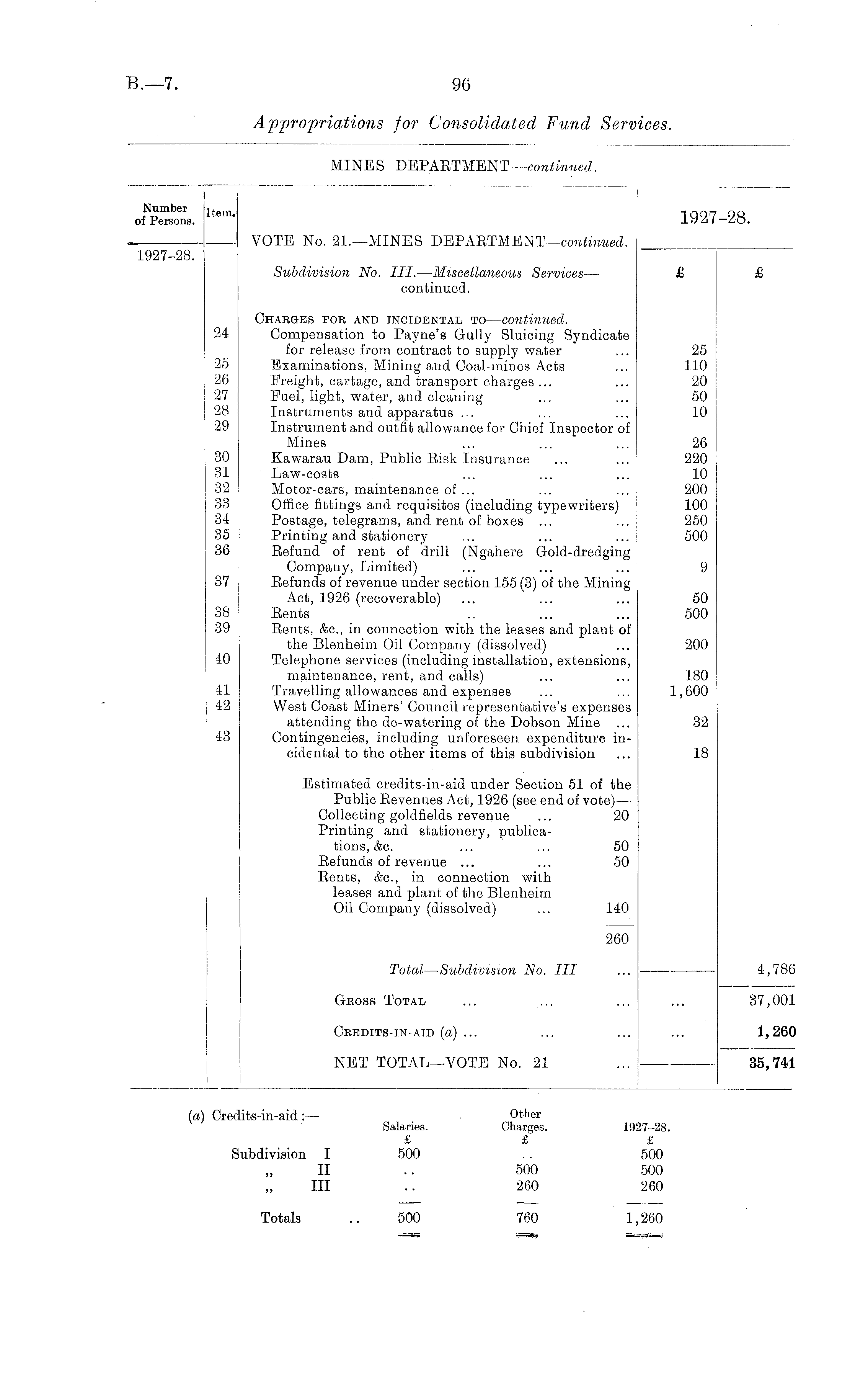(a) Credits-in-aid : — Other Salaries. Charges. 1927-28. £ £ £ Subdivision I 500 .. 500 II .. 500 500 111 .. 260 260 Totals .. 500 760 1,260