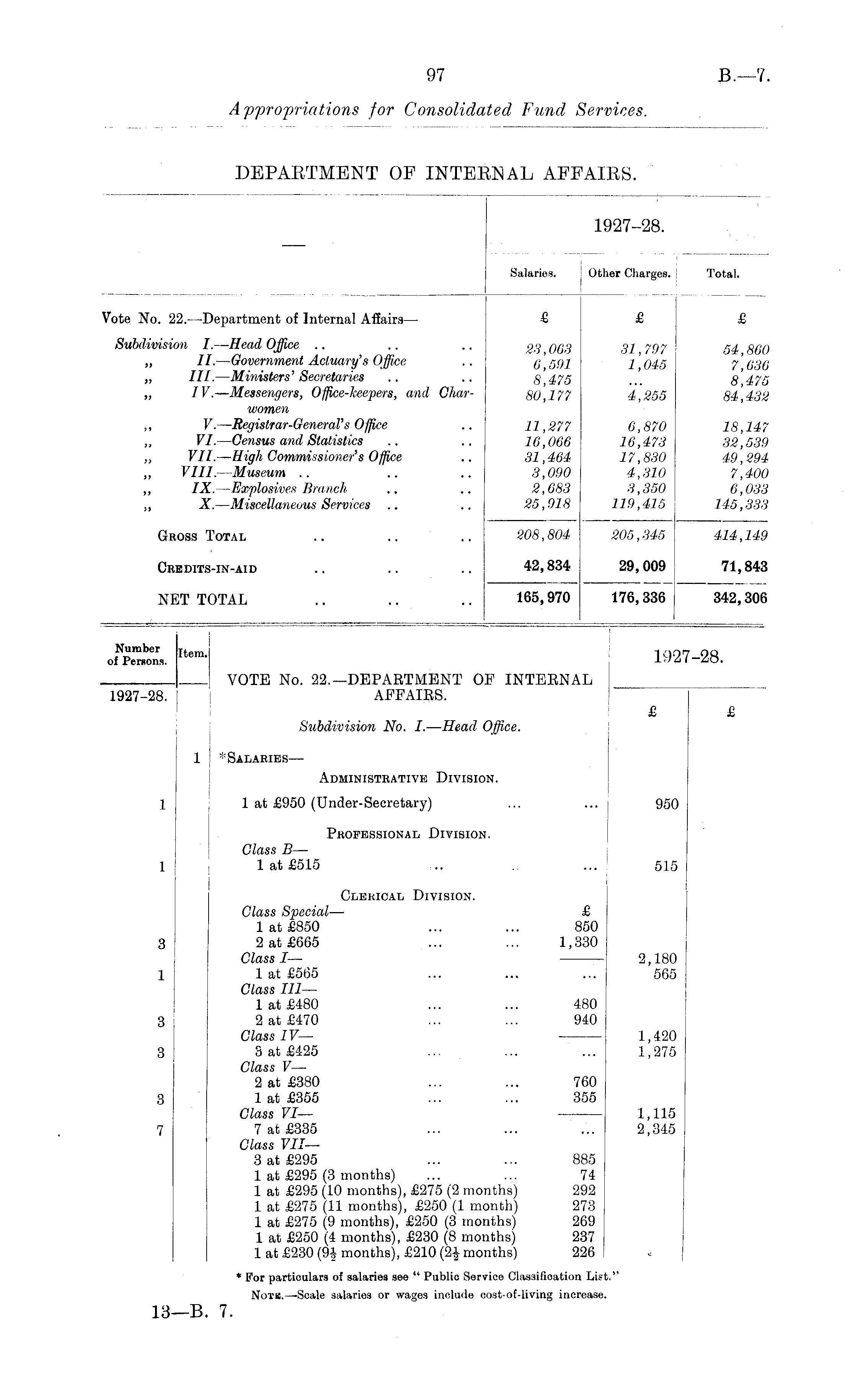 1927-28. Salaries. j Other Charges. | Total. Vote No. 22. —Department of Internal Affairs— £ £ £ Subdivision I.—Head Office .. .. .. 23 063 31 797 54 860 „ II.—Government Actuary's Office .. g 591 1 045 7'636 „ III. —Ministers'Secretaries .. .. 8 475 ... 8 475 „ IV.—Messengers, Office-keepers, and Char- 80,177 4,255 84 432 women V.—Registrar-General's Office .. 11,277 6,870 18,147 „ VI. —Census and Statistics .. .. 16,066 1 6,473 32,539 ,, VII.—High Commissioner's Office .. 31,464 17,830 49,294 „ VIII.—Museum .. .. .. 3,090 4,310 7,400 ,, IX. —Explosives Branch .. .. 2,683 3,350 6,033 ,, X.—Miscellaneous Services .. .. 25,918 119,415 145,333 GROSS Total .. .. .. 208,804 205,345 414,149 Credits-IN-AID .. .. .. 42,834 29,009 71,843 NET TOTAL .. .. .. 165,970 176,336 342,306 . of N p~. Item - 1927-28. VOTE No. 22.—DEPARTMENT OF INTERNAL 1927-28. AFFAIRS. £ £ | Subdivision No. I.—Head Office. 1 * Salaries — Administrative Division. 1 1 at £950 (Under-Secretary) ... ... 950 Professional Division. Class B — 1 1 at £515 .. . ... 515 Clerical Division. Class Special— £ 1 at £850 ... ... 850 3 2 at £665 ... ... 1,330 Class I— 2,180 1 1 at £565 ... ... ... 565 Class III— 1 at £480 ... ... 480 3 2 at £470 ... ... 940 Class IV — 1,420 3 3 at £425 ... ... ... 1,275 Class V — 2 at £380 ... ... 760 3 1 at £355 ... ... 355 Class VI— 1,115 7 7 at £335 ... ... ... 2,345 Class VII— 3 at £295 ... ... 885 1 at £295 (3 months) ... ... 74 1 at £295 (10 months), £275 (2 months) 292 1 at £275 (11 months), £250 (1 month) 273 1 at £275 (9 months), £250 (3 months) 269 1 at £250 (4 months), £230 (8 months) 237 1 at £230 (94 months), £210 (2J months) 226 I * For particulars of salaries see " Public Service Classification List." salaries or wages include cost-of-living increase.