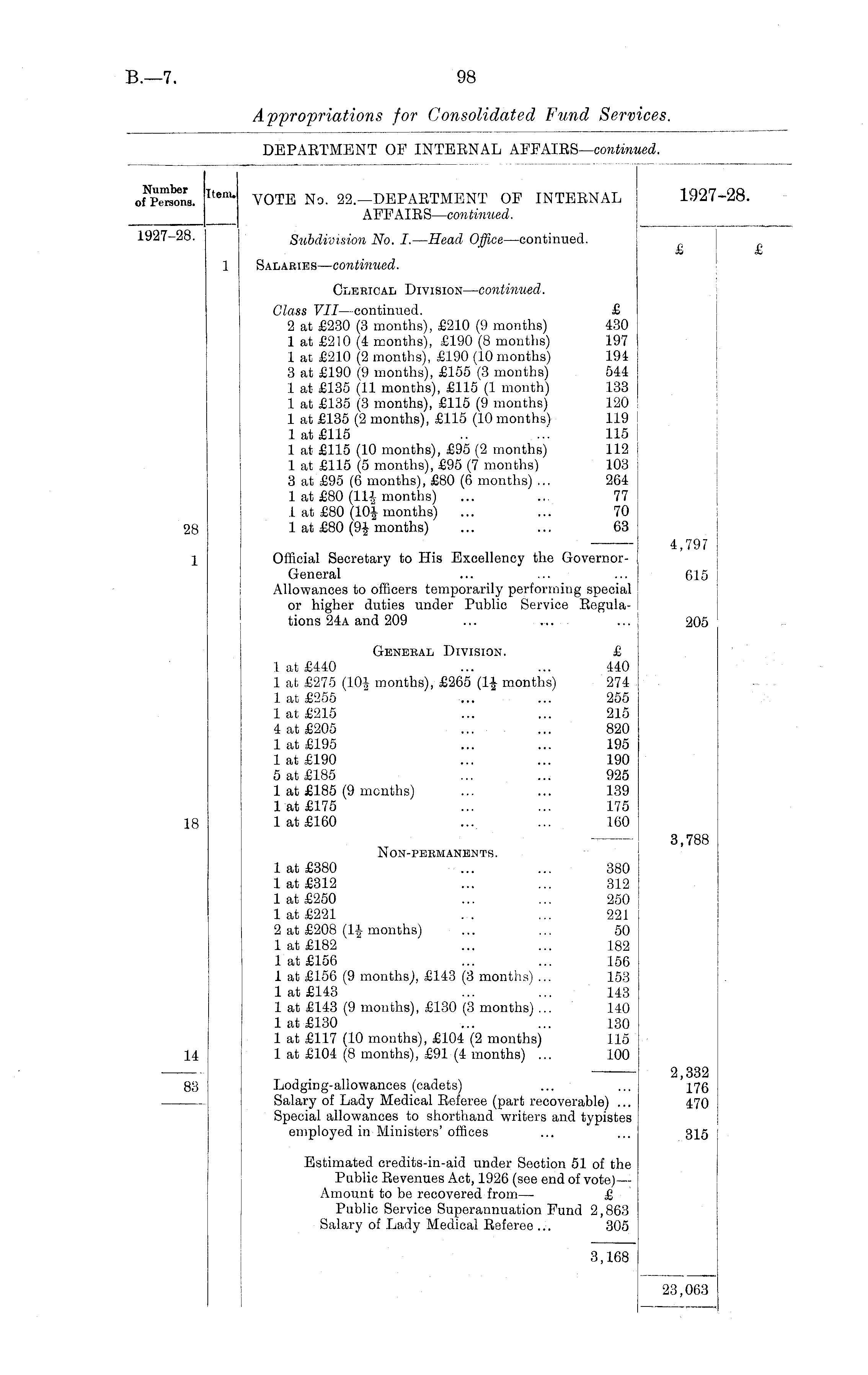 Ttem * VOTE No. 22.—DEPARTMENT OF INTERNAL 1927-28. AFFAIRS —continued. 1927-28. Subdivision No. I.—Head Office —continued. Jb 1 Salaries —continued. Clerical Division —continued. Class VII—continued. £ 2 at £230 (3 months), £210 (9 months) 430 1 at £210 (4 months), £190 (8 months) 197 1 at £210 (2 months), £190 (10 months) 194 3 at £190 (9 months), £155 (3 months) 544 1 at £135 (11 months), £115 (1 month) 133 1 at £135 (3 months), £115 (9 months) 120 1 at £135 (2 months), £115 (10 months) 119 1 at £115 .. 115 1 at £115 (10 months), £95 (2 months) 112 1 at £115 (5 months), £95 (7 months) 103 3 at £95 (6 months), £80 (6 months) ... 264 1 at £80 months) ... ... 77 1 at £80 (10| months) ... ... 70 28 1 at £80 (9J months) ... ... 63 4,797 1 Official Secretary to His Excellency the GovernorGeneral ... ... ... 615 Allowances to officers temporarily performing special or higher duties under Public Service Regulations 24a and 209 ... .... ... 205 General Division. £ 1 at £440 ... ... 440 1 at £275 (10i months), £265 (1£ months) 274 1 at £255 " ... ... 255 1 at £215 ... ... 215 4 at £205 ... ... 820 1 at £195 ... ... 195 1 at £190 ... ... 190 5 at £185 ... ... 925 1 at £185 (9 months) ... ... 139 1 at £175 ... ... 175 18 1 at £160 ... ... 160 3,788 Non-permanents. 1 at £380 ... ... 380 1 at £312 ... ... 312 1 at £250 ... ... 250 1 at £221 .. ... 221 2 at £208 (1-| months) ... ... 50 1 at £182 ... ... 182 1 at £156 ... ... 156 1 at £156 (9 months), £143 (3 months) ... 153 1 at £143 ... ... 143 1 at £143 (9 months), £130 (3 months) ... 140 1 at £130 ... ... 130 1 at £117 (10 months), £104 (2 months) 115 14 1 at £104 (8 months), £91 (4 months) ... 100 2,332 83 Lodging-allowances (cadets) ... ... 176 —-— Salary of Lady Medical Referee (part recoverable) ... 470 Special allowances to shorthand writers and typistes employed in Ministers'offices ... ... 315 Estimated credits-in-aid under Section 51 of the Public Revenues Act, 1926 (see end of vote) — Amount to be recovered from—• £ Public Service Superannuation Fund 2,863 Salary of Lady Medical Referee ... 305 3,168 23,063
