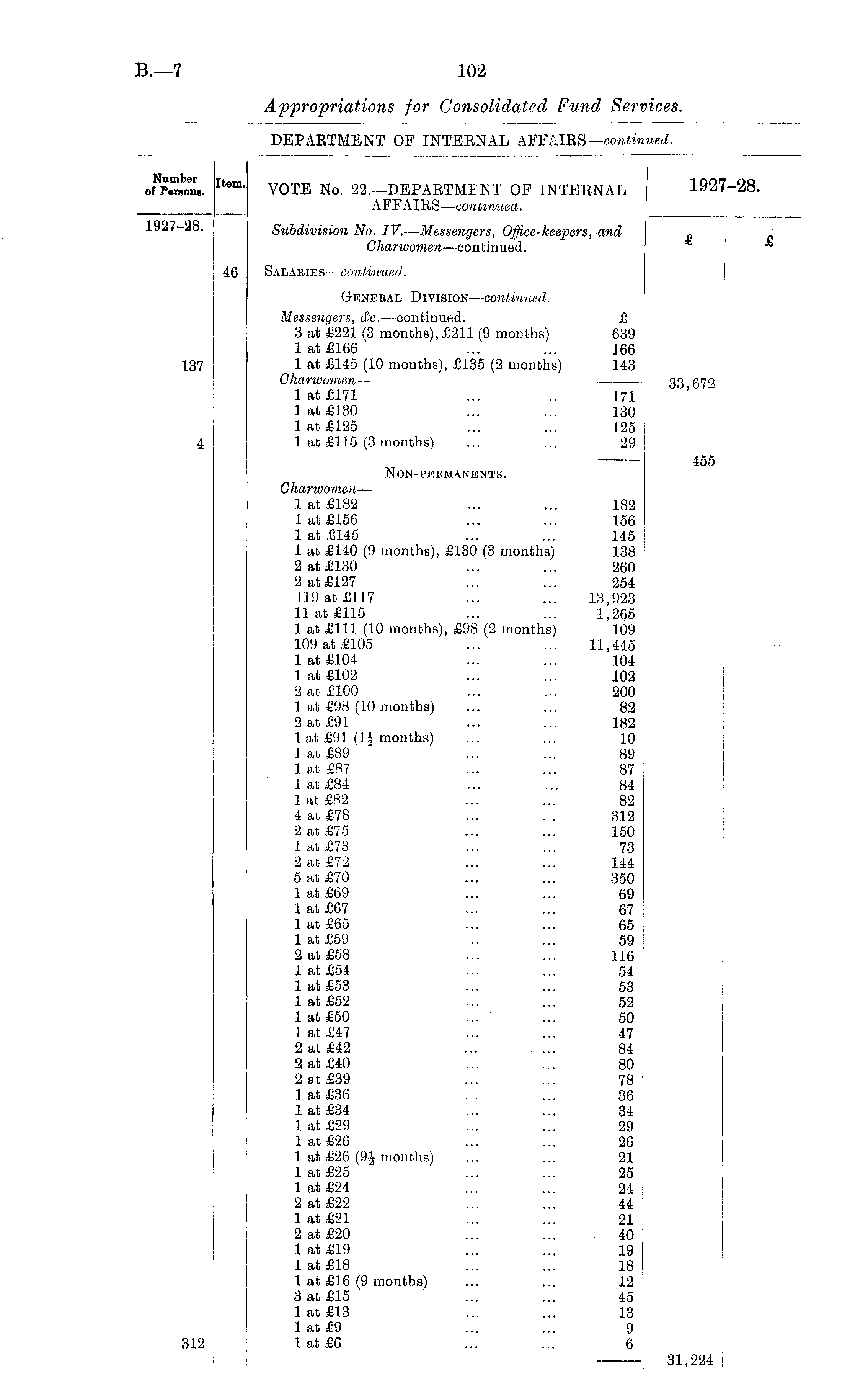 , _ - — I Item - VOTE No. 22.—DEPARTMENT OF INTERNAL 1927-28. AFFAIRS—continued. 1927-28. Subdivision No. IV.—Messengers, Office-keepers, and „ ! . Charwomen—continued. * 46 Salaries—continued. General Division—-continued. Messengers, <£c.—continued. £ 3 at £221 (3 months), £211 (9 months) 639 1 at £166 ... ... 166 137 1 at £145 (10 months), £135 (2 months) 143 Charwomen— 1 33 572 1 at £171 ... ... 171 1 at £130 ... ... 130 1 at £125 ... ... 125 4 1 at £115 (3 months) ... ... 29 455 Non-permanents. Gharivomen— 1 at £182 ... ... 182 1 at £156 ... ... 156 1 at £145 ... ... 145 1 at £140 (9 months), £130 (3 months) 138 2 at £130 ... ... 260 2 at £127 ... ... 254 119 at £117 ... ... 13,923 11 at £115 ... ... 1,265 1 at £111 (10 months), £98 (2 months) 109 109 at £105 ... ... 11,445 1 at £104 ... ... 104 1 at £102 ... ... 102 2 at £100 ... ... 200 1 at £98 (10 months) ... ... 82 2 at £91 ... ... 182 1 at £91 (1^-months) ... ... 10 1 at £89 " ... ... 89 1 at £87 ... ... 87 1 at £84 ... ... 84 1 at £82 ... ... 82 4 at £78 ... .. 312 2 at £75 ... ... 150 1 at £73 ... ... 73 2 at £72 .... ... 144 5 at £70 ... ... 350 1 at £69 ... ... 69 1 at £67 ... ... 67 1 at £65 ... ... 65 1 at £59 ... ... 59 2 at £58 ... ... 116 1 at £54 ... ... 54 1 at £53 ... ... 53 1 at £52 ... ... 52 1 at £50 ... ... 50 1 at £47 ... ... 47 2 at £42 ... ... 84 2 at £40 ... ... 80 2 at £39 ... ... 78 1 at £36 ... ... 36 1 at £34 ... ... 34 1 at £29 ... ... 29 1 at £26 ... ... 26 1 at £26 (9-J- months) ... ... 21 1 at £25 ... ... 25 1 at £24 ... ... 24 2 at £22 ... ... 44 1 at £21 ... ... 21 2 at £20 ... ... 40 1 at £19 ... ... 19 1 at £18 ... ... 18 1 at £16 (9 months) ... ... 12 3 at £15 ... ... 45 1 at £13 ... ... 13 1 at £9 ... ... 9 312 1 at £6 ... ... 6 31,224
