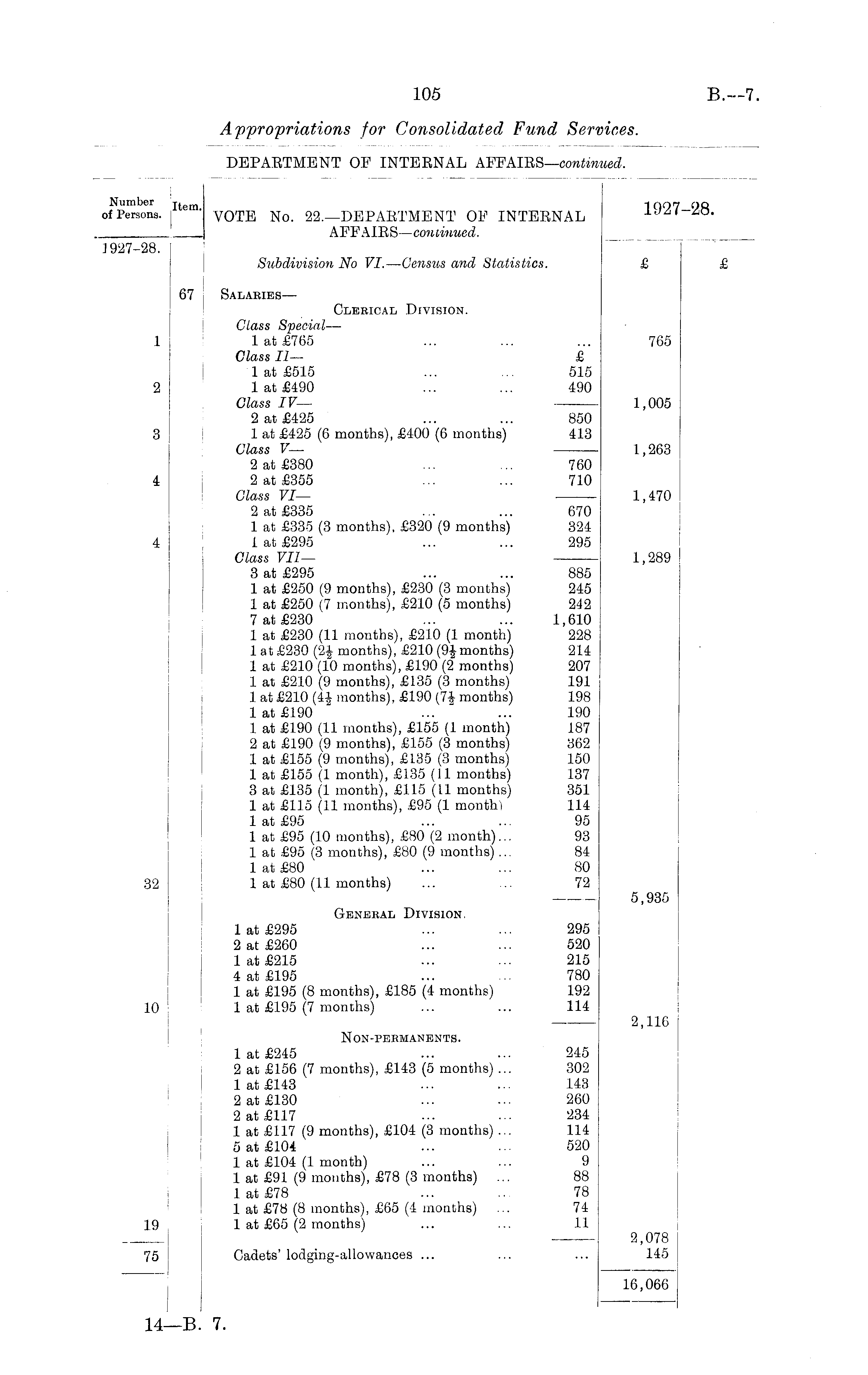 j Number jtem. 1097 99, of Persons, i VOTE No. 22.—DEPARTMENT OF INTERNAL AFFAIRS—continued. ] 927-28. Subdivision No VI.—Census and Statistics. £ £ 67 Salabies— Clerical Division. Glass Special— 1 1 at £765 ... ... ... 765 Class II— £ 1 at £515 ... ... 515 2 1 at £490 ... ... 490 Class IV — 1,005 2 at £425 ... ... 850 3 | 1 at £425 (6 months), £400 (6 months) 413 Class V— 1,263 2 at £380 ... ... 760 4 2 at £355 ... ... 710 Glass VI—• — 1,470 2 at £335 . .. ... 670 1 at £335 (3 months), £320 (9 months) 324 4 1 at £295 ... ... 295 Class VII— 1,289 3 at £295 ... ... 885 1 at £250 (9 months), £230 (3 months) 245 1 at £250 (7 months), £210 (5 months) 242 7 at £230 ... ... 1,610 1 at £230 (11 months), £210 (1 month) 228 1 at £230 (2-J months), £210 (9J months) 214 1 at £210 (10 months), £190 (2 months) 207 1 at £210 (9 months), £135 (3 months) 191 1 at £210 (4-J months), £190 (7i months) 198 1 at £190 ... " ... 190 1 at £190 (11 months), £155 (1 month) 187 2 at £190 (9 months), £155 (3 months) 362 1 at £155 (9 months), £135 (3 months) 150 1 at £155 (1 month), £135 (11 months) 137 3 at £135 (1 month), £115 (11 months) 351 1 at £115 (11 months), £95 (1 month) 114 1 at £95 ... ... 95 1 at £95 (10 months), £80 (2 month)... 93 1 at £95 (3 months), £80 (9 months)... 84 1 at £80 ... ... 80 32 | 1 at £80 (11 months) ... ... 72 5,935 General Division, 1 at £295 ... ... 295 2 at £260 ... ... 520 1 at £215 ... ... 215 4 at £195 ... ... 780 1 at £195 (8 months), £185 (4 months) 192 10 ' 1 at £195 (7 months) ... ... 114 —— 2,116 Non-permanents. 1 at £245 ... ... 245 2 at £156 (7 months), £143 (5 months)... 302 1 at £143 ... ... 143 2 at £130 ... ... 260 2 at £117 ... ... 234 1 at £117 (9 months), £104 (3 months)... 114 5 at £104 ... ... 520 1 at £104 (1 month) ... ... 9 1 at £91 (9 months), £78 (3 months) ... 88 1 at £78 ... .. 78 1 at £78 (8 months), £65 (4 months) ... 74 19 : 1 at £65 (2 months) ... ... 11 2,078 75 Cadets' lodging-allowances ... ... ... 145 16,066 I —