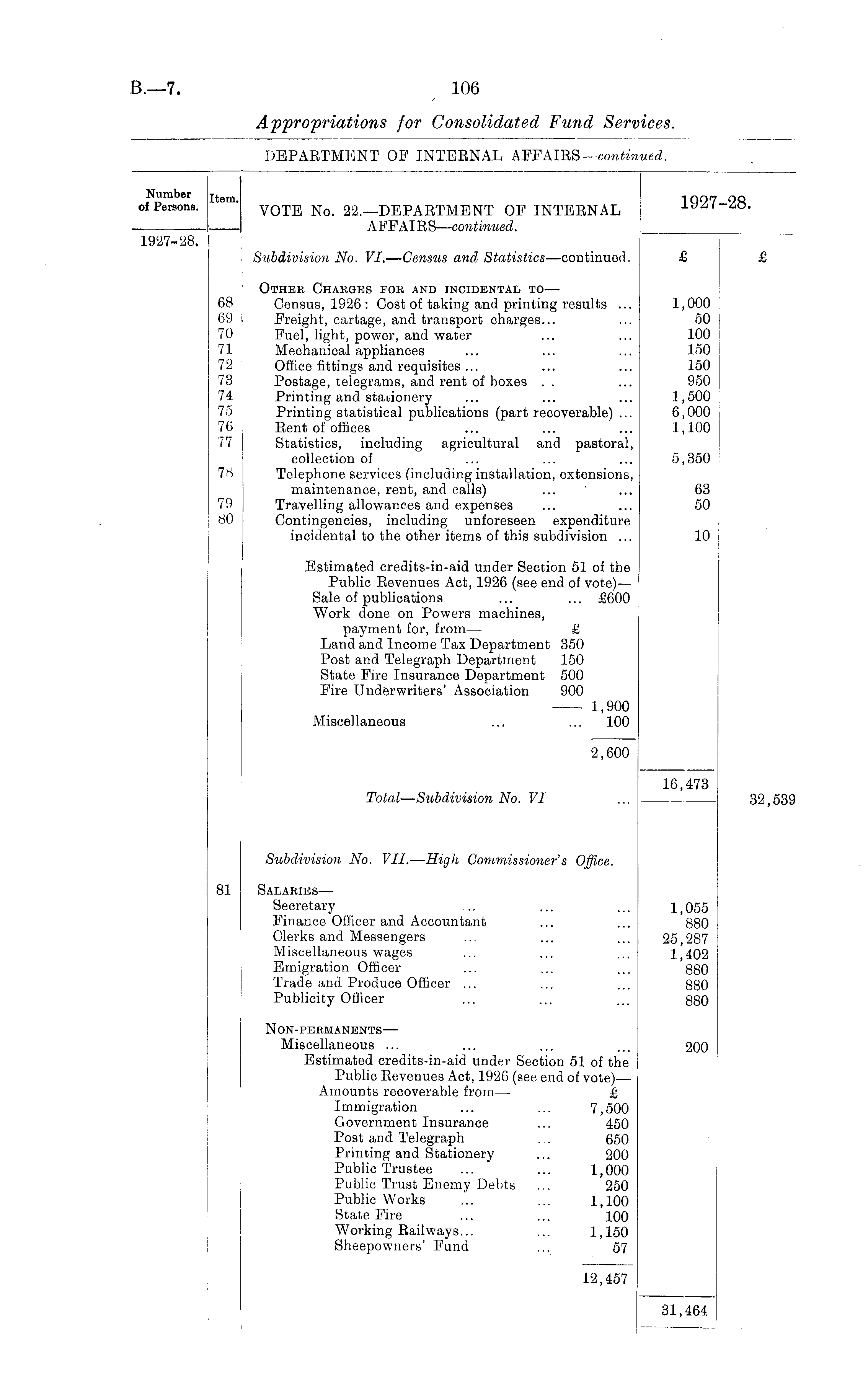 Number Item 1Q97-9R of Persons. V0T E No. 22.—DEPARTMENT OF INTERNAL AFFAIRS—continued. 1927-28. Subdivision No. VI.—Census and Statistics—continued. £ £ Other Charges for and incidental to — 68 Census, 1926 : Cost of taking and printing results ... 1,000 69 Freight, cartage, and transport charges... ... 50 70 Fuel, light, power, and water ... ... 100 71 Mechanical appliances ... ... ... 150 72 Office fittings and requisites ... ... ... 150 73 Postage, telegrams, and rent of boxes . . ... 950 74 Printing and stationery ... ... ... 1,500 75 Printing statistical publications (part recoverable) ... 6,000 76 Rent of offices ... ... ... 1,100 77 Statistics, including agricultural and pastoral, collection of ... ... ... 5,350 78 Telephone services (including installation, extensions, maintenance, rent, and calls) ... ' ... 63 79 Travelling allowances and expenses ... ... 50 80 Contingencies, including unforeseen expenditure incidental to the other items of this subdivision ... 10 i Estimated credits-in-aid under Section 51 of the Public Revenues Act, 1926 (see end of vote)— Sale of publications ... ... £600 Work done on Powers machines, payment for, from— £ Land and Income Tax Department 350 Post and Telegraph Department 150 State Fire Insurance Department 500 Fire Underwriters' Association 900 1,900 Miscellaneous ... ... 100 2,600 16,473 Total—Subdivision No. VI ... ...—— 32,539 Subdivision No. VII. —High Commissioner's Office. 81 Salaries— Secretary .. ... ... 1,055 Finance Officer and Accountant ... ... 880 Clerks and Messengers ... ... ... 25,287 Miscellaneous wages ... ... ... 1,402 Emigration Officer ... ... ... 380 Trade and Produce Officer ... ... ... 880 Publicity Officer ... ... ... 880 Non-permanents— Miscellaneous ... ... ... ... 200 Estimated credits-in-aid under Section 51 of the Public Revenues Act, 1926 (see end of vote) — Amounts recoverable from— £ Immigration ... ... 7,500 Government Insurance ... 450 Post and Telegraph ... 650 Printing and Stationery ... 200 Public Trustee ... ... 1,000 Public Trust Enemy Debts ... 250 Public Works ... ... 1,100 State Fire ... ... 100 Working Railways... ... 1,150 Sheepowners' Fund ... 57 12,457 31,464
