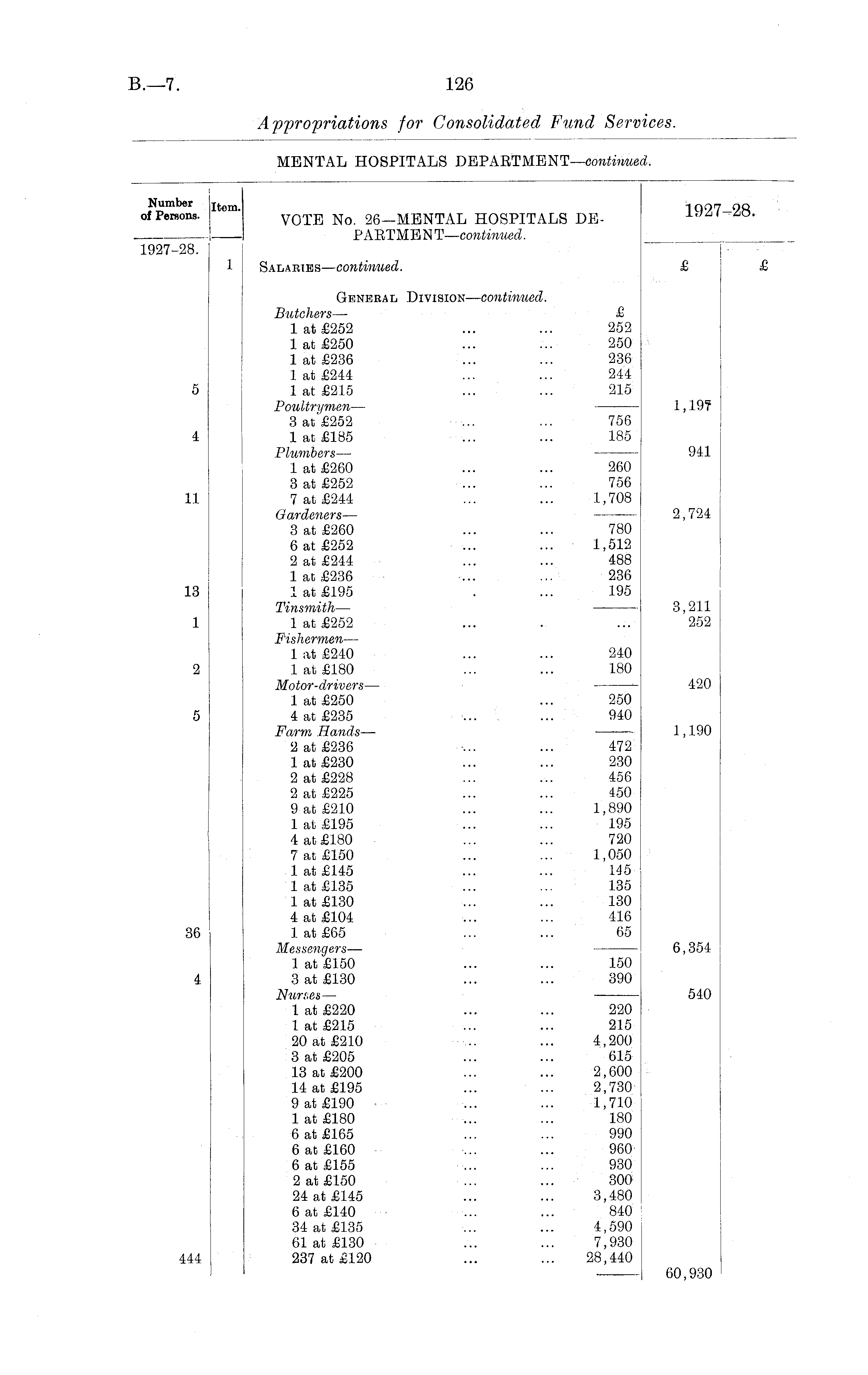 Number Itera . 1 q07_0Q of Persons. V0TB No 26—MENTAL HOSPITALS DEPARTMENT—continued. 1927-28. 1 Salaries —continued. £ £ General Division —continued. Butchers — £ 1 at £252 ... ... 252 1 at £250 ... ... 250 1 at £236 ... ... 236 1 at £244 ... ... 244 5 1 at £215 ... ... 215 Poultrymen— — 1,19? 3 ac £252 ... ... 756 4 1 at £185 ... ... 185 Plumbers — 941 1 at £260 ... ... 260 3 at £252 ... ... 756 11 7 at £244 ... ... 1,708 Gardeners— 2,724 3 at £260 ... ... 780 6 at £252 ... ... 1,512 2 at £244 ... ... 488 1 at £236 ... ... 236 13 1 at £195 . ... 195 Tinsmith— 3,211 1 1 at £252 ... . ... 252 Fishermen — 1 at £240 ... ... 240 2 1 at £180 ... ... 180 Motor-drivers — 420 1 at £250 ... 250 5 4 at £235 ... ... 940 Farm Hands — 1,190 2 at £236 ... ... 472 1 at £230 ... ... 230 2 at £228 ... ... 456 2 at £225 ... ... 450 9 at £210 ... ... 1,890 1 at £195 ... ... 195 4 at £180 ... ... 720 7 at £150 ... ... 1,050 1 at £145 ... ... 145 1 at £135 ... ... 135 1 at £130 ... ... 130 4 at £104 ... ... 416 36 1 at £65 ... ... 65 Messengers— 6,354 1 at £150 ... ... 150 4 3 at £130 ... ... 390 Nurses— 540 1 at £220 ... ... 220 1 at £215 ... ... 215 20 at £210 ... ... 4,200 3 at £205 ... ... 615 13 at £200 ... ... 2,600 14 at £195 ... ... 2,730 9 at £190 ... ... 1,710 1 at £180 ... ... 180 6 at £165 ... ... 990 6 at £160 ... ... 960 6 at £155 ... ... 930 2 at £150 ... ... 300 24 at £145 ... ... 3,480 6 at £140 ... ... 840 34 at £135 ... ... 4,590 61 at £130 ... ... 7,930 444 237 at £120 ... ... 28,440 —— 60,930