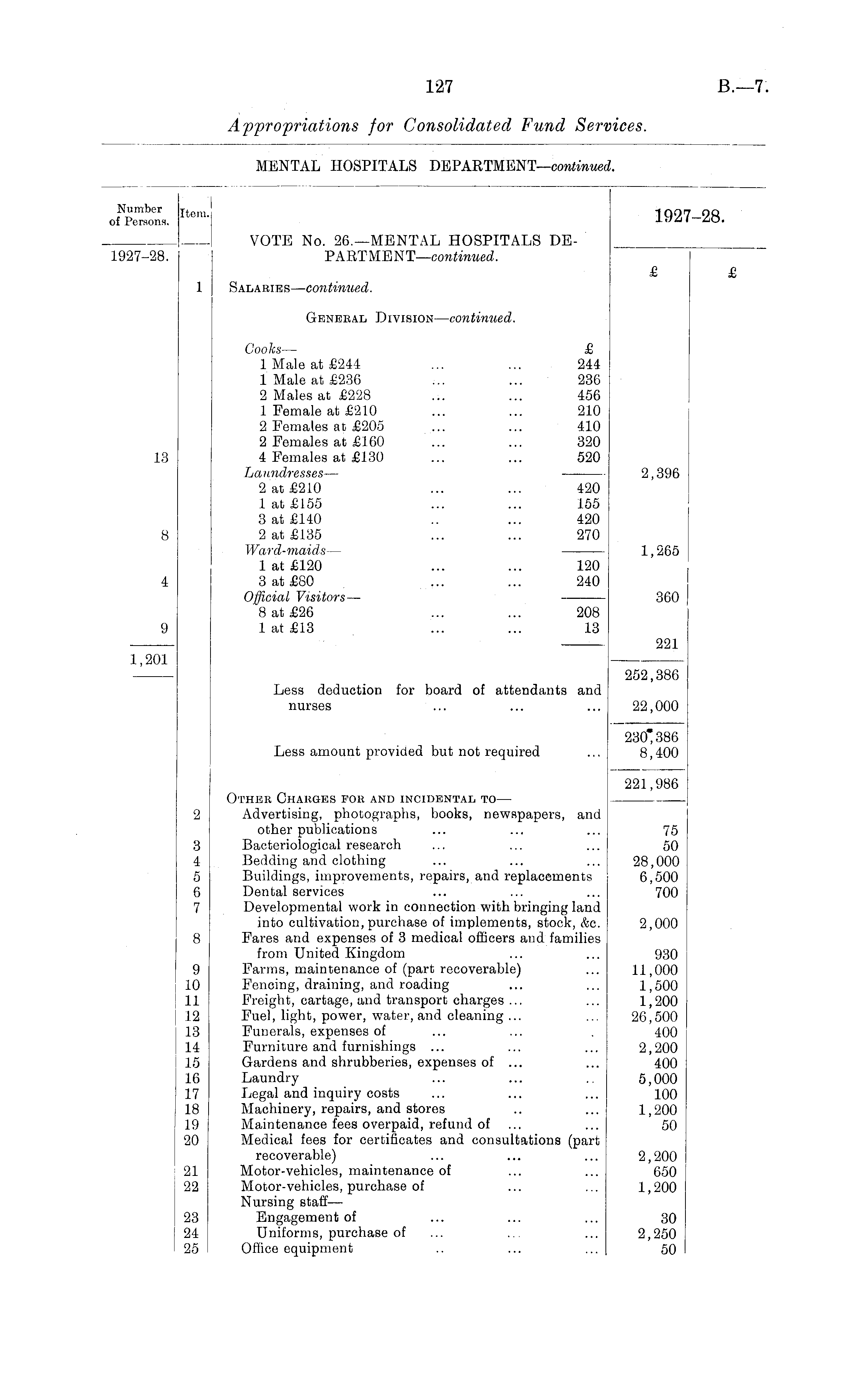 of^Persons. 1927-28. VOTE No. 26.—MENTAL HOSPITALS DE- _ 1927-28. PARTMENT—continued. £ £ 1 Salaries—continued. General Division —continued. Cooks — £ 1 Male at £244 ... ... 244 1 Male at £236 ... ... 236 2 Males at £228 .v ... 456 1 Female at £210 ... ... 210 2 Females at £205 ... ... 410 2 Females at £160 ... ... 320 13 4 Females at £130 ... ... 520 Laundresses— 2,396 2 at £210 ... ... 420 1 at £155 ... ... 155 3 at £140 .. ,.. 420 8 2 at £135 ... ... 270 Ward-maids— — 1,265 1 at £120 ... ... 120 4 3 at £80 ... ... 240 Official Visitors— 360 8 at £26 ... ... 208 9 1 at £13 ... ... 13 221 1,201 _ 252,386 Less deduction for board of attendants and nurses ... ... ... 22,000 230*386 Less amount provided but not required ... 8,400 221,986 Other Charges for and incidental to — 2 Advertising, photographs, books, newspapers, and other publications ... ... ... 75 3 Bacteriological research ... ... ... 50 4 Bedding and clothing ... ... ... 28,000 5 Buildings, improvements, repairs, and replacements 6,500 6 Dental services ... ... ... 700 7 Developmental work in connection with bringing land into cultivation, purchase of implements, stock, &c. 2,000 8 Fares and expenses of 3 medical officers and families from United Kingdom ... ... 930 9 Farms, maintenance of (part recoverable) ... 11,000 10 Fencing, draining, and roading ... ... 1,500 11 Freight, cartage, and transport charges ... ... 1,200 12 Fuel, light, power, water, and cleaning... ... 26,500 13 Funerals, expenses of ... ... . 400 14 Furniture and furnishings ... ... ... 2,200 15 Gardens and shrubberies, expenses of ... ... 400 16 Laundry ... ... 5,000 17 Legal and inquiry costs ... ... ... 100 18 Machinery, repairs, and stores .. ... 1,200 19 Maintenance fees overpaid, refund of ... ... 50 20 Medical fees for certificates and consultations (part recoverable) ... ... ... 2,200 21 Motor-vehicles, maintenance of ... ... 650 22 Motor-vehicles, purchase of ... ... 1,200 Nursing staff— 23 Engagement of ... ... ... 30 24 Uniforms, purchase of ... ... ... 2,250 25 Office equipment .. ... ... 50 I