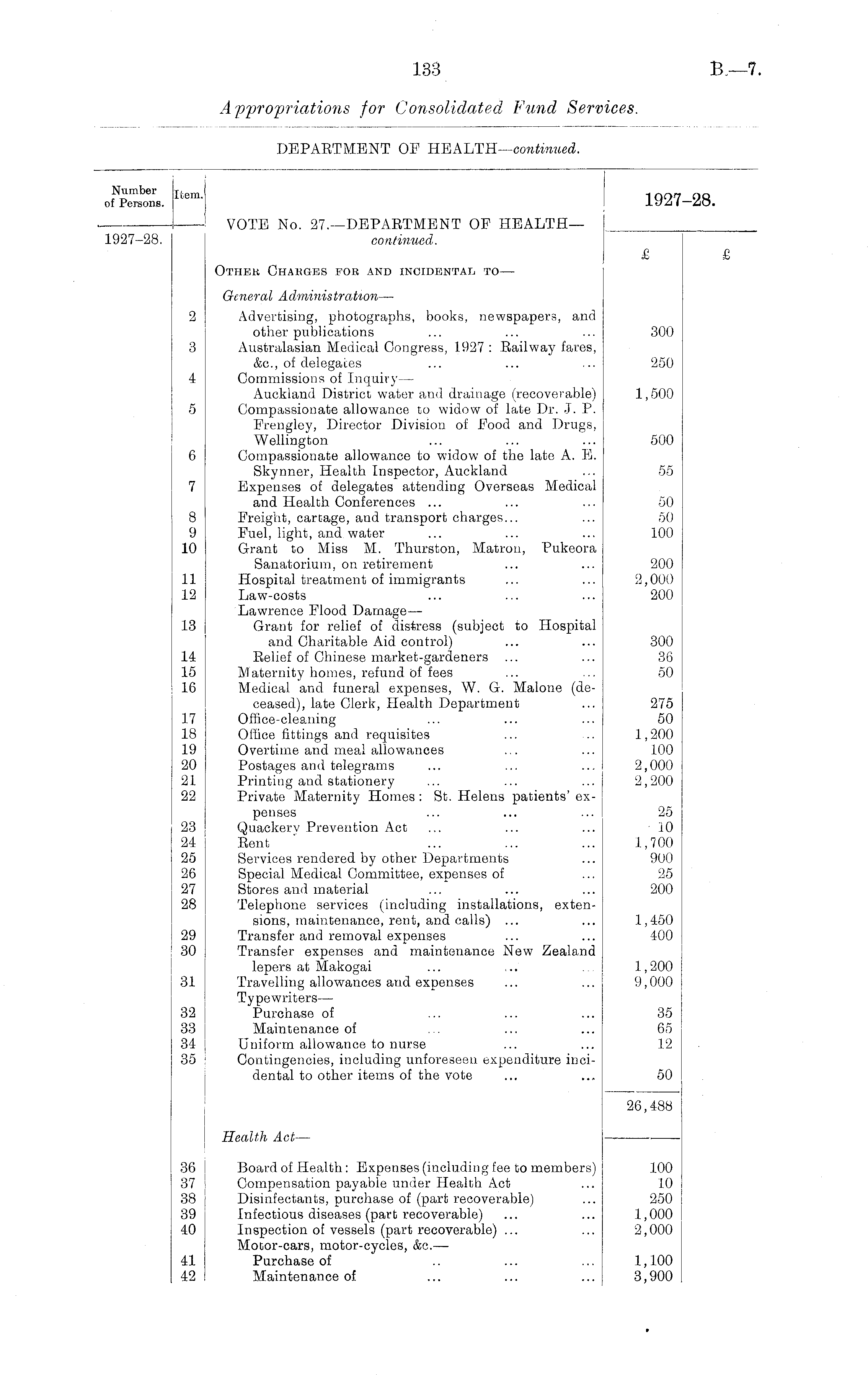 of N C b ons. ItemJ 1927-28. VOTE No. 27.—DEPARTMENT OF HEALTH— 1927-28. continued. £ £ Othek Charges fob and incidental to — General Administration— 2 Advertising, photographs, books, newspapers, and other publications ... ... ... 300 3 Australasian Medical Congress, 1927 : Railway fares, &c., of delegates ... ... ... 250 4 Commissions of Inquiry— Auckland District water and drainage (recoverable) 1,500 5 Compassionate allowance to widow of late Dr. J. P. Frengley, Director Division of Food and Drugs, Wellington ... ... ... 500 6 Compassionate allowance to widow of the late A. E. Skynner, Health Inspector, Auckland ... 55 7 Expenses of delegates attending Overseas Medical and Health Conferences ... ... ... 50 8 Freight, cartage, and transport charges... ... 50 9 Fuel, light, and water ... ... ... 100 10 Grant to Miss M. Thurston, Matron, Pukeora Sanatorium, on retirement ... ... 200 11 Hospital treatment of immigrants ... ... 2,000 12 Law-costs ... ... ... 200 Lawrence Flood Damage— 13 Grant for relief of distress (subject to Hospital and Charitable Aid control) ... ... 300 14 Relief of Chinese market-gardeners ... ... 36 15 Maternity homes, refund of fees ... ... 50 16 Medical and funeral expenses, W. G. Malone (deceased), late Clerk, Health Department ... 275 17 Office-cleaning ... ... ... 50 18 Office fittings and requisites ... ... 1,200 19 Overtime and meal allowances ... ... 100 20 Postages and telegrams ... ... ... 2,000 21 Printing and stationery ... ... ... 2,200 22 Private Maternity Homes : St. Helens patients' expenses ... ... ... 25 23 Quackerv Prevention Act ... ... ... 10 24 Rent * ... ... ... 1,700 25 Services rendered by other Departments ... 900 26 Special Medical Committee, expenses of ... 25 27 Stores and material ... ... ... 200 28 Telephone services (including installations, extensions, maintenance, rent, and calls) ... ... 1,450 29 Transfer and removal expenses ... ... 400 30 Transfer expenses and maintenance New Zealand lepers at Makogai ... ,1,200 31 Travelling allowances and expenses ... ... 9,000 Typewriters—• 32 Purchase of ... ... ... 35 33 Maintenance of ... ... ... 65 34 Uniform allowance to nurse ... ... 12 35 Contingencies, including unforeseen expenditure incidental to other items of the vote ... ... 50 26,488 Health Act — 36 Board of Health: Expenses (including fee to members) 100 37 Compensation payable under Health Act ... 10 38 Disinfectants, purchase of (part recoverable) ... 250 39 Infectious diseases (part recoverable) ... ... 1,000 40 Inspection of vessels (part recoverable) ... ... 2,000 Motor-cars, motor-cycles, &c.— 41 Purchase of .. ... ... 1,100 42 Maintenance of ... ... ... 3,900