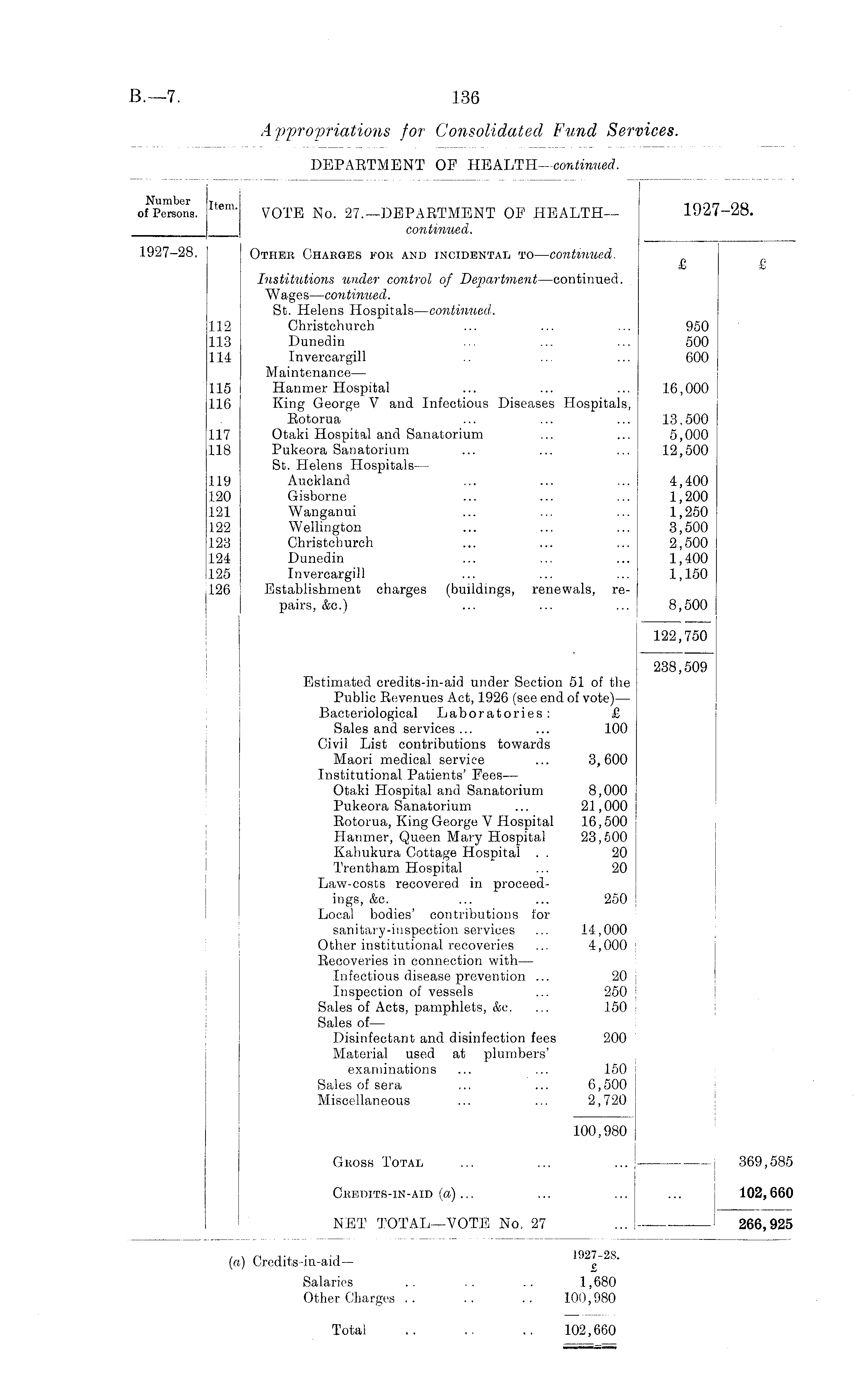 Item ' VOTE No. 27.—DEPARTMENT OP HEALTH— 1927-28. continued. 1927-28, Other Charges FOR AND INCIDENTAL TO Continued. nip £ £ Institutions under control of Department—continued. Wages —continued. St. Helens Hospitals —continued. 112 Christchurch ... ... ... 950 113 Dunedin ... ... ... 500 114 Invercargill .. ... ... 600 Maintenance— 115 Hanmer Hospital ... ... ... 16,000 116 King George Y and Infectious Diseases Hospitals, Botorua ... ... ... 13.500 117 Otaki Hospital and Sanatorium ... ... 5,000 118 Pukeora Sanatorium ... ... ... 12,500 St. Helens Hospitals — 119 Auckland ... ... ... 4,400 120 Gisborne ... ... ... 1,200 121 Wanganui ... ... ... 1,250 122 Wellington ... ... ... 3,500 123 Christchurch ... ... ... 2,500 124 Dunedin ... ... ... 1,400 125 Invercargill ... ... ... 1,150 126 Establishment charges (buildings, renewals, repairs, &c.) ... ... ... ! 8,500 122,750 238,509 Estimated credits-in-aid under Section 51 of the Public Revenues Act, 1926 (see end of vote) — Bacteriological Laboratories: £ Sales and services... ... 100 Civil List contributions towards Maori medical service ... 3,600 Institutional Patients' Pees— Otaki Hospital and Sanatorium 8,000 Pukeora Sanatorium ... 21,000 Botorua, King George V Hospital 16,500 Hanmer, Queen Mary Hospital 23,500 Kahukura Cottage Hospital . . 20 Trentham Hospital ... 20 Law-costs recovered in proceedings, &c. ... ... 250 Local bodies' contributions for sanitary-inspection services ... 14,000 j Other institutional recoveries ... 4,000 Becoveries in connection with—• Infectious disease prevention ... 20 j Inspection of vessels ... 250 Sales of Acts, pamphlets, &c. ... 150 Sales of—Disinfectant and disinfection fees 200 Material used at plumbers' examinations ... ... 150 Sales of sera ... ... 6,500 Miscellaneous ... ... 2,720 100,980 Gross Total ... ... ... 369,585 Credits-in-aid (a) ... ... ... ... 102,660 NET TOTAL—VOTE No. 27 ... 266,925