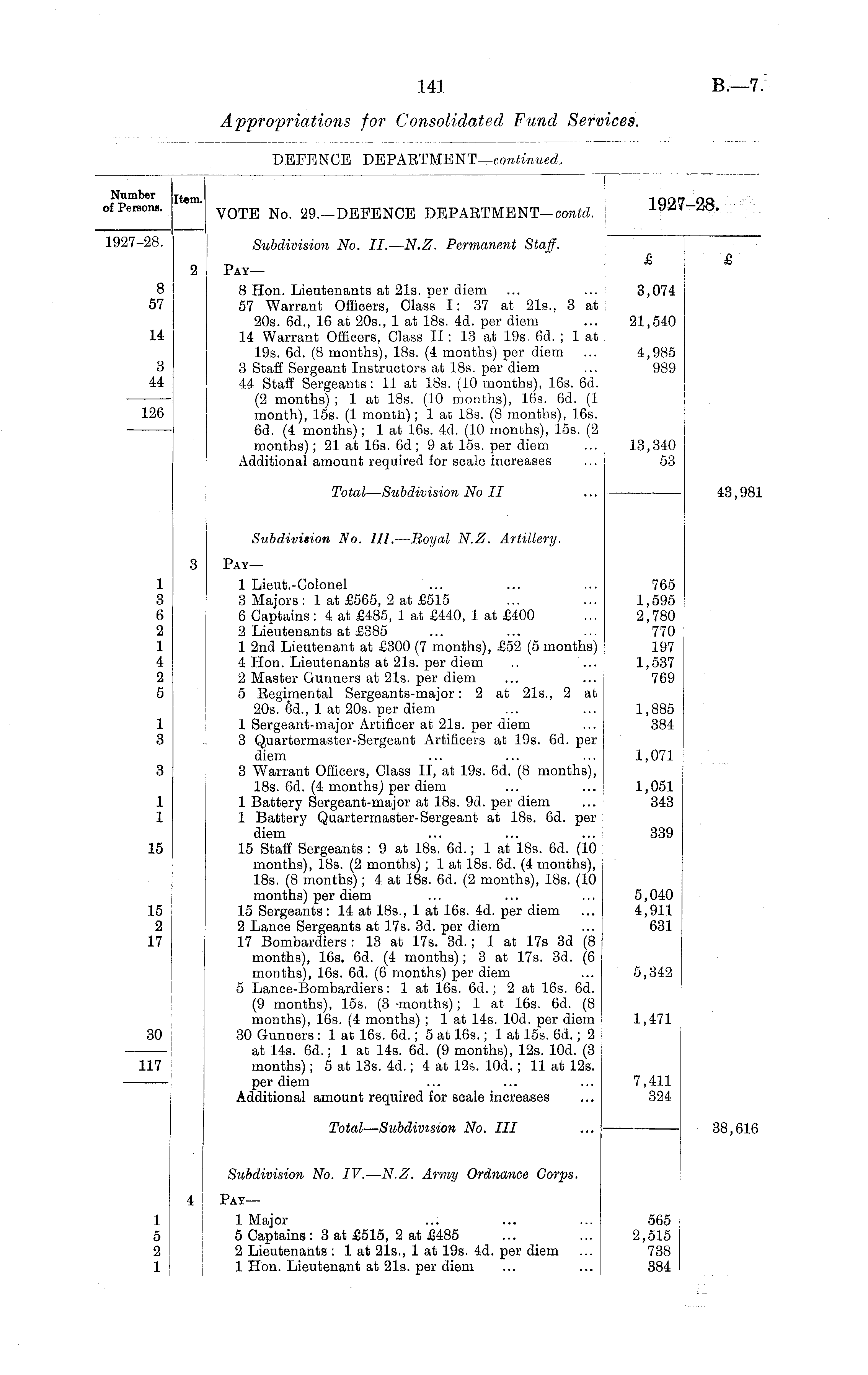 Number Item QQ7_ OR of Persons. yoTB No. 29.—DEFENCE DEPARTMENT— contd. 1927-28. Subdivision No. II.—N.Z. Permanent Staff. 2 Pay- & £ 8 8 Hon. Lieutenants at 21s. per diem ... ... 3,074 57 57 Warrant Officers, Class I: 37 at 21s., 3 at 20s. 6cL, 16 at 20s., 1 at 18s. 4d. per diem ... 21,540 14 14 Warrant Officers, Class II: 13 at 19s, 6d. ; 1 at 19s. 6d. (8 months), 18s. (4 months) per diem ... 4,985 3 3 Staff Sergeant Instructors at 18s. per diem ... 989 44 44 Staff Sergeants: 11 at 18s. (10 months), 16s. 6d. • (2 months) ; 1 at 18s. (10 months), 16s. 6d. (1 126 month), 15s. (1 month); 1 at 18s. (8 months), 16s. 6d. (4 months); 1 at 16s. 4d. (10 months), 15s. (2 months); 21 at 16s. 6d; 9 at 15s. per diem ... 13,340 Additional amount required for scale increases ... 53 Total—Subdivision No II ... ——— 43,981 Subdivision No. III. —Royal N.Z. Artillery. 3 Pay— 1 1 Lieut.-Colonel ... ... ... 765 3 3 Majors: 1 at £565, 2 at £515 ... ... 1,595 6 6 Captains: 4 at £485, 1 at £440, 1 at £400 ... 2,780 2 2 Lieutenants at £385 ... ... ... 770 1 1 2nd Lieutenant at £300 (7 months), £52 (5 months) 197 4 4 Hon. Lieutenants at 21s. per diem .. ... 1,537 2 2 Master Gunners at 21s. per diem ... ... 769 5 5 Regimental Sergeants-major: 2 at 21s., 2 at 20s. 6d., 1 at 20s. per diem ... ... 1,885 1 1 Sergeant-major Artificer at 21s. per diem ... 384 3 3 Quartermaster-Sergeant Artificers at 19s. 6d. per diem ... ... ... 1,071 3 3 Warrant Officers, Class II, at 19s. 6d. (8 months), 18s. 6d. (4 months) per diem ... ... 1,051 1 1 Battery Sergeant-major at 18s. 9d. per diem ... 343 1 1 Battery Quartermaster-Sergeant at 18s. 6d. per diem ... ... ... 339 15 15 Staff Sergeants: 9 at 18s. 6d.; 1 at 18s. 6d. (10 months), 18s. (2 months); 1 at 18s. 6d. (4 months), 18s. (8 months); 4 at 18s. 6d. (2 months), 18s. (10 months) per diem ... ... ... 5,040 15 15 Sergeants: 14 at 18s., 1 at 16s. 4d. per diem ... 4,911 2 2 Lance Sergeants at 17s. 3d. per diem ... 631 17 17 Bombardiers : 13 at 17s. 3d.; 1 at 17s 3d (8 months), 16s. 6d. (4 months); 3 at 17s. 3d. (6 months), 16s. 6d. (6 months) per diem ... 5,342 5 Lance-Bombardiers: 1 at 16s. 6d.; 2 at 16s. 6d. (9 months), 15s. (3 -months); .1 at 16s. 6d. (8 months), 16s. (4 months); 1 at 14s. lOd. per diem 1,471 30 30 Gunners : 1 at 16s. 6d.; 5 at 16s.; 1 at 15s. 6d.; 2 at 14s. 6d.; 1 at 14s. 6d. (9 months), 12s. lOd. (3 117 months); 5 at 13s. 4d.; 4 at 12s. lOd.; 11 at 12s. per diem ... ... ... 7,411 Additional amount required for scale increases ... 324 Total—Subdivision No. Ill ... 38,616 Subdivision No. IV.—N.Z. Army Ordnance Corps. 4 Pay— 1 1 Major ... ... ... 565 5 5 Captains: 3 at £515, 2 at £485 ... ... 2,515 2 2 Lieutenants : 1 at 21s., 1 at 19s. 4d. per diem ... 738 1 1 Hon. Lieutenant at 21s. per diem ... ... 384