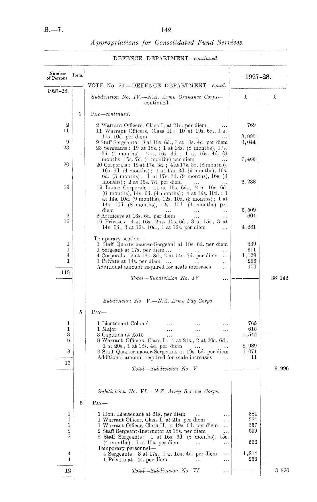 oE, | Item - 1927-28. 1 VOTE No. 29.—DEFENCE DEPAETMENT—contd. _ 1927-28. Subdivision No. IV.—N.Z. Army Ordnance Corps — £ £ continued. 4 Pay—continued. 2 2 Warrant Officers, Class I, at 21s. per diem ... 769 11 11 Warrant Officers, Class II: 10 at 19s. 6d., 1 at 17s. lOd. per diem ... ... ... 3,895 9 9 Staff Sergeants : 8 at 18s. 6d,, 1 at 18s. 4d. per diem 3,044 23 23 Sergeants : 19 at 18s.; 1 at 18s. (8 months), 17s. 3d. (4 months) ; 2 at 16s. 4d.; 1 at 16s. 4d. (8 months, 15s. 7d. (4 months) per diem ... 7,465 20 20 Corporals : 12 at 17s. 3d. ; 4 at 17s. 3d. (8 months), 16s. 6d. (4 months) ; 1 at 17s. 3d. (9 months), 16s. 6d. (3 months) ; 1 at 17s. 3d. (9 months), 16s. (3 months); 2 at 15s. 7d. per diem ... ... 6,238 19 19 Lance Corporals : 11 at 16s. 6d.; 2 at 16s. 6d, (8 months), 14s. 6d. (4 months); 4 at 14s. lOd.; I at 14s. lOd. (9 months), 12s. lOd. (3 months); 1 at 14s. lOd. (8 months), 12s. lOd. (4 months) per diem ... ... ... 5,509 2 2 Artificers at 16s. 6d. per diem ... ... 604 16 16 Privates : 4 at 16s., 2 at 15s. 6d., 3 at 15s., 3 at 14s. 6d., 3 at 12s. 10d., 1 at 12s. per diem ... 4,281 Temporary section— 1 1 Staff Quartermaster-Sergeant at 18s. 6d. per diem 339 1 1 Sergeant at 17s. per diem... ... ... 311 4 4 Corporals : 2 at 16s. 3d., 2 at 14s. 7d. per diem ... 1,129 1 1 Private at 14s. per diem ... ... ... 256 Additional amount required for scale increases ... 100 118 Total —Subdivision No. IV ... — 38 142 Subdivision No. V.—N.Z. Army Pay Corps. 5 Pay— 1 1 Lieutenant-Colonel ... ... ... 765 1 1 Major ... ... ... 615 3 3 Captains at £515 ... ... ... 1,545 8 8 Warrant Officers, Class 1: 4 at 21s., 2 at 20s. 6d., 1 at 20s., 1 at 18s. 4d. per diem ... ... 2,989 3 3 Staff Quartermaster-Sergeants at 19s. 6d. per diem 1,071 Additional amount required for scale increases ... 11 16 Total—Subdivision No. V ... 6,996 Subdivision No. VI. —N.Z. Army Service Corps. 6 Pay— 1 1 Hon. Lieutenant at 21s. per diem ... ... 384 1 1 Warrant Officer, Class I, at 21s. per diem ... 384 1 1 Warrant Officer, Class II, at 19s. 6d. per diem ... 357 2 2 Staff Sergeant-Instructor at 18s. per diem ... 659 2 2 Staff Sergeants: 1 at 16s. 6d. (8 months), 15s. (4 months); 1 at 15s. per diem ... ... 566 Temporary personnel— 4 4 Sergeants : 3 at 17s., 1 at 15s. 4d. per diem ... 1,214 1 1 Private at 14s. per diem ... ... 256 12 Total—Subdivision No. VI ... 3 820