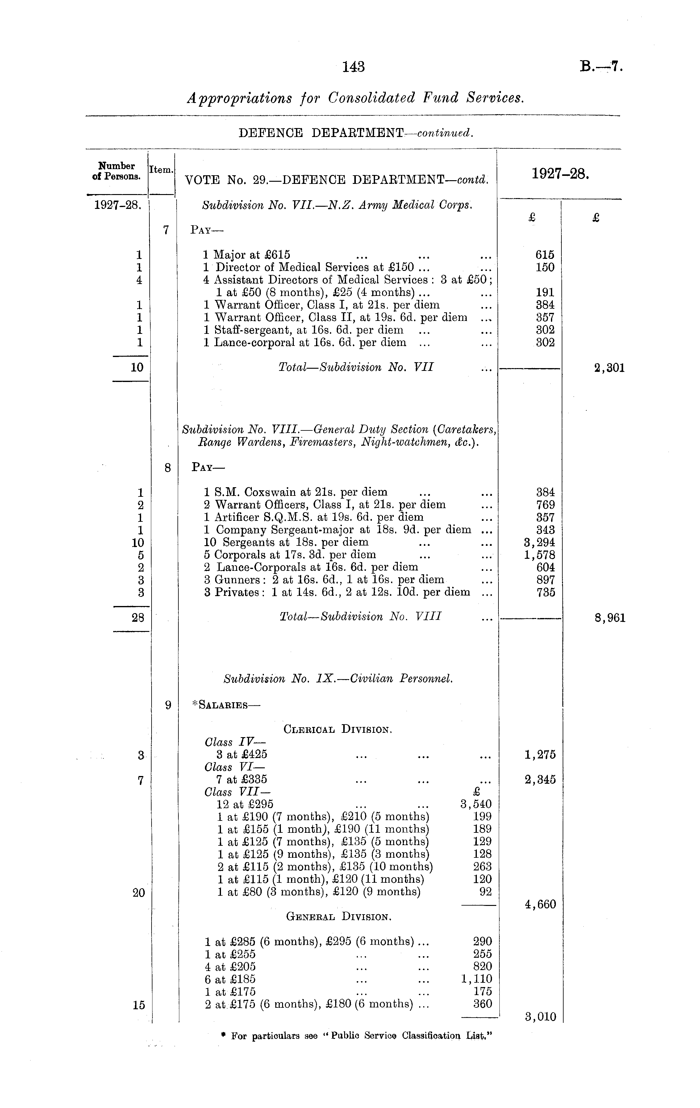 Number item. i qnn 90 of Persona. V 0T B No. 29.—DEFENCE DEPARTMENT—contd. 1927-28. Siibdivision No. VII.—N.Z. Army Medical Corps. £ £ 7 Pay— 1 1 Major at £615 ... ... ... 615 1 1 Director of Medical Services at £150 ... ... 150 4 4 Assistant Directors of Medical Services : 3 at £50; 1 at £50 (8 months), £25 (4 months) ... ... 191 1 1 Warrant Officer, Class I, at 21s. per diem ... 384 1 1 Warrant Officer, Class II, at 19s. 6d. per diem .., 357 1 1 Staff-sergeant, at 16s. 6d. per diem ... ... 302 1 1 Lance-corporal at 16s. 6d. per diem ... ... 302 10 Total—Subdivision No. VII ... 2,301 Subdivision No. VIII.—General Duty Sectio7i (Caretakers, Range Wardens, Firemasters, Night-watchmen, dc.). 8 Pay— 1 1 S.M. Coxswain at 21s. per diem ... ... 384 2 2 Warrant Officers, Class I, at 21s. per diem ... 769 1 1 Artificer S.Q.M.S. at 19s. 6d. per diem ... 357 1 1 Company Sergeant-major at 18s. 9d. per diem ... 343 10 10 Sergeants at 18s. per diem ... ... 3,294 5 5 Corporals at 17s. 3d. per diem ... ... 1,578 2 2 Lance-Corporals at 16s. 6d. per diem ... 604 3 3 Gunners : 2 at 16s. 6d., 1 at 16s. per diem ... 897 3 3 Privates: 1 at 14s. 6d., 2 at 12s. lOd. per diem ... 735 28 Total—Subdivision No. VIII ... -—— 8,961 Subdivision No. IX.—Civilian Personnel. 9 *Salaries — Clerical Division. Class IV — 3 3 at £425 ... ... ... 1,275 Class VI— 7 7 at £335 ... ... ... 2,345 Class VII- £ 12 at £295 ... ... 3,540 1 at £190 (7 months), £210 (5 months) 199 1 at £155 (1 month), £190 (11 months) 189 1 at £125 (7 months), £135 (5 months) 129 1 at £125 (9 months), £135 (3 months) 128 2 at £115 (2 months), £135 (10 months) 263 1 at £115 (1 month), £120 (11 months) 120 20 1 at £80 (3 months), £120 (9 months) 92 — 4,660 General Division. 1 at £285 (6 months), £295 (6 months) ... 290 1 at £255 ... ... 255 4 at £205 ... ... 820 6 at £185 ... ... 1,110 1 at £175 ... ... 175 15 2 at £175 (6 months), £180 (6 months) ... 360 3,010 * For particulars see " Public Service Classification List,"