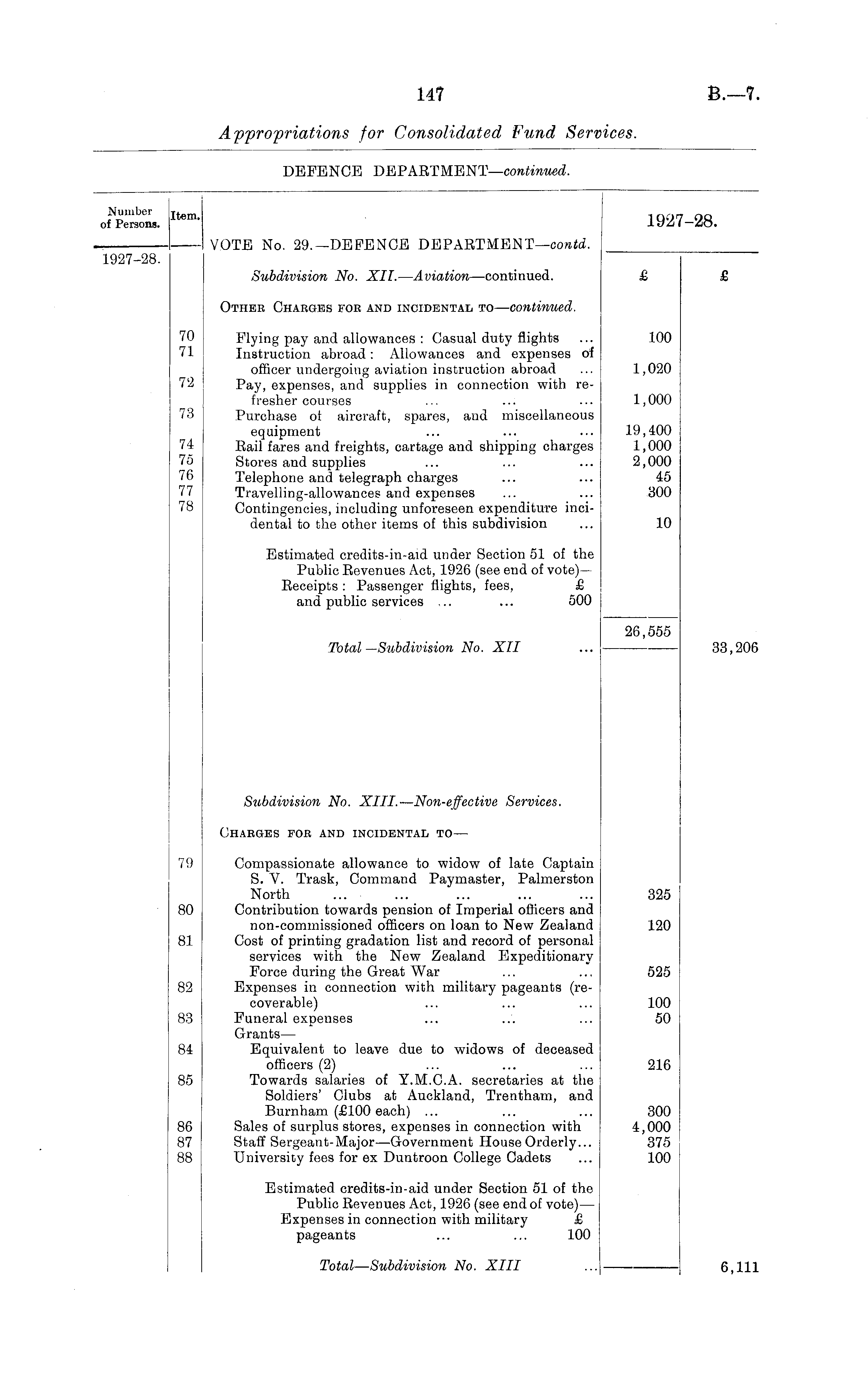 _ — orni Item - 1927-28. VOTE No. 29.—DEFENCE DEPARTMENT—contd. 1927-28. Subdivision No. XII.—Aviation—continued. £ £ Other Charges for and incidental to —contimoed. 70 Flying pay and allowances : Casual duty flights ... 100 71 Instruction abroad: Allowances and expenses of officer undergoing aviation instruction abroad ... 1,020 72 Pay, expenses, and supplies in connection with refresher courses ... ... ... 1,000 73 Purchase ot aircraft, spares, and miscellaneous equipment ... ... ... 19,400 74 Bail fares and freights, cartage and shipping charges 1,000 75 Stores and supplies ... ... ... 2,000 76 Telephone and telegraph charges ... ... 45 77 Travelling-allowances and expenses ... ... 300 78 Contingencies, including unforeseen expenditure incidental to the other items of this subdivision ... 10 Estimated credits-in-aid under Section 51 of the Public Revenues Act, 1926 (see end of vote) — Receipts : Passenger flights, fees, £ and public services ... ... 500 26,555 Total—Subdivision No. XII ... 33,206 Subdivision No. XIII.—Non-effective Services. Charges for and incidental to— 79 Compassionate allowance to widow of late Captain S. V. Trask, Command Paymaster, Palmerston North ... ... ... ... ... 325 80 Contribution towards pension of Imperial officers and non-commissioned officers on loan to New Zealand 120 81 Cost of printing gradation list and record of personal services with the New Zealand Expeditionary Force during the Great War ... ... 525 82 Expenses in connection with military pageants (recoverable) ... ... ... 100 83 Funeral expenses ... ... ... 50 Grants— 84 Equivalent to leave due to widows of deceased officers (2) ... ... ... 216 85 Towards salaries of Y.M.C.A. secretaries at the Soldiers' Clubs at Auckland, Trentham, and Burnham (£100 each) ... ... ... 300 86 Sales of surplus stores, expenses in connection with 4,000 87 Staff Sergeant-Major—Government House Orderly... 375 88 University fees for ex Duntroon College Cadets ... 100 Estimated credits-in-aid under Section 51 of the Public Revenues Act, 1926 (see end of vote)— Expenses in connection with military £ pageants ... ... 100 Total —Subdivision No. XIII ... 6,111
