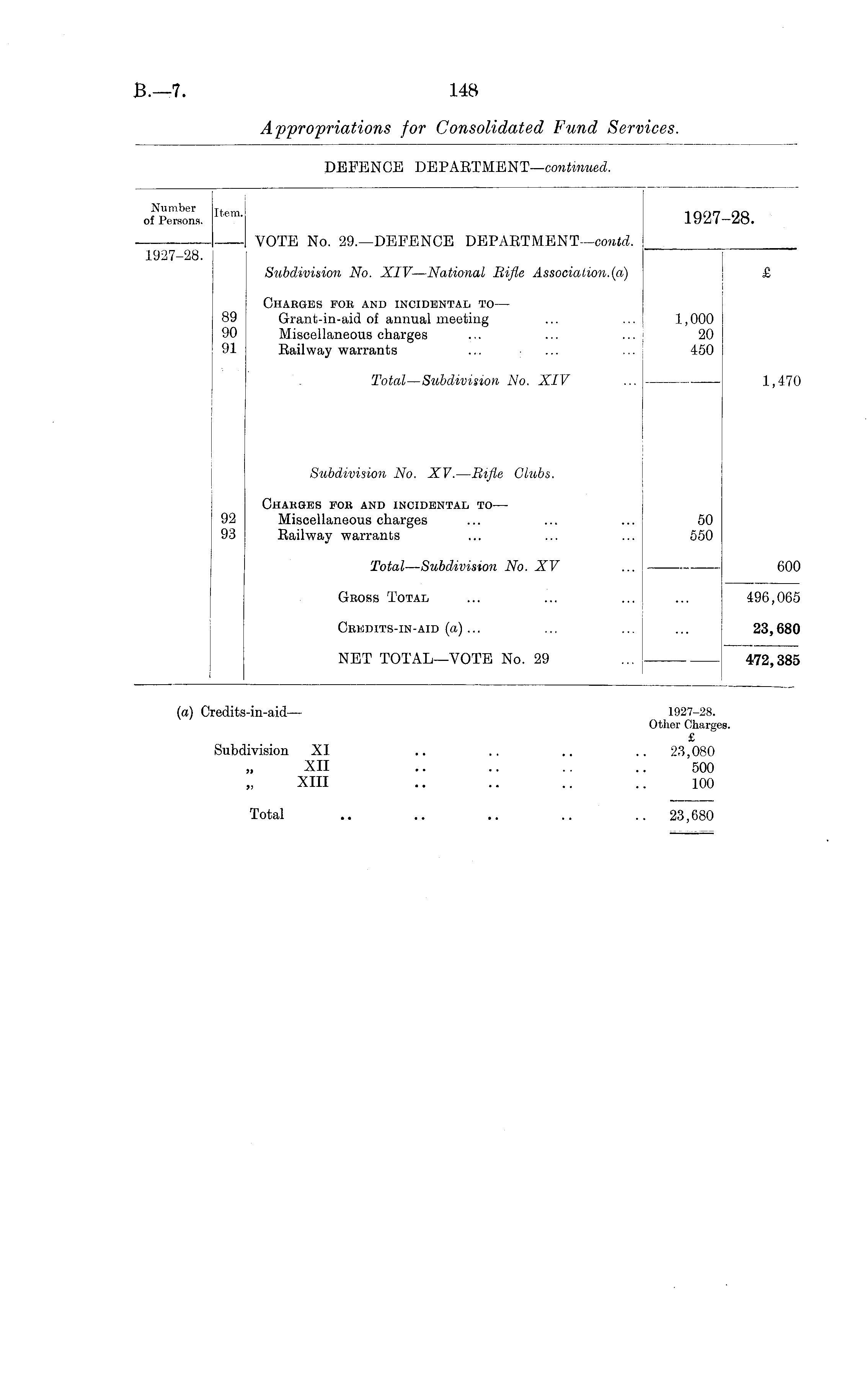 onions. Item " 1927-28. — VOTE No. 29.—DEFENCE DEPARTMENT—contd. 1927-28. Subdivision No. XIV—National Rifle Association.(a) £ Charges foe and incidental to — 89 Grant-in-aid of annual meeting ... ... 1,000 90 Miscellaneous charges ... ... ... 20 91 Railway warrants .... ... ... 450 Total—Subdivision No. XIV ... 1,470 Subdivision No. XV.—Rifle Clubs. Charges fob and incidental to — 92 Miscellaneous charges ... ... ... 50 93 Railway warrants ... ... ... 550 Total—Subdivision No. XV ... 600 GROSS TOTAL ... ... ... ... 496,065 Credits-IN-AID (a)... ... ... ... 23,680 NET TOTAL—VOTE No. 29 ... 472,385
