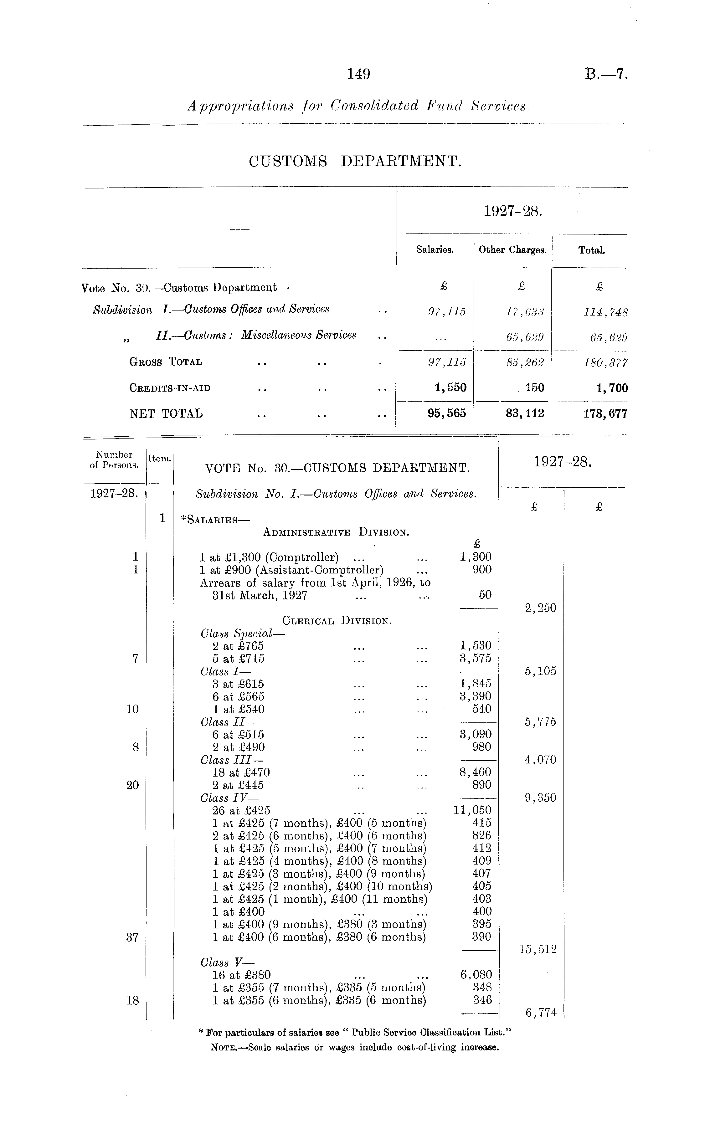 1927-28. Salaries. Other Charges. Total. Vote No. 30.—Customs Department— £ £ £ Subdivision I. —Customs Offices and Services .. 97,115 1 7,633 114 , 748 „ II. —Customs: Miscellaneous Services .. ... 65,629 65,629 GROSS TOTAL .. .. .. 97,115 88,262 180,377 Credits-in-AID .. .. .. 1,550 150 1,700 NET TOTAL .. .. .. 95,565 83,112 178,677 Number Jt em . qq of Persona. VOTE No. 30.—CUSTOMS DEPARTMENT. ijai-ao. 1927-28. Subdivision No. I.—Customs Offices and Services. £ £ 1 * Sal aribs —■ Administrative Division. £ 1 1 at £1,300 (Comptroller) ... ... 1,300 1 1 at £900 (Assistant-Comptroller) ... 900 Arrears of salary from 1st April, 1926, to 31st March, 1927 ... ... 50 2,250 Clerical Division. Class Special —- 2 at £765 ... ... 1,530 7 5 at £715 ... ... 3,575 Class I— 5,105 3 at £615 ... ... 1,815 6 at £565 ... ... 3,390 10 1 at £540 ... ... 540 Class II— 5,775 6 at £515 ... ... 3,090 8 2 at £490 ... ... 980 Class III— 4,070 18 at £470 ... ... 8,460 20 2 at £445 ... ... 890 Class IV— 9,350 26 at £425 ... ... 11,050 1 at £425 (7 months), £400 (5 months) 415 2 at £425 (6 months), £400 (6 months) 826 1 at £425 (5 months), £400 (7 months) 412 1 at £425 (4 months), £400 (8 months) 409 1 at £425 (3 months), £400 (9 months) 407 1 at £425 (2 months), £400 (10 months) 405 1 at £425 (1 month), £400 (11 months) 403 1 at £400 ... ... 400 1 at £400 (9 months), £380 (3 months) 395 37 1 at £400 (6 months), £380 (6 months) 390 15,512 Class V— 16 at £380 ... ... 6,080 1 at £355 (7 months), £335 (5 months) 348 18 1 at £355 (6 months), £335 (6 months) 346 6,774 * For particulars of salaries see " Publio Servioe Classification List." Note.—Scale salaries or wages include cost-of-living increase.