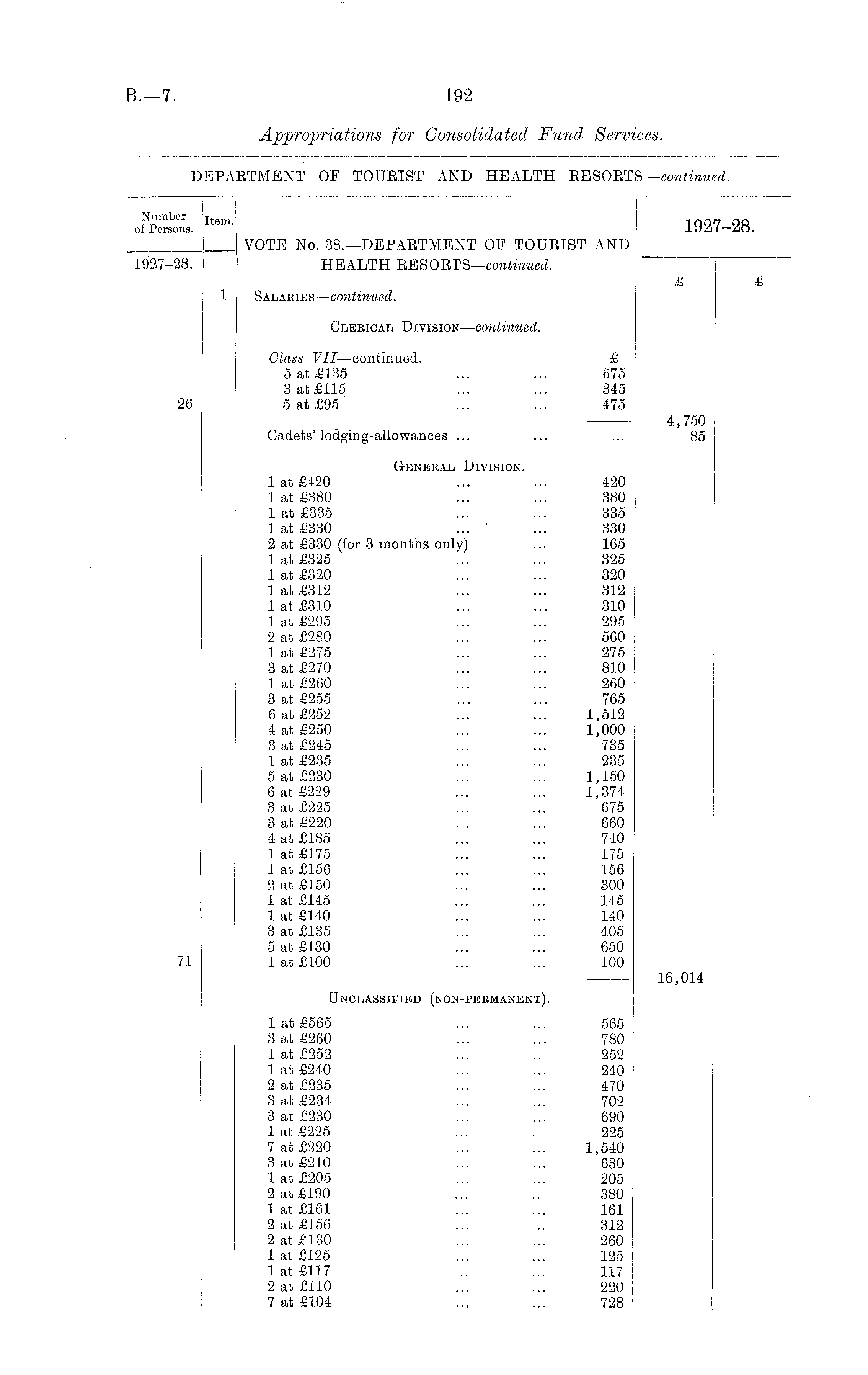 , Item ' 1927-28. !. VOTE No. 38.—DEPARTMENT OF TOURIST AND 1927-28. HEALTH RESORTS —continued. ~ £ £ 1 Salabies —continued. Clerical Division—continued. Glass VII—continued. £ 5 at £135 ... ... 675 3 at £115 ... ... 345 26 5 at £95 ... ... 475 4,750 Cadets'lodging-allowances ... ... ... 85 General Division. 1 at £420 ... ... 420 1 at £380 ... ... 380 1 at £335 ... ... 335 1 at £330 ... ... 330 2 at £330 (for 3 months only) ... 165 1 at £325 ... ... 325 1 at £320 ... ... 320 1 at £312 ... ... 312 1 at £310 ... ... 310 1 at £295 ... ... 295 2 at £280 ... ... 560 1 at £275 ... ... 275 3 at £270 ... ... 810 1 at £260 ... ... 260 3 at £255 ... ... 765 6 at £252 ... ... 1,512 4 at £250 ... ... 1,000 3 at £245 ... ... 735 1 at £235 ... ... 235 5 at £230 ... ... 1,150 6 at £229 ... ... 1,374 3 at £225 ... ... 675 3 at £220 ... ... 660 4 at £185 ... ... 740 1 at £175 ... ... 175 1 at £156 ... ... 156 2 at £150 ... ... 300 1 at £145 ... ... 145 1 at £140 ... ... 140 3 at £135 ... ... 405 5 at £130 ... ... 650 71 1 at £100 ... ... 100 16,014 Unclassified (non-permanent). 1 at £565 ... ... 565 3 at £260 ... ... 780 1 at £252 ... ... 252 1 at £240 ... ... 240 2 at £235 ... ... 470 3 at £234 ... ... 702 3 at £230 ... ... 690 1 at £225 ... ... 225 7 at £320 ... ... 1,540 3 at £210 ... ... 630 1 at £205 ... ... 205 2 at £190 ... ... 380 1 at £161 ... ... 161 2 at £156 ... ... 312 2 at £130 ... ... 260 1 at £125 ... ... 125 1 at £117 ... ... 117 2 at £110 ... ... 220 7 at £104 ... ... 728