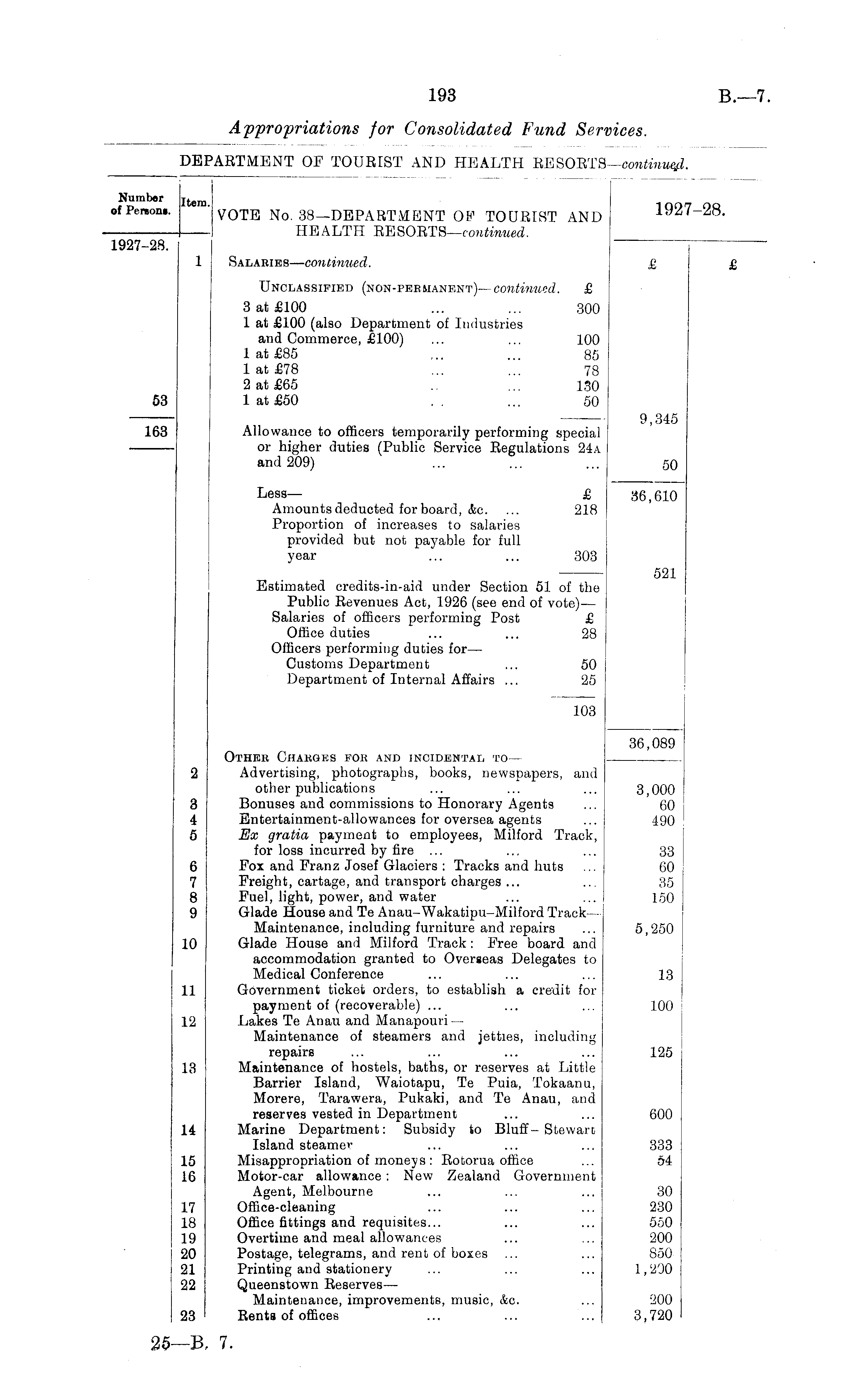 Number item of Pereom. ' VOTE No. 38—DEPARTMENT OB 1 TOURIST AND 1927-28. HEALTH RESORTS—continued. 1927-28. 1 Salaries—continued. £ £ Unclassified (non-permanent)— continued. £ 3 at £100 ... ... 300 1 at £100 (also Department of Industries and Commerce, £100) ... ... 100 1 at £85 ... ... 85 1 at £78 ... ... 78 2 at £65 .. ... 130 53 1 at £50 . . ... 50 , . 9,345 163 Allowance to officers temporarily performing special or higher duties (Public Service Regulations 24a and 209) ... ... ... 50 Less— £ 36,610 Amounts deducted for board, &c. ... 218 Proportion of increases to salaries provided but not payable for full year ... ... 303 ■ 521 Estimated credits-in-aid under Section 51 of the Public Eevenues Act, 1926 (see end of vote) — Salaries of officers performing Post £ Office duties ... ... 28 Officers performing duties for—Customs Department ... 50 Department of Internal Affairs ... 25 103 36,089 Other Charges fok and incidental to — 2 Advertising, photographs, books, newspapers, and other publications ... ... ... 3,000 3 Bonuses and commissions to Honorary Agents ... 60 4 Entertainment-allowances for oversea agents ... 490 5 Ex gratia payment to employees, Milford Track, for loss incurred by fire ... ... ... 33 6 Fox and Franz Josef Glaciers : Tracks and huts ... 60 7 Freight, cartage, and transport charges ... ... 35 8 Fuel, light, power, and water ... ... 150 9 Glade House and Te Anau-Wakatipu-Milford Track— Maintenance, including furniture and repairs ... 5,250 10 Glade House and Milford Track: Free board and accommodation granted to Overseas Delegates to Medical Conference ... ... ... 13 11 Government ticket orders, to establish a credit for payment of (recoverable) ... ... ... 100 12 Lakes Te Anau and Manapouri — Maintenance of steamers and jetties, including repairs ... ... ... ... 125 13 Maintenance of hostels, baths, or reserves at Little Barrier Island, Waiotapu, Te Puia, Tokaanu, Morere, Tarawera, Pukaki, and Te Anau, and reserves vested in Department ... ... 600 14 Marine Department: Subsidy to Bluff-Stewart Island steamev ... ... ... 333 15 Misappropriation of moneys: Rotorua office ... 54 16 Motor-car allowance: New Zealand Government Agent, Melbourne ... ... ... 30 17 Office-cleaning ... ... ... 230 18 Office fittings and requisites... ... ... 550 19 Overtime and meal allowances ... ... 200 20 Postage, telegrams, and rent of boxes ... ... 850 21 Printing and stationery ... ... ... 1,200 22 Queenstown Reserves— Maintenance, improvements, music, &c. ... 200 23 Rents of offices ... ... ... 3,720