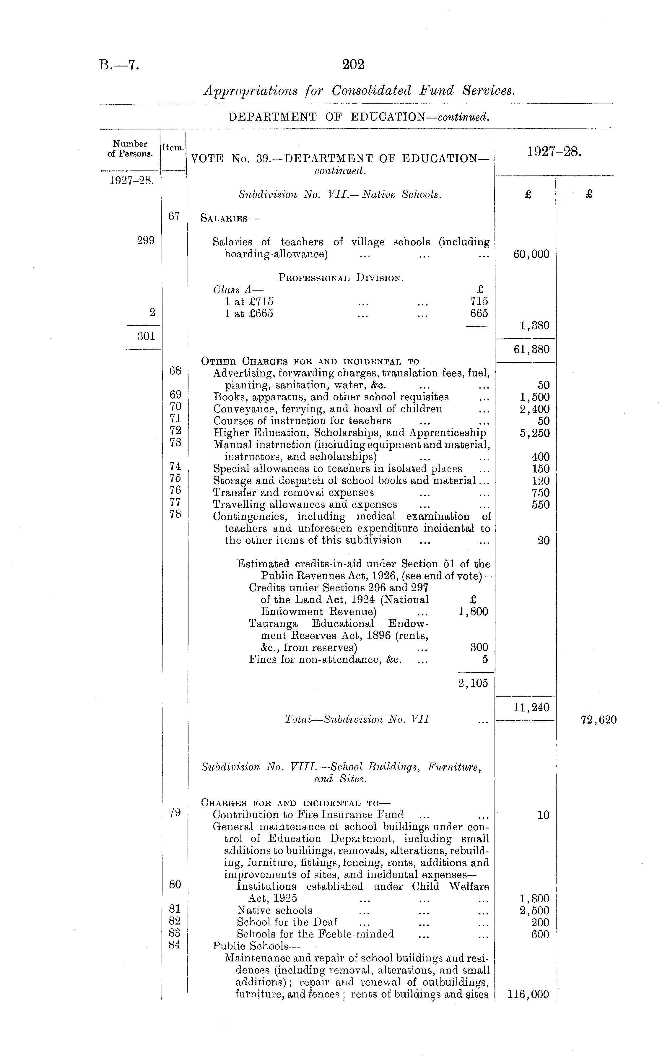 Number item. i Q97_OQ of rersons. VOTE No. 39.—DEPARTMENT OF EDUCATION— —I continued. 1927-28. Subdivision No. VII.— Native Schools. £ £ 67 Salaries— 299 Salaries of teachers of village schools (including boarding-allowance) ... ... ... 60,000 Professional Division. Class A — £ 1 at £715 ... ... 715 2 1 at £665 ... ... 665 1,380 301 — 61,380 Other Ghabges for and incidental to — 68 Advertising, forwarding charges, translation fees, fuel, planting, sanitation, water, &c. ... ... 50 69 Books, apparatus, and other school requisites ... 1,500 70 Conveyance, ferrying, and board of children ... 2,400 71 Courses of instruction for teachers ... ... 50 72 Higher Education, Scholarships, and Apprenticeship 5,250 73 Manual instruction (including equipment and material, instructors, and scholarships) ... ... 400 74 Special allowances to teachers in isolated places ... 150 75 Storage and despatch of school books and material... 120 76 Transfer and removal expenses ... ... 750 77 Travelling allowances and expenses ... ... 550 78 Contingencies, including medical examination of teachers and unforeseen expenditure incidental to the other items of this subdivision ... ... 20 Estimated credits-in-aid under Section 51 of the Public Revenues Act, 1926, (see end of vote) — Credits under Sections 296 and 297 of the Land Act, 1924 (National £ Endowment Revenue) ... 1,800 Tauranga Educational Endowment Reserves Act, 1896 (rents, &c., from reserves) ... 300 Fines for non-attendance, &c. ... 5 2,105 11,240 Total—Subdivision No. VII ... 72,620 Subdivision No. VIII.—School Buildings, Furniture, and Sites. Charges for and incidental to — 79 Contribution to Fire Insurance Fund ... ... 10 General maintenance of school buildings under control of Education Department, including small additions to buildings, removals, alterations, rebuilding, furniture, fittings, fencing, rents, additions and improvements of sites, and incidental expenses— 80 Institutions established under Child Welfare Act, 1925 ... ... ... 1,800 81 Native schools ... ... ... 2,500 82 School for the Deaf ... ... ... 200 83 Schools for the Feeble-minded ... ... 600 84 Public Schools— Maintenance and repair of school buildings and residences (including removal, alterations, and small additions); repair and renewal of outbuildings, futniture, and fences ; rents of buildings and sites 116,000