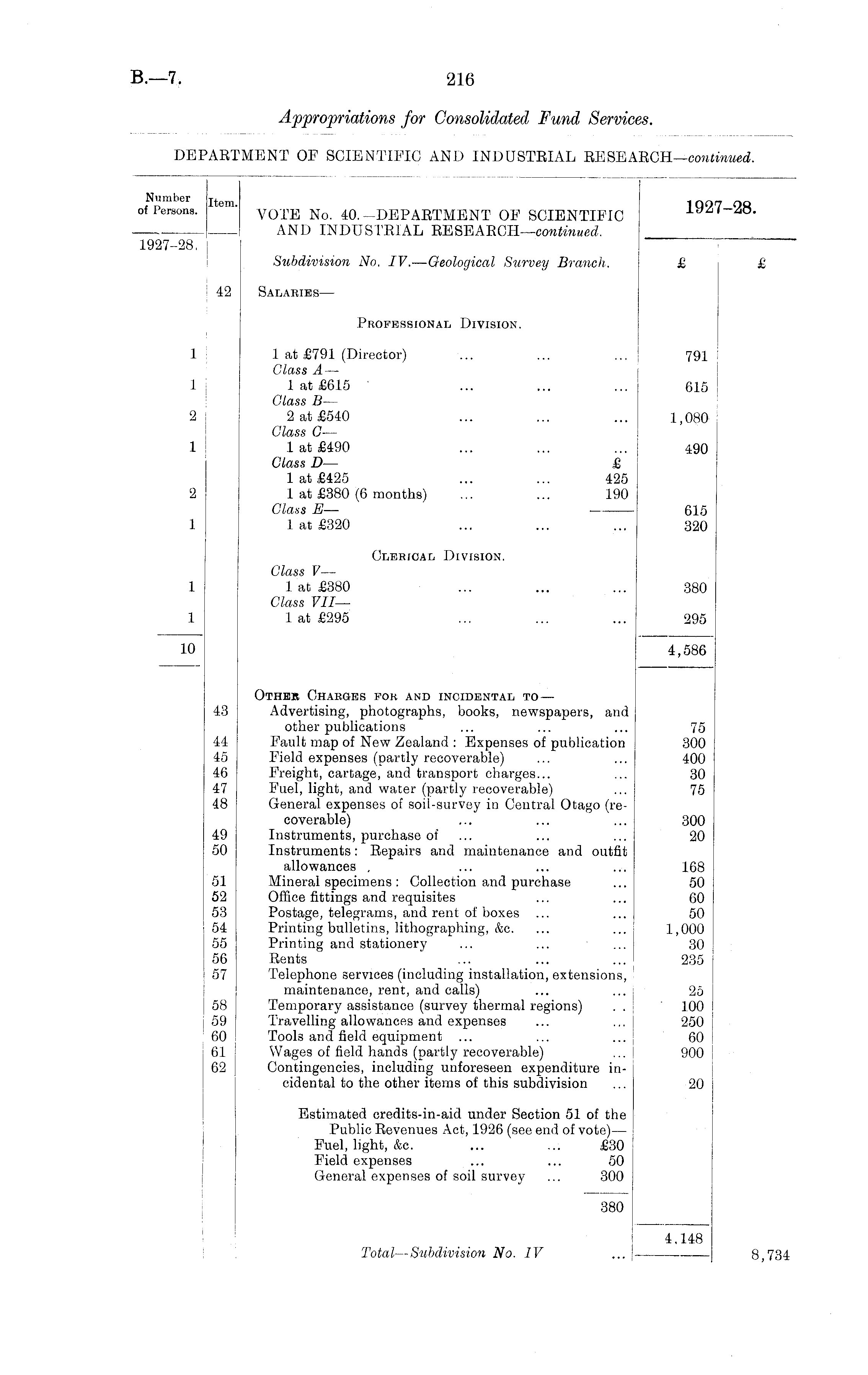 Number Item. 1007 90 of Persons. VOTE No. 40. —DEPARTMENT OE SCIENTIFIC LV&t-m. AND INDUSTRIAL RESEARCH—continued. 1927-28, Subdivision No. IV.—Geological Survey Branch. £ £ 42 Salaries — Professional Division. 1 1 at £791 (Director) ... ... ... 791 Class A — 1 1 at £615 ... ... ... 615 Glass B— 2 2 at £540 ... ... ... 1,080 Glass G— 1 1 at £490 ... ... ... 490 Class D— £ 1 at £425 ... ... 425 2 1 at £380 (6 months) ... ... 190 Glass E— — 615 1 1 at £320 ... ... ... 320 Clerical Division. Class V— 1 1 at £380 ... ... ... 380 Class VII— 1 1 at £295 ... ... ... 295 10 4,586 Other Charges for and incidental to — 43 Advertising, photographs, books, newspapers, and other publications ... ... ... 75 44 Fault map of New Zealand : Expenses of publication 300 45 Field expenses (partly recoverable) ... ... 400 46 Freight, cartage, and transport charges... ... 30 47 Fuel, light, and water (partly recoverable) ... 75 48 General expenses of soil-survey in Central Otago (recoverable) ... ... ... 300 49 Instruments, purchase of ... ... ... 20 50 Instruments: Repairs and maintenance and outfit allowances , ... ... ... 168 51 Mineral specimens: Collection and purchase ... 50 52 Office fittings and requisites ... ... 60 53 Postage, telegrams, and rent of boxes ... ... 50 54 Printing bulletins, lithographing, &c. ... ... 1,000 55 Printing and stationery ... ... ... 30 56 Rents ... ... ... 235 57 Telephone services (including installation, extensions, maintenance, rent, and calls) ... ... 25 58 Temporary assistance (survey thermal regions) . . 100 59 Travelling allowances and expenses ... ... 250 60 Tools and field equipment ... ... ... 60 61 Wages of field hands (partly recoverable) ... 900 62 Contingencies, including unforeseen expenditure incidental to the other items of this subdivision ... 20 Estimated credits-in-aid under Section 51 of the Public Revenues Act, 1926 (see end of vote) — Fuel, light, &c. ... ... £30 Field expenses ... ... 50 General expenses of soil survey ... 300 380 4,148 Total—Subdivision No. IV ... 8,734