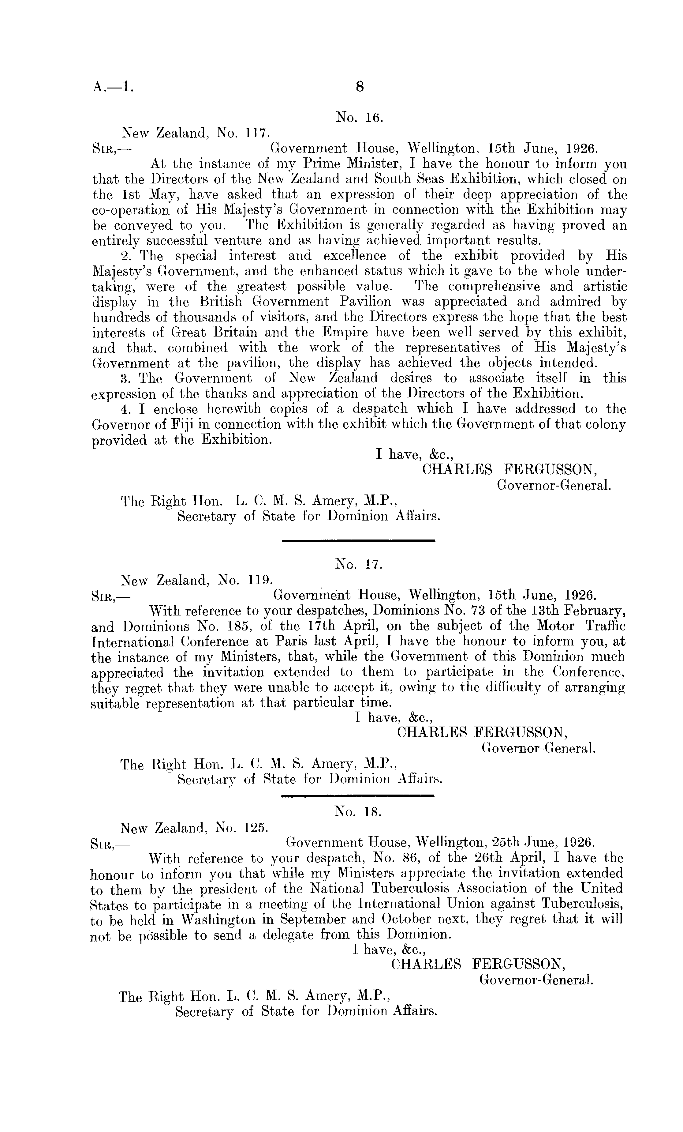 No. 16. New Zealand, No. 117. Sir, — Government House, Wellington, 15th June, 1926. At the instance of my Prime Minister, I have the honour to inform you that the Directors of the New Zealand and South Seas Exhibition, which closed on the Ist May, have asked that an expression of their deep appreciation of the co-operation of His Majesty's Government in connection with the Exhibition may be conveyed to you. The Exhibition is generally regarded as having proved an entirely successful venture and as having achieved important results. 2. The special interest and excellence of the exhibit provided by His Majesty's Government, and the enhanced status which it gave to the whole undertaking, were of the greatest possible value. The comprehensive and artistic display in the British Government Pavilion was appreciated and admired by hundreds of thousands of visitors, and the Directors express the hope that the best interests of Great Britain and the Empire have been well served by this exhibit, and that, combined with the work of the representatives of His Majesty's Government at the pavilion, the display has achieved the objects intended. 3. The Government of New Zealand desires to associate itself in this expression of the thanks and appreciation of the Directors of the Exhibition. 4. I enclose herewith copies of a despatch which I have addressed to the Governor of Fiji in connection with the exhibit which the Government of that colony provided at the Exhibition. I have, &c., CHABLES FEBGUSSON, Governor-General. The Bight Hon. L. C. M. S. Amery, M.8., Secretary of State for Dominion Affairs.