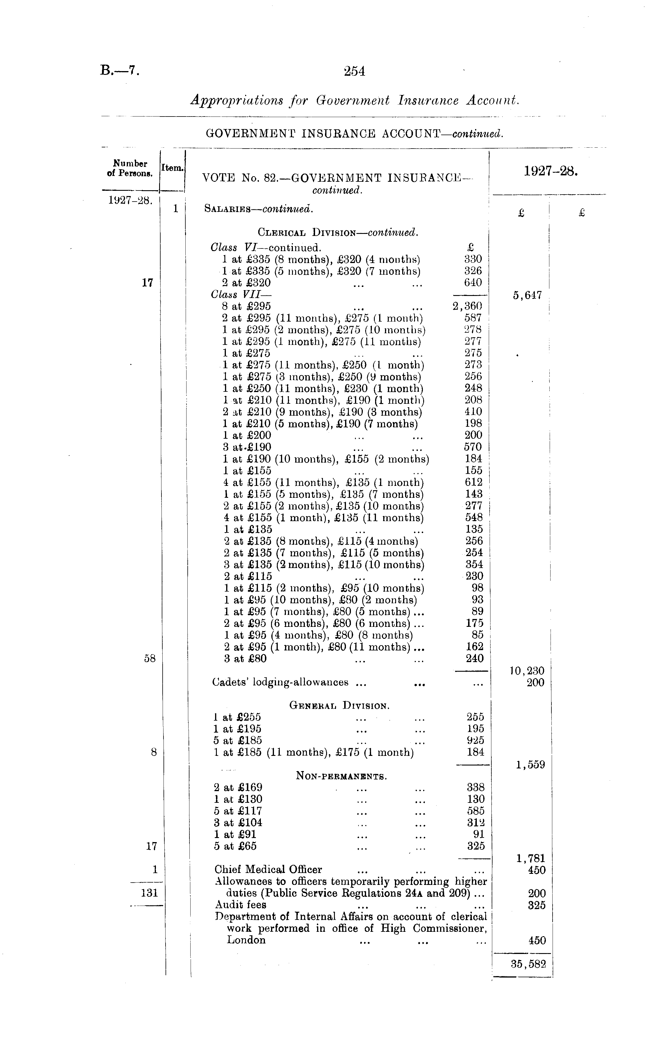 Number item. ! 1 QQ7_9U of Persons. VOTE No. 82.—GOVERNMENT INSURANCE- | L continued. j 1927-28. , . 1 Salaries—continued. £ £ Clerical Division —continued. Class VI—continued. £ 1 at £335 (8 months), £320 (4 months) 330 1 at £335 (5 months), £320 (7 months) 326 17 2 at £320 ... ... 640 Class VII — 5,617 8 at £295 ... ... 2,360 2 at £295 (11 months), £275 (1 month) 587 1 at £295 (2 months), £275 (10 months) 278 1 at £295 (1 month), £275 (11 months) 277 1 at £275 ... ... 275 1 at £275 (11 months), £250 (L month) 273 1 at £275 (3 months), £250 (9 months) 256 1 at £250 (11 months), £230 (1 month) 248 1 at £210 (11 months), £190 (1 month) 208 2 at £210 (9 months), £190 (3 months) 410 1 at £210 (5 months), £190 (7 months) 198 1 at £200 ... ... 200 3 at.£190 ... ... 570 1 at £190 (10 months), £155 (2 months) 184 1 at £155 ... ... 155 j 4 at £155 (11 months), £135 (1 month) 612 1 at £155 (5 months), £135 (7 months) 143 2 at £155 (2 months), £135 (10 months) 277 j 4 at £155 (1 month), £135 (11 months) 548 1 at £135 ... ... 135 2 at £135 (8 months), £115 (4 months) 256 2 at £135 (7 months), £115 (5 months) 254 3 at £135 (2 months), £115 (10 months) 354 2 at £115 ... ... 230 1 at £115 (2 months), £95 (10 months) 98 1 at £95 (10 months), £80 (2 months) 93 1 at £95 (7 months), £80 (5 months) ... 89 2 at £95 (6 months), £80 (6 months) ... 175 1 at £95 (4 months), £80 (8 months) 85 2 at £95 (1 month), £80 (11 months)... 162 58 3 at £80 ... ... 240 10,230 Cadets' lodging-allowances ... ... ... 200 General Division. 1 at £255 255 1 at £195 ... ... 195 5 at £185 ... ... 925 8 ! 1 at £185 (11 months), £175 (1 month) 184 1,559 Non-permanents. 2 at £169 ... ... 338 1 at £130 ... ... 130 5 at £117 ... ... 585 3 at £104 ... ... 312 1 at £91 ... ... 91 17 5 at £65 ... ... 325 1,781 1 l Chief Medical Officer ... ... ... 450 Allowances to officers temporarily performing higher 131 duties (Public Service Regulations 24a and 209) ... 200 Audit fees ... ... ... 325 Department of Internal Affairs on account of clerical work performed in office of High Commissioner, London ... ... ... 450 35,582 I