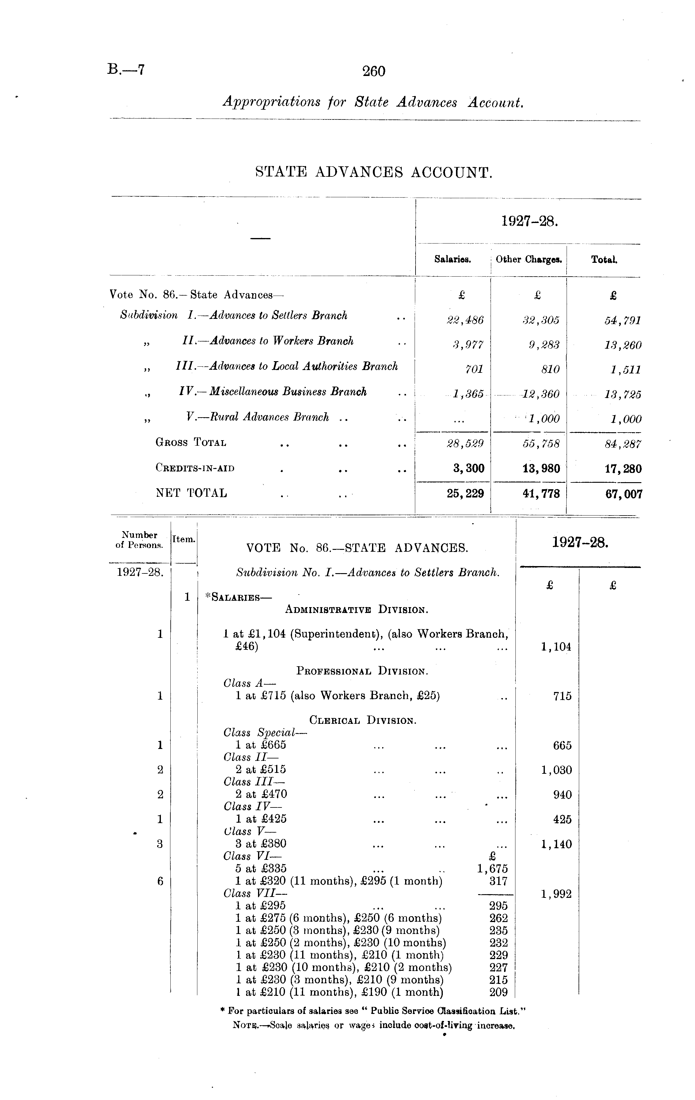 1927-28. i ~ j ; ~~ Salaries. Other Charges. Total. Vote No. 86.— State Advances— £ £ £ Subdivision I. —Advances to Settlers Branch .. 22 486 32 305 54 791 „ II. —Advances to Workers Branch .. 3 gyy g 283 13 260 ,, III. —Advances to Local Authorities Branch ?qi gjO 1 511 „ IV.— Miscellaneous Business Branch .. 1,365 12,360 13 725 ,, V.—Mural Advances Branch .. .. ... 1,000 1,000 GROSS TOTAL .. .. .. 28,529 55,758 84,287 Credits-I N-aid . .. .. 3,300 13,980 17,280 NET TOTAL . .. 25,229 41,778 67,007 Number { tem . 1Q97 no ofPersons - VOTE No. 86.—STATE ADVANCES. 1V4I-ZO. i 1927-28. 1 Subdivision No. I. —Advances to Settlers Branch. & £ 1 * Salaries— Administrative Division. 1 1 at £1,104 (Superintendent), (also Workers Branch, £46) ... ... ... 1,104 Professional Division. Glass A— 1 1 at £715 (also Workers Branch, £25) .. 715 Clerical Division. Class Special — 1 1 at £665 ... ... ... 660 Glass II— 2 2 at £515 ... ... .. 1,030 Class III— 2 2 at £470 ... ... ... 940 Class IV— 1 1 at £425 ... ... ... 425 Class V—3 3 at £380 ... ... ... 1,140 Class VI— £ 5 at £335 ... 1,675 6 1 at £320 (11 months), £295 (1 month) 317 Class VII— 1,992 1 at £295 ... ... 295 1 at £275 (6 months), £250 (6 months) 262 1 at £250 (3 months), £230(9 months) 235 1 at £250 (2 months), £230 (10 months) 232 1 at £230 (11 months), £210 (1 month) 229 1 at £230 (10 months), £210 (2 months) 227 1 at £230 (3 months), £210 (9 months) 215 1 at £210 (11 months), £190 (1 month) 209 * For particulars of salaries see " Public Service Classification List." Nor®.—.Scale salaries or wage i include cost-of-living increase.