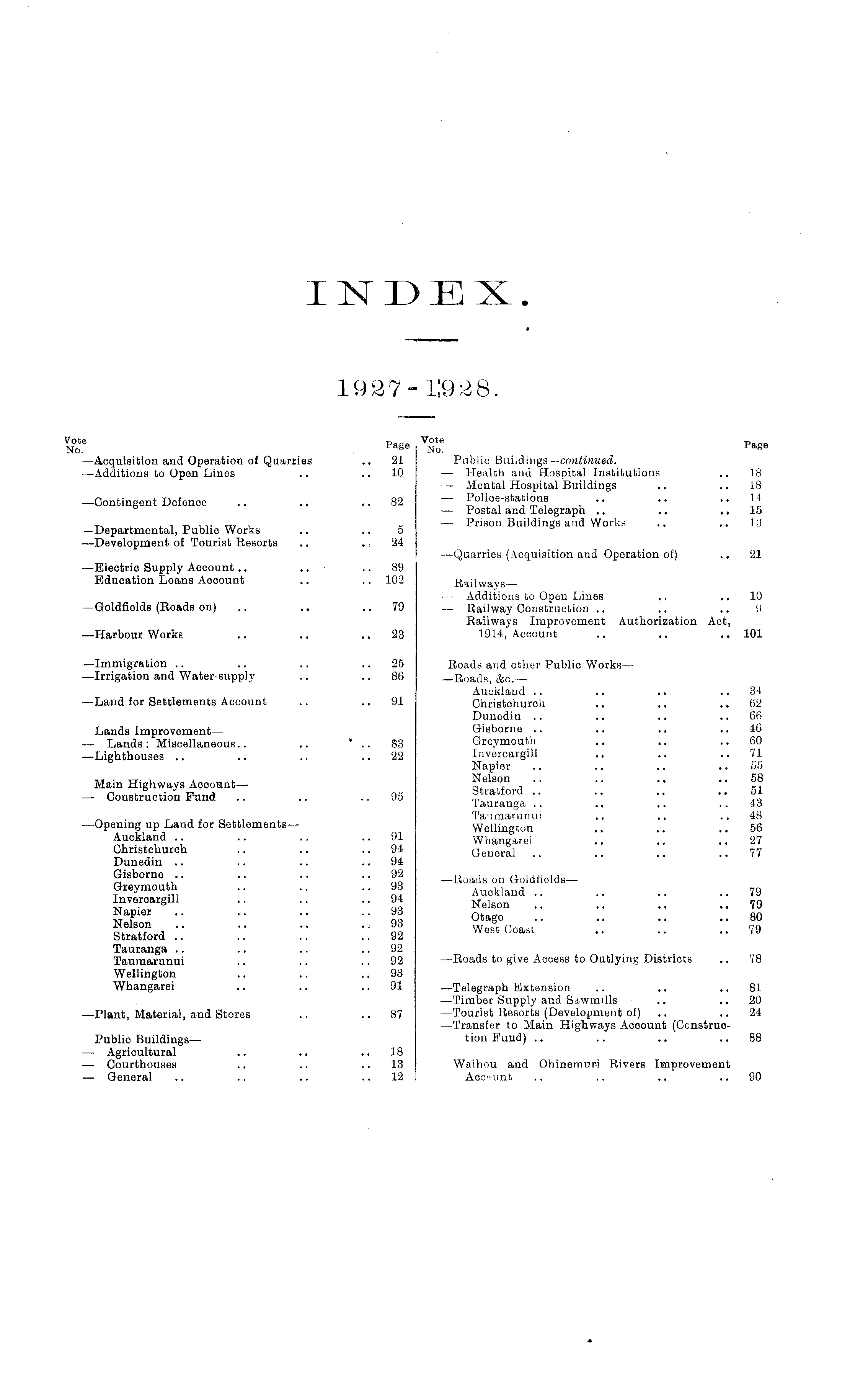 1927-1:928. No 6 Pa §" V No® Pa S 0 —Acquisition and Operation of Quarries .. 21 Public Buildings— continued. —Additions to Open Lines .. ..10 — Health aud Hospital Institutions .. 18 — Mental Hospital Buildings .. 18 -Contingent Defence .. .. ..82 ~ Polloe-Btations .. .. ..1-4 — Postal and Telegraph .. .. ..15 ,-n ,« T v er — Prison Buildings aud Works .. .. 13 —Departmental, Public Works .. 5 —Development of Tourist Resorts .. . : 24 —Quarries (Acquisition and Operation of) .. 21 —Electric Supply Aocount.. .. 89 Education Loans Aocount .. .. 102 Railwavs — Additions to Open Lines .. 10 —Goldfields (Roads on) .. .. ..79 — Railway Construction .. .. .. 9 Railways Improvement Authorization Act, —Harbour Works .. .. ..23 .1914, Account .. .. .. 101 —Immigration .. .. .. ..25 Roads and other Public Works — —Irrigation aud Water-supply .. ..86 Roads, &c. Auckland .. .. .. ..34 —Land for Settlements Account .. ..91 Christohurch .. .. ..62 Dunedin .. .. .. ..66 Lands Improvement— Gisborne .. .. .. 46 — Lands: Miscellaneous.. .. * 83 Greymouth .. .. ..60 —Lighthouses .. .. .. ..22 Invercargill .. .. ..71 Napier .. .. .. ..55 Main Highways Aocount— Stratford " " " 51 — Construction Fund .. .. ..95 Stratford .. .. .. Di lauranga .. .. .. .. 4d _ . , , Taumarunui .. .. 48 —Opening up Land for Settlements— Wellington .. .. ..56 Auckland .. .. .. 91 Whangarei .. .. 27 Chnstchuroh .. .. ..94 General .. .. .. ..77 Dunedin .. .. .. 94 Gisborne .. .. .. ..92 —Roads on Goldfields — Greymouth .. .. ..93 Auckland .. .. .. ..79 Invercargill .. .. ..94 Nelaon .. .. 79 Naf 6 * •' '• •' •' H Otago .. .. .. .. 80 a, els °, n , '■ " " "no West Coast .. .. ..79 Stratford .. .. .. 92 Tauranga .. .. .. 92 Taumarunui .. .. ..92 —Roads to give Access to Outlying Districts .. 78 Wellington .. .. 93 Whangarei .. .. ..91 —Telegraph Extension .. .. ..81 —Timber Supply and Sawmills .. ..20 —Plant, Material, and Stores .. ..87 —Tourist Resorts (Development of) .. ..24 —Transfer to Main Highways Account (ConstrucPublic Buildings— tion Fund) .. .. .. 88 — Agricultural .. .. ..18 — Courthouses .. .. ..13 Waihou and Ohinemnri Rivers Improvement — General .. .. .. ..12 Account .. .. .. ..90