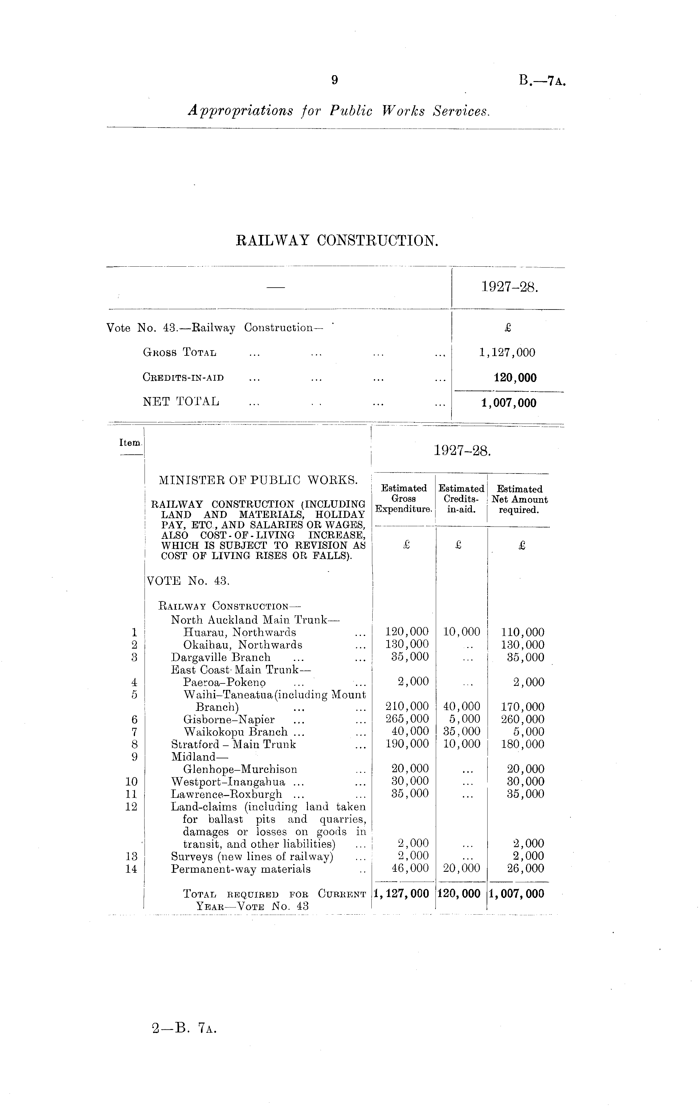 -— 1927-28. Vote No. 43. —Railway Construction— " £ GROSS TOTAL ... ... ... ... 1,127,000 Credits-IN-AID ... ... ... ... 120,000 NET TOTAL ... . . ... ... 1,007,000 | ™ 1927-28. MINISTER OF PUBLIC WORKS. „ Estimated Estimated j Estimated RAILWAY CONSTRUCTION (INCLUDING Net Amount LAND AND MATERIALS, HOLIDAY Ex P endlture - m " ald - | required. PAY, ETC , AND SALARIES OR WAGES, ALSO COST - OF - LIVING INCREASE, WHICH IS SUBJECT TO REVISION AS £ £ £ COST OE LIVING RISES OR FALLS). VOTE No. 43. Railway Construction— North Auckland Main Trunk— 1 Huarau, Northwards ... 120,000 10,000 110,000 2 Okaihau, Northwards ... 130,000 .. 130,000 3 Dargaville Branch ... ... 35,000 ... 35,000 East Coast- Main Trunk— 4 Paeroa-Pokeno ... ... 2,000 ... 2,000 5 Waihi-Taneatua(including Mount Branch) ... ... 210,000 40,000 170,000 6 Gisborne-Napier ... ... 265,000 5,000 260,000 7 Waikokopu Branch ... ... 40,000 35,000 5,000 8 Stratford - Main Trunk ... 190,000 10,000 180,000 9 Midland— Glenhope-Murchison ... 20,000 ... 20,000 10 Westport-Inangabua ... ... 30,000 ... 30,000 11 Lawrence-Roxburgh ... ... 35,000 ... 35,000 12 Land-claims (including land taken for ballast pits and quarries, damages or losses on goods in transit, and other liabilities) ... 2,000 ... 2,000 13 Surveys (new lines of railway) ... 2,000 ... 2,000 14 Permanent-way materials .. 46,000 20,000 26,000 Total required for Current 1,127,000 120,000 1,007,000 Year—Vote No. 43