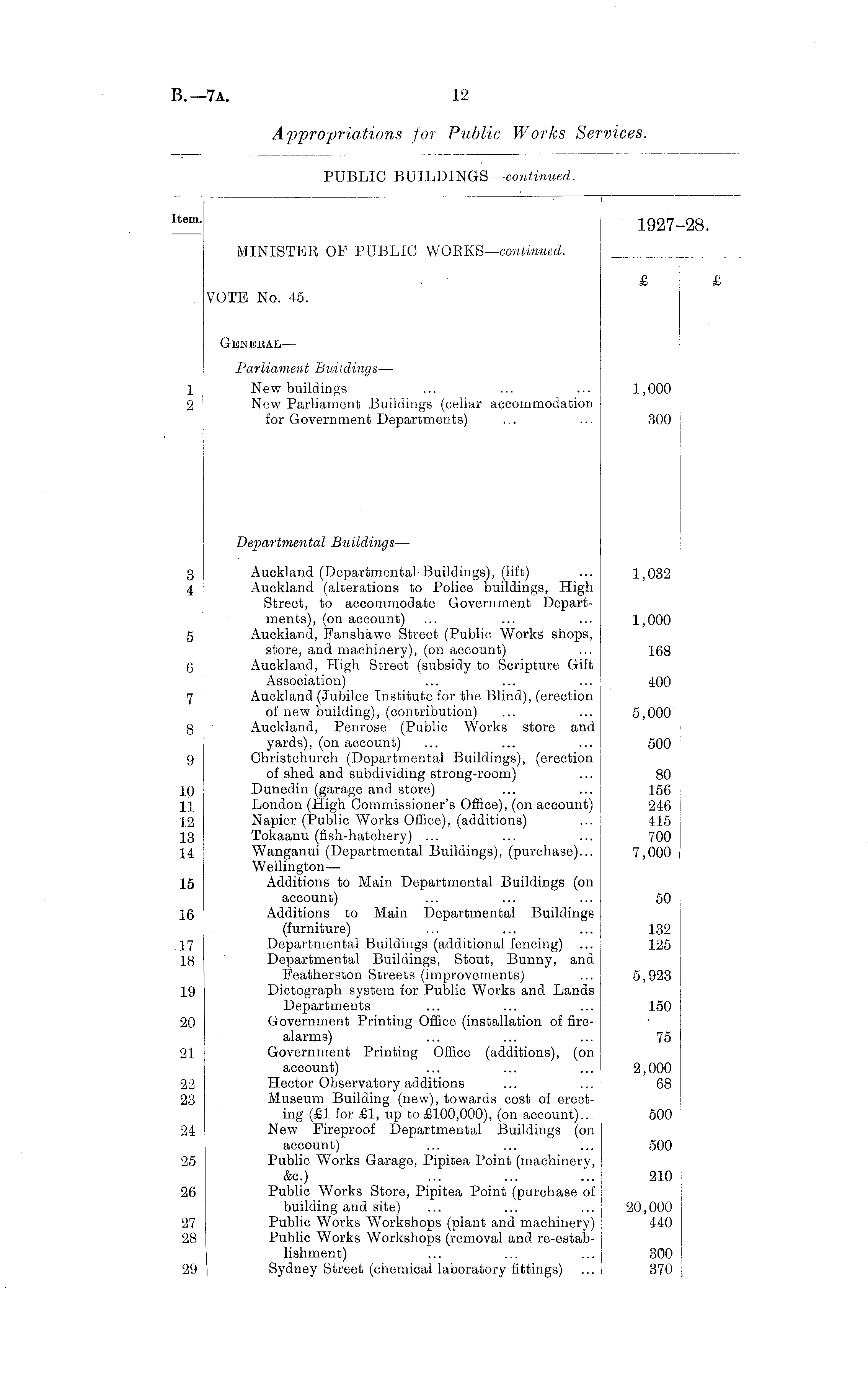 Item; 1927-28. MINISTBE OP PUBLIC \V011KS -continued. £ £ VOTE No. 45. General — Parliament Buildings — 1 New buildings ... ... ... 1,000 2 New Parliament Buildings (cellar accommodation for Government Departments) ... ... 300 Departmental Buildings— 3 Auckland (Departmental-Buildings), (lift) ... 1,032 4 Auckland (alterations to Police buildings, High Street, to accommodate Government Departments), (on account) ... ... ... 1,000 g Auckland, Fanshawe Street (Public Works shops, store, and machinery), (on account) ... 168 6 Auckland, High Street (subsidy to Scripture Gift Association) ... ... ... 400 7 Auckland (-Jubilee Institute for the Blind), (erection of new building), (contribution) ... ... 5,000 8 Auckland, Penrose (Public Works store and yards), (on account) ... ... ... 500 9 Christchurch (Departmental Buildings), (erection of shed and subdividing strong-room) ... 80 10 Dunedin (garage and store) ... ... 156 11 London (High Commissioner's Office), (on account) 246 12 Napier (Public Works Office), (additions) ... 415 13 Tokaanu (fish-hatchery) ... ... ... 700 14 Wanganui (Departmental Buildings), (purchase)... 7,000 Wellington— 15 Additions to Main Departmental Buildings (on account) ... ... ... 50 16 Additions to Main Departmental Buildings (furniture) ... ... ... 132 17 Departmental Buildings (additional fencing) ... 125 18 Departmental Buildings, Stout, Bunny, and Featherston Streets (improvements) ... 5,923 19 Dictograph system for Public Works and Lands Departments ... ... ... 150 20 Government Printing Office (installation of firealarms) ... ... ... 75 21 Government Printing Office (additions), (on account) ... ... ... 2,000 22 Hector Observatory additions ... ... 68 23 Museum Building (new), towards cost of erecting (£1 for £1, up to £100,000), (on account).. 500 24 New Fireproof Departmental Buildings (on account) ... ... ... 500 25 Public Works Garage, Pipitea Point (machinery, &c.) ... ... 210 26 Public Works Store, Pipitea Point (purchase of building and site) ... ... ... 20,000 27 Public Works Workshops (plant and machinery) 440 28 Public Works Workshops (removal and re-estab- | lishment) ... ... ... 300 29 I Sydney Street (chemical laboratory fittings) ... 370 |