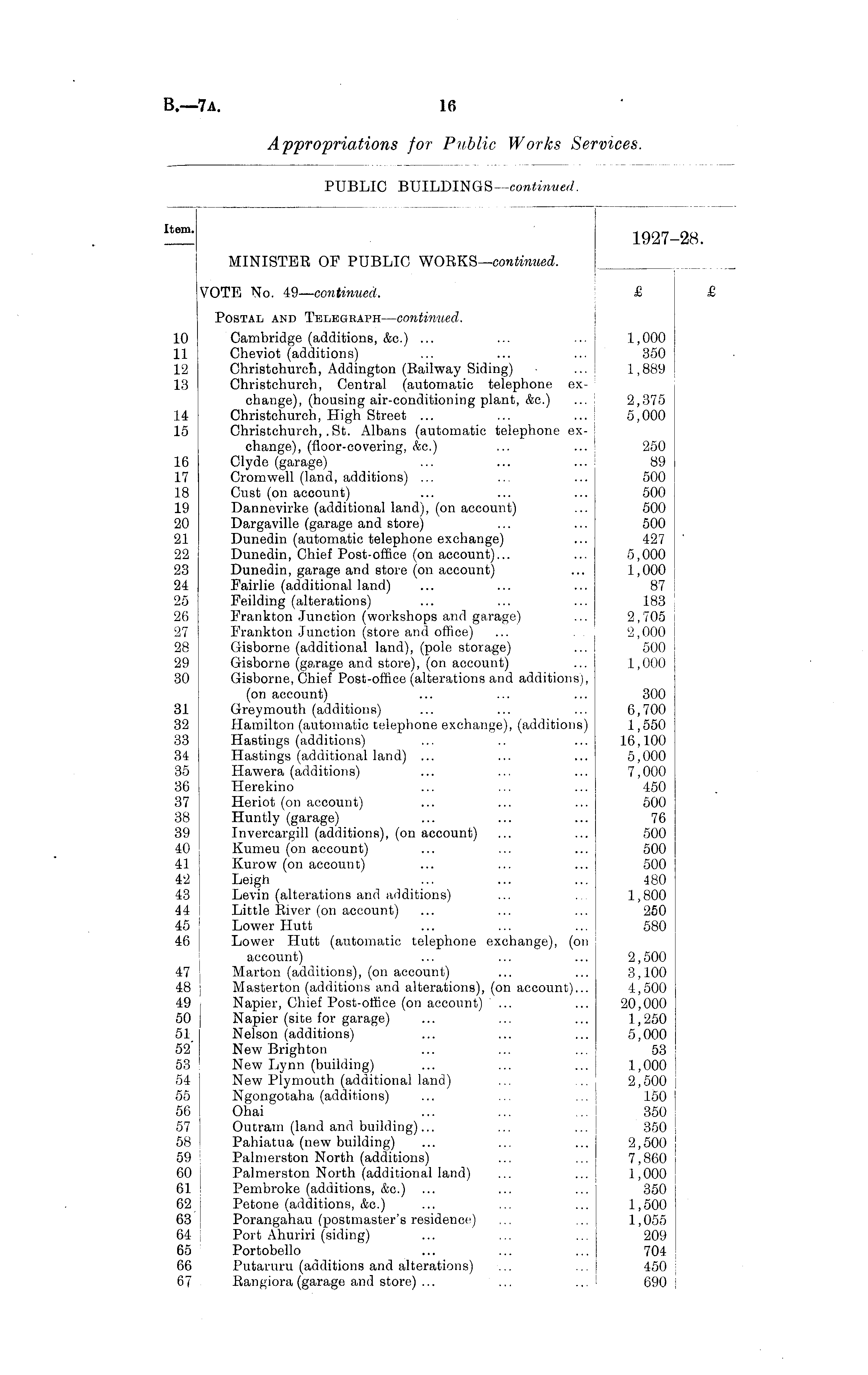 Item ' 1927-28. MINISTER OF PUBLIC WORKS—continued. VOTE No. 49—continued. £ £ Postal and Telegbaph—continued. 10 Cambridge (additions, &c.) ... ... ••• 1,000 11 Cheviot (additions) ... ... ... 350 12 Christchurch, Addington (Railway Siding) ... 1,889 13 Christchurch, Central (automatic telephone exchange), (housing air-conditioning plant, &c.) ... 2,375 14 Christchurch, High Street ... ... ... 5,000 15 Christchurch, .St. Albans (automatic telephone exchange), (floor-covering, &c.) ... ... 250 16 Clyde (garage) ... ... ... 89 17 Cromwell (land, additions) ... ... ... 500 18 Cust (on account) ... ... ... 500 19 Dannevirke (additional land), (on account) ... 500 20 Dargaville (garage and store) ... ... 500 21 Dunedin (automatic telephone exchange) ... 427 22 Dunedin, Chief Post-office (on account)... ... 5,000 23 Dunedin, garage and store (on account) ... 1,000 24 Fairlie (additional land) ... ... ... 87 25 Feilding (alterations) ... ... ... 183 26 Frankton Junction (workshops and garage) ... 2,705 27 Frankton Junction (store and office) ... 2,000 28 Gisborne (additional land), (pole storage) ... 500 29 Gisborne (garage and store), (on account) ... 1,000 •30 Gisborne, Chief Post-office (alterations and additions), (on account) ... ... ... 300 31 Greymouth (additions) ... ... ... 6,700 32 Hamilton (automatic telephone exchange), (additions) 1,550 33 Hastings (additions) ... .. ... 16,100 34 Hastings (additional land) ... ... ... 5,000 35 Hawera (additions) ... ... ... 7,000 36 Herekino ... ... ... 450 37 Heriot (on account) ... ... ... 500 38 Huntly (garage) ... ... ... 76 39 Invercargill (additions), (on account) ... ... 500 40 Kumeu (on account) ... ... ... 500 41 Kurow (on account) ... ... ... 500 42 Leigh ... ... ... 480 43 Levin (alterations and additions) ... . 1,800 44 Little River,(on account) ... ... ... 250 45 ! Lower Hutt ... ... ... 580 46 i Lower Hutt (automatic telephone exchange), (on account) ... ... ... 2,500 47 | Marton (additions), (on account) ... ... 3,100 48 j Masterton (additions and alterations), (on account)... 4,500 49 Napier, Chief Post-office (on account) ' ... ... 20,000 50 Napier (site for garage) ... ... ... 1,250 51 Nelson (additions) ... ... ... 5,000 52 New Brighton ... ... ... 53 53 New Lynn (building) ... ... ... 1,000 54 New Plymouth (additional land) ... ... 2,500 55 Ngongotaha (additions) ... ... ... 150 56 Ohai ... ... ... 350 57 Outram (land and building)... ... ... 350 58 Pahiatua (new building) ... ... ... 2,500 59 Palmerston North (additions) ... ... 7,860 60 Palmerston North (additional land) ... ... 1,000 61 Pembroke (additions, &c.) ... ... ... 350 62 Petone (additions, &c.) ... ... ... 1,500 63 Porangahau (postmaster's residence) ... ... 1,055 64 Port Ahuriri (siding) ... ... ... 209 65 Portobello ... ... ... 704 66 Putaruru (additions and alterations) ... ... 450 67 Rangiora(garage and store) ... ... ... 690