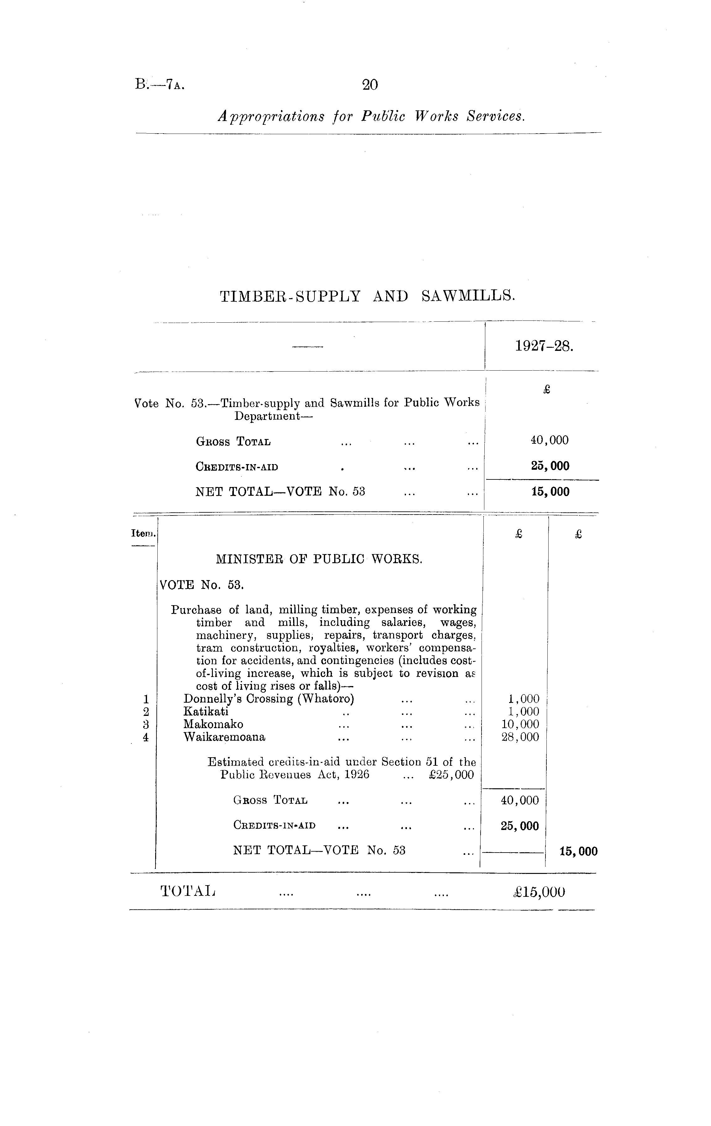 1927-28. ! £ Vote No. 53.—Timber-supply and Sawmills for Public Works Department — - Gboss Total ... ... ... 40,000 Cbedits-in-aid . ... ... 25,000 NET TOTAL—VOTE No. 53 ... ... 15,000 Item. £ £ MINISTER OP PUBLIC WORKS. VOTE No. 53. Purchase of land, milling timber, expenses of working timber and mills, including salaries, wages, machinery, supplies, repairs, transport charges, tram construction, royalties, workers' compensation for accidents, and contingencies (includes cost-of-living increase, which is subject to revision as cost of living rises or falls) — 1 Donnelly's Crossing (Whatoro) ... ... 1,000 2 Katikati .. ... ... 1,000 3 Makomako ... ... ... 10,000 4 Waikaremoana ... ... ... 28,000 Estimated credios-in-aid under Section 51 of the Public Revenues Act, 1926 ... £25,000 Gboss Total ... ... ... 40,000 Cbedits-in-aid ... ... ... 25,000 NET TOTAL—VOTE No. 53 ... 15,000 f TOTAL .... .... .... £15,000