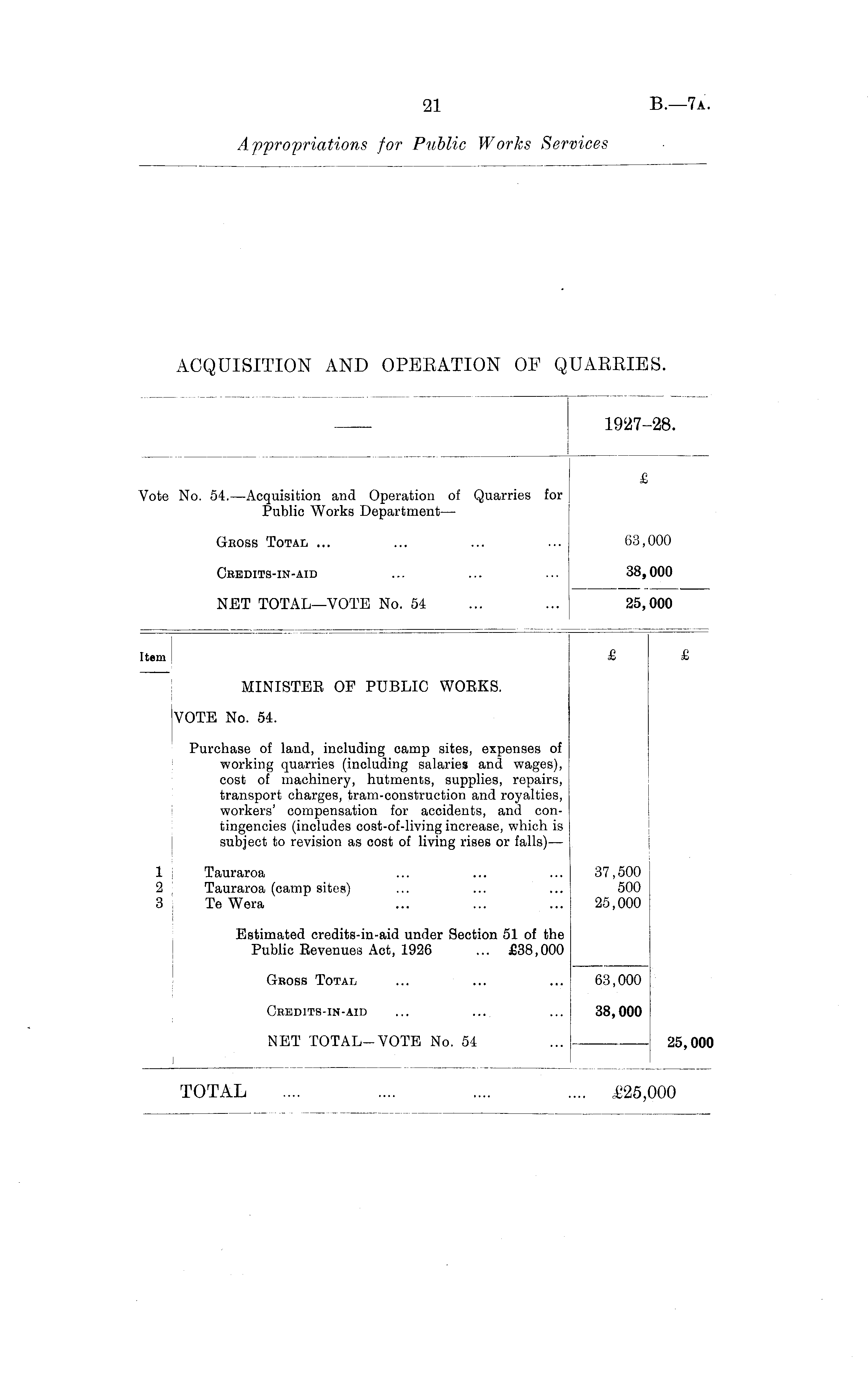 1927-28. £ Vote No. 54.—Acquisition and Operation of Quarries for Public Works Department— GHOSS Total ... ... ... ... 63,000 Credits-in-aid ... ... ... 38,000 NET TOTAL—VOTE No. 54 ... ... 25,000 Item £ £ MINISTER OF PUBLIC WORKS. VOTE No. 54. Purchase of land, including camp sites, expenses of working quarries (including salaries and wages), cost of machinery, hutments, supplies, repairs, transport charges, tram-construction and royalties, workers' compensation for accidents, and contingencies (includes cost-of-living increase, which is subject to revision as cost of living rises or falls) — 1 Tauraroa ... ... ... 37,500 2 Tauraroa (camp sites) ... ... ... 500 3 Te Wera ... ... ... 25,000 Estimated credits-in-aid under Section 51 of the Public Revenues Act, 1926 ... £38,000 Gross Total ... ... ... 63,000 1 Credits-in-aid ... ... ... 38,000 NET TOTAL-VOTE No. 54 ... 25,000 I ' TOTAL .... .... .... .... <£25,000