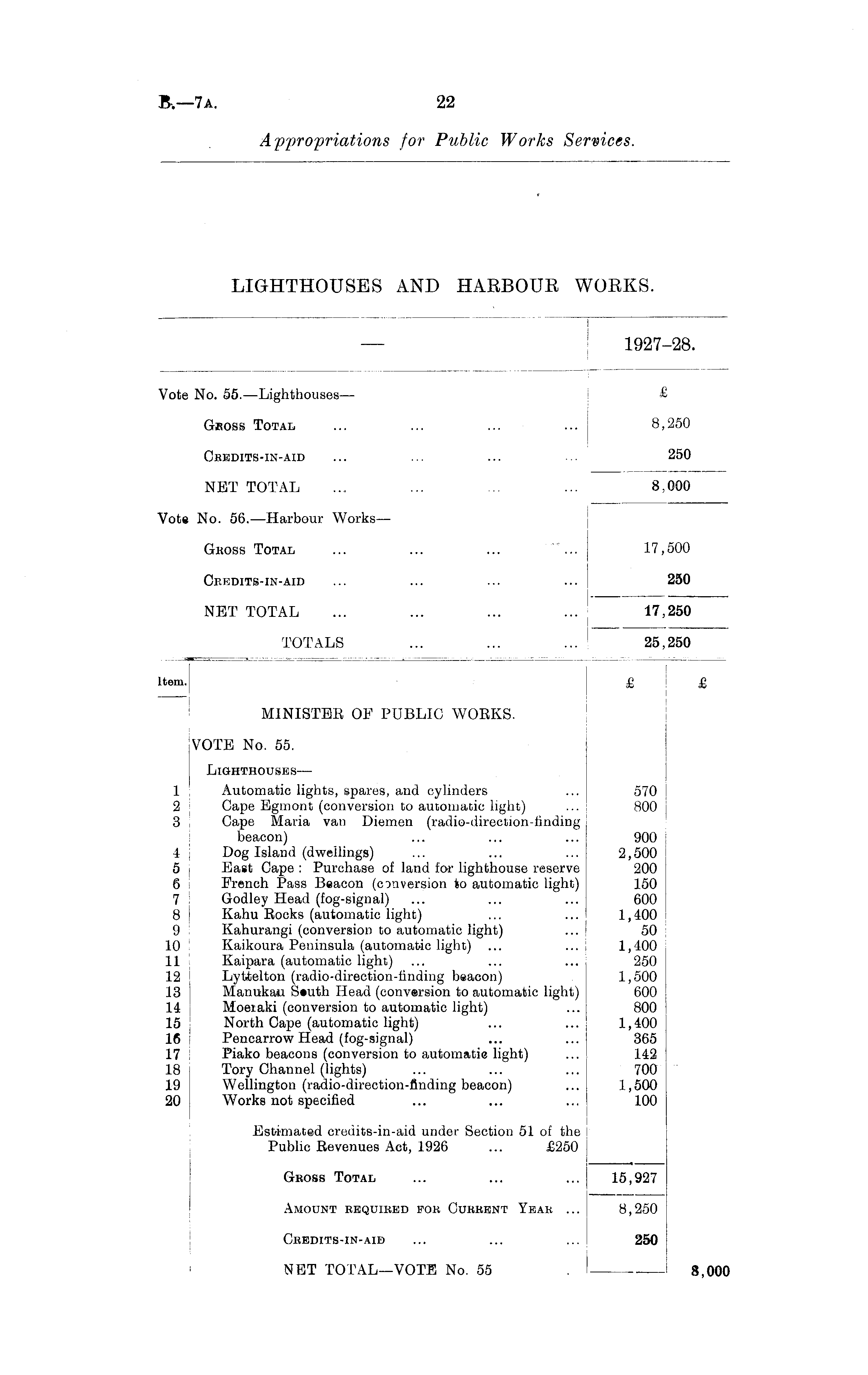 1927-28. Vote No. 55.—Lighthouses— £ GEOSS Total ... ... ... ... 8,250 Credits-in-aid ... ... ... ... 250 NET TOTAL ... ... ... ... 8,000 Vote No. 56.—Harbour Works — Gross Total ... ... ... ... 17,500 Credits-in-aid ... ... ... ... 250 NET TOTAL ... ... ... ... 17,250 TOTALS ... ... ... 25,250 Item. £ £ MINISTER OF PUBLIC WORKS. VOTE No. 55. Lighthouses— 1 Automatic lights, spares, and cylinders ... 570 2 Cape Egmont (conversion to automatic light) ... 800 3 Cape Maria van Diemen (radio-direction-findiDg beacon) ... ... ... 900 4 Dog Island (dwellings) ... ... ... 2,500 5 East Cape : Purchase of land for lighthouse reserve 200 6 French Pass Beacon (conversion to automatic light) 150 7 Godley Head (fog-signal) ... ... ... 600 8 Kahu Rocks (automatic light) ... ... 1,400 9 Kahurangi (conversion to automatic light) ... 50 10 Kaikoura Peninsula (automatic light) ... ... 1,400 11 Kaipara (automatic light) ... ... ... 250 12 Lyttelton (radio-direction-finding beacon) 1,500 13 Manukau S«uth Head (conversion to automatic light) 600 14 Moeiaki (conversion to automatic light) ... 800 15 North Cape (automatic light) ... ... 1,400 16 Pencarrow Head (fog-signal) ... ... 365 17 Piako beacons (conversion to automatic light) ... 142 18 Tory Channel (lights) ... ... ... 700 19 Wellington (radio-direction-finding beacon) ... 1,500 20 Works not specified ... ... ... 100 Estimated credits-in-aid under Section 51 of the Public Revenues Act, 1926 ... £250 GROSS Total ... ... ... 15,927 Amount required for Current Year ... 8,250 Credits-in-aid ... ... ... 250 NET TOTAL—VOTE No. 55 . — 8,000