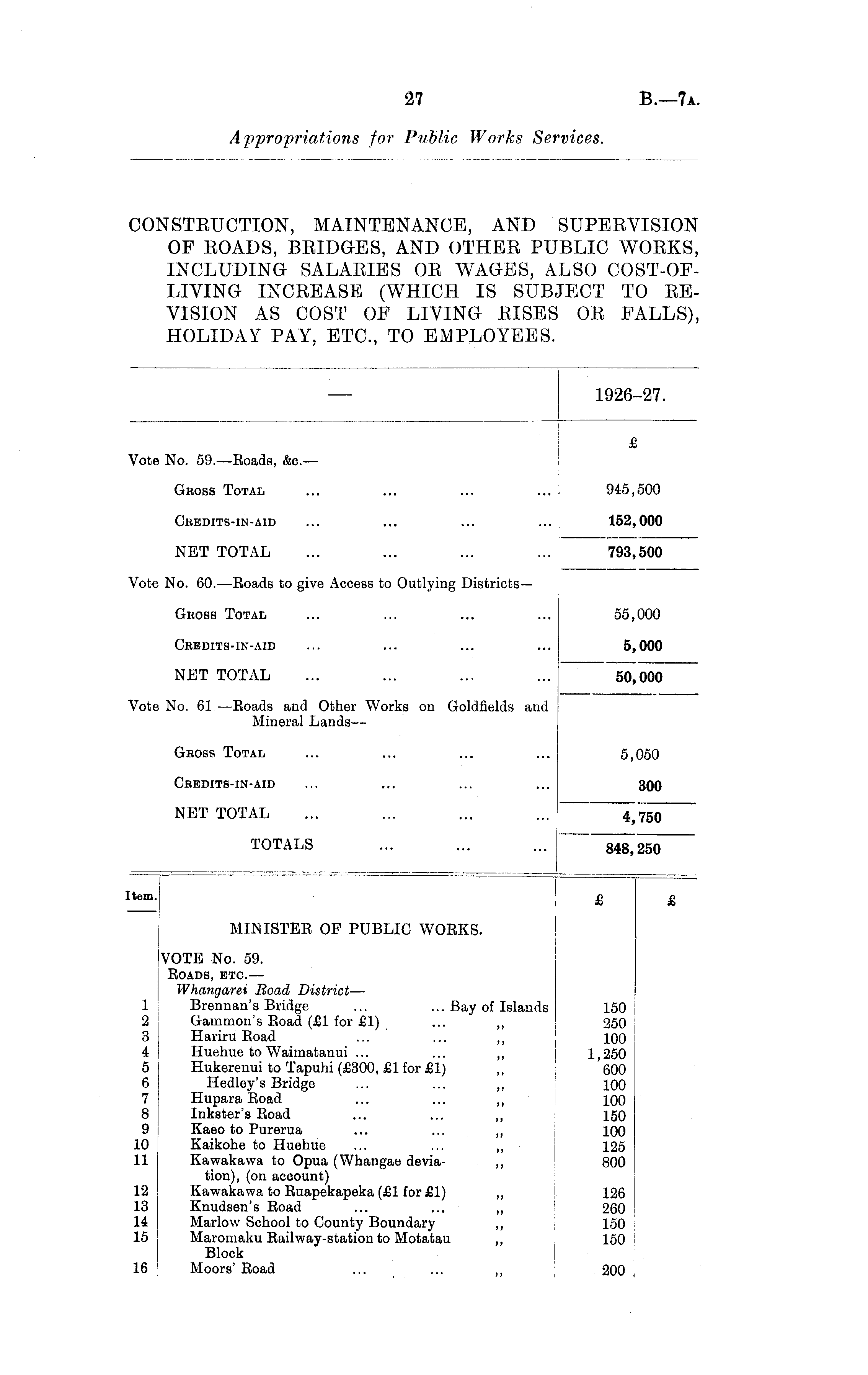 — 1926-27. £ Vote No. 59.—Roads, &c.— GEOSS Total ... ... ... ... 945,500 Cbedits-in-aid ... ... ... ... 152,000 NET TOTAL ... ... ... ... 793,500 Vote No. 60.—Roads to give Access to Outlying Districts— Ghobs TOTAL ... ... ... ... 55,000 Cbedits-in-aid ... ... ... ... 5,000 NET TOTAL ... ... ... 50,000 Vote No. 61 —Eoads and Other Works on Goldfields and Mineral Lands— GHOSS Total ... ... ... ... 5,050 Credits-IN-AID ... ... ... ... 300 NET TOTAL ... ... ... ... 4^750 TOTALS ... ... ... 848,250 Item. jg £ MINISTER OF PUBLIC WORKS. VOTE No. 59. Roads, etc. — Whangarei Road District— 1 Brennan's Bridge ... ... Bay of Islands 150 2 Gammon's Road (£1 for £1) ... ,, 250 3 Hariru Road ... ... ,, t 100 4 Huehue to Waimatanui ... ... ,, 1,250 5 Hukerenui to Tapuhi (£300, £1 for £1) ,, 600 6 Hedley's Bridge ... ... „ 100 7 Hupara Road ... ... „ 100 8 Inkster's Road ... ... ,, 150 9 Kaeo to Purerua ... ... ,, 100 10 Kaikohe to Huehue ... ... ,, 125 11 Kawakawa to Opua (Whangae devia- ,, 800 tion), (on account) 12 Kawakawa to Ruapekapeka (£1 for £1) ,, 126 13 Knudsen's Road ... ... ,, 1 260 14 Marlow School to County Boundary ,, 150 15 Maromaku Railway-station to Motatau ,, 150 Block 16 Moors' Road ... ... ,, 200