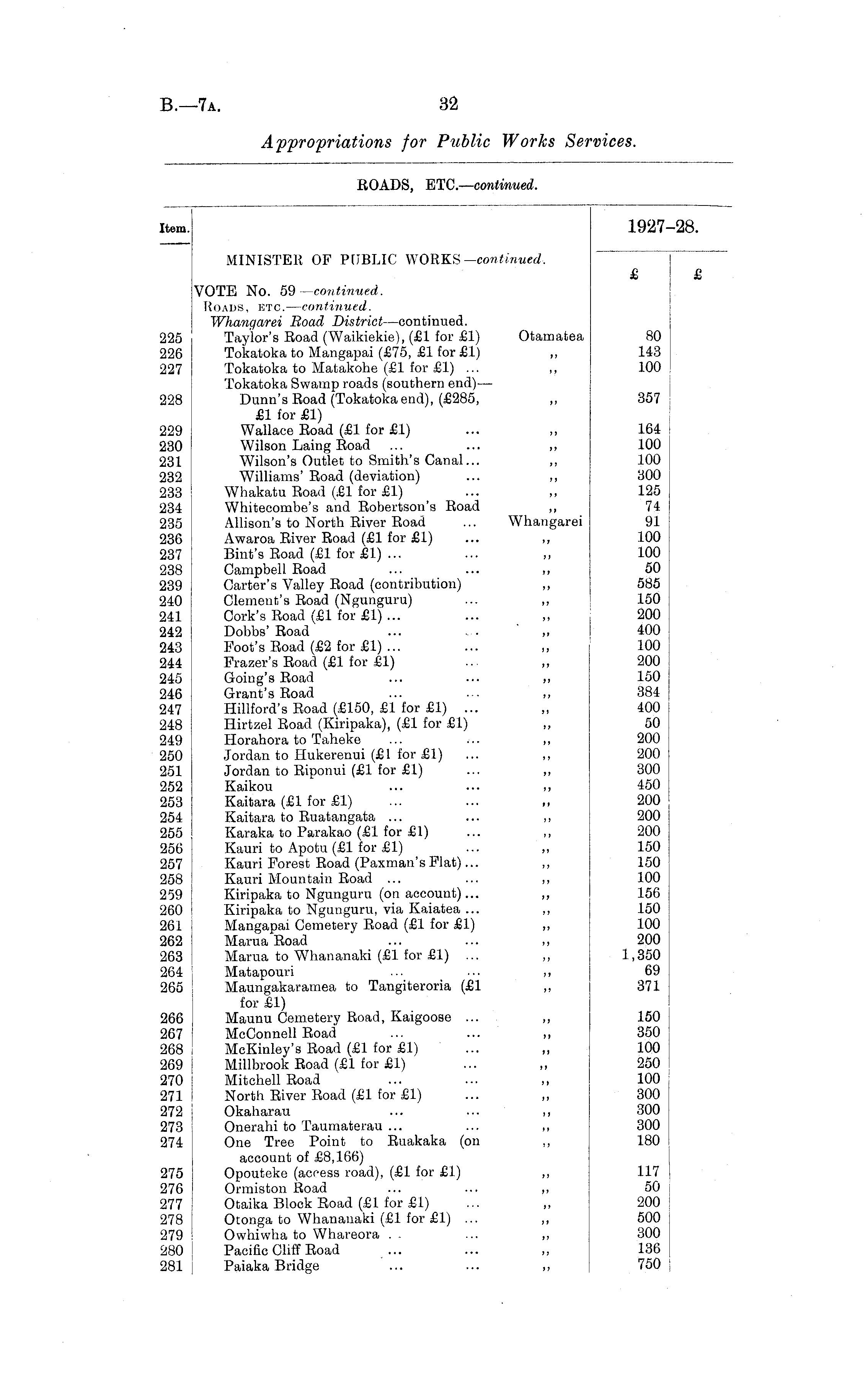 Item. 1927—28. MINISTER OF PUBLIC WORKS —continued. £ £ VOTE No. 59 —continued. Roads, etc. —continued. Whangarei Road District—continued. 225 Taylor's Road (Waikiekie), (£1 for £1) Otamatea 80 226 Tokatoka to Mangapai (£75, £1 for £1) ,, 143 227 Tokatoka to Matakohe (£1 for £1) ... ,, 100 Tokatoka Swamp roads (southern end) — 228 Dunn's Road (Tokatokaend), (£285, ,, 357 £1 for £1) 229 Wallace Road (£1 for £1) ... „ 164 230 Wilson Laing Road ... ... ,, 100 231 Wilson's Outlet to Smith's Canal... ,, 100 232 Williams' Road (deviation) ... ,, 300 233 Whakatu Road (£1 for £1) ... ,, 125 234 Whitecombe's and Robertson's Road ,, 74 235 Allison's to North River Road ... Whangarei 91 236 Awaroa River Road (£1 for £1) ... ,, 100 237 Bint's Road (£1 for £1) ... ... ,, 100 238 Campbell Road ... ... ,, 50 239 Carter's Valley Road (contribution) ,, 585 240 Clement's Road (Ngunguru) ... „ 150 241 Cork's Road (£1 for £1) ... ... ,, 200 242 Dobbs' Road ... . . ,, 400 243 Foot's Road (£2 for £1) ... ... ,, 100 244 Frazer's Road (£1 for £1) ... ,, 200 245 Going's Road ... ... ,, 150 246 Grant's Road ... ... ,, 384 247 Hillford's Road (£150, £1 for £1) ... „ 400 248 Hirtzel Road (Kiripaka), (£1 for £1) ,, 50 249 Horahora to Taheke ... ... ,, 200 250 Jordan to Hukerenui (£1 for £1) ... ,, 200 251 Jordan to Riponui (£1 for £1) ... ,, 300 252 Kaikou ... ... ,, 450 253 Kaitara (£1 for £1) ... ... ,, 200 254 Kaitara to Ruatangata ... ... ,, 200 255 Karaka to Parakao (£1 for £1) ... ,, 200 256 Kauri to Apotu (£1 for £1) ... ,, 150 257 Kauri Forest Road (Paxman's Flat)... ,, 150 258 Kauri Mountain Road ... ... ,, 100 259 Kiripaka to Ngunguru (on account)... ,, 156 260 Kiripaka to Ngunguru, via Kaiatea ... ,, 150 261 Mangapai Cemetery Road (£1 for £1) ,, 100 262 Marua Road ... ... ,, 200 263 Marua to Whananaki (£1 for £1) ... ,, 1,350 264 Matapouri ... ... ,, 69 265 Maungakaramea to Tangiteroria (£1 ,, 371 for £1) 266 Maunu Cemetery Road, Kaigoose ... ,, 150 267 McConnell Road ... ... „ 350 268 McKinley's Road (£1 for £1) ... „ 100 269 Millbrook Road (£1 for £1) ... „ 250 270 Mitchell Road ... ... ,, 100 271 North River Road (£1 for £1) ... ,, 300 272 Okaharau ... ... ,, 300 273 Onerahi to Taumaterau ... ... „ 300 274 One Tree Point to Ruakaka (on ,, 180 account of £8,166) 275 Opouteke (access road), (£1 for £1) ,, 117 276 Ormiston Road ... ... ,, 50 277 Otaika Block Road (£1 for £1) ... ,, 200 278 Otonga to Whananaki (£1 for £1) ... ,, 500 279 Owhiwha to Whareora . . ... ,, 300 280 Pacific Cliff Road ... ... ,, 136 281 Paiaka Bridge ... ... ,, 750