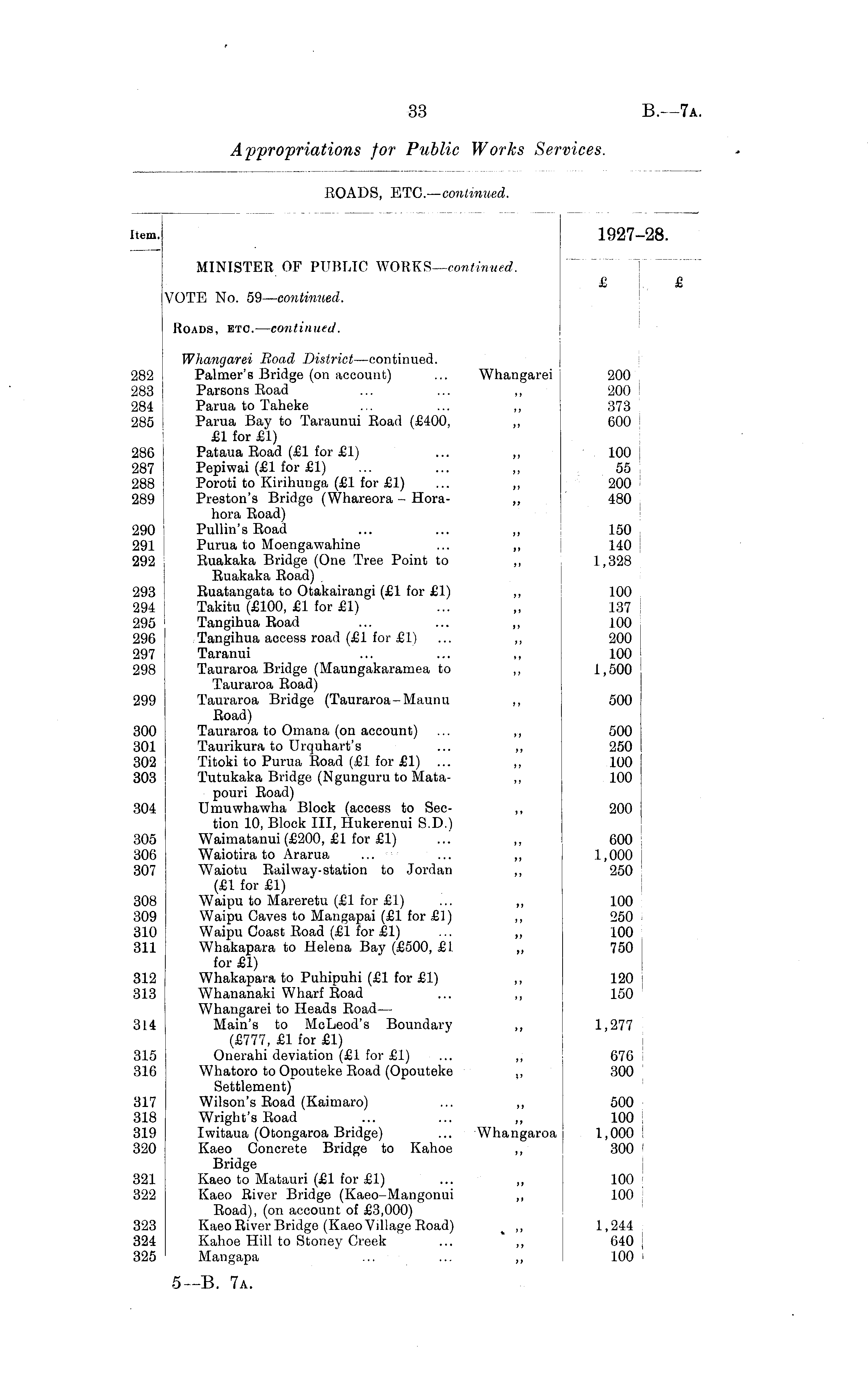 Item. 1927—28. MINISTER OF PUBLIC WORKS—continued. £ £ VOTE No. 59—continued. Roads, etc. —continued. Whangarei Road District—continued. 282 Palmer's Bridge (on account) ... Whangarei 200 283 Parsons Road ... ... „ 200 284 Parua to Taheke ... ... ,, 373 285 Parua Bay to Taraunui Road (£400, ,, 600 £1 for £1) 286 Pataua Road (£1 for £1) ... ,, 100 287 Pepiwai (£1 for £1) ... ... ,, 55 288 Poroti to Kirihunga (£1 for £1) ... ,, 200 289 Preston's Bridge (Whareora - Hora- ,, 480 hora Road) 290 Pullin's Road ... ... ,, 150 291 Purua to Moengawahine ... „ 140 292 Ruakaka Bridge (One Tree Point to ,, 1,328 Ruakaka Road), 293 Ruatangata to Otakairangi (£1 for £1) „ 100 294 Takitu (£100, £1 for £1) ... ,, 137 295 Tangihua Road ... ... ,, 100 296 Tangihua access road (£1 for £ I) ... ,, 200 297 Taranui ... ... ,, 100 298 Tauraroa Bridge (Maungakaramea to ,, 1,500 Tauraroa Road) 299 Tauraroa Bridge (Tauraroa -Maunu ,, 500 Road) 300 Tauraroa to Omana (on account) ... ,, 500 301 Taurikura to Urquhart's ... ,, 250 302 Titoki to Purua Road (£1 for £1) ... ,, 100 303 Tutukaka Bridge (Ngunguru to Mata- ,, 100 pouri Road) 304 Umuwhawha Block (access to Sec- ,, 200 tion 10, Block III, Hukerenui S.D.) 305 Waimatanui (£200, £1 for £1) ... ,, 600 306 Waiotira to Ararua ... ... ,, 1,000 307 Waiotu Railway-station to Jordan ,, 250 (£1 for £1) 308 Waipu to Mareretu (£1 for £1) ... ,, 100 309 Waipu Oaves to Mangapai (£1 for £1) ,, 250 310 Waipu Coast Road (£1 for £1) ... ,, 100 311 Whakapara to Helena Bay (£500, £1 ,, 750 for £1) 312 Whakapara to Puhipuhi (£1 for £1) ,, 120 313 Whananaki Wharf Road ... ,, 150 Whangarei to Heads Road—• 314 Main's to McLeod's Boundary ,, 1,277 (£777, £1 for £1) 315 Onerahi deviation (£1 for £1) ... ,, 676 316 Whatoro to Opouteke Road (Opouteke ,, 300 Settlement) 317 Wilson's Road (Kaimaro) ... ,, 500 318 Wright's Road ... ... ,, 100 319 Iwitaua (Otongaroa Bridge) ... Whangaroa 1,000 , 320 Kaeo Concrete Bridge to Kahoe ,, 300 ' Bridge 321 Kaeo to Matauri (£1 for £1) ... ,, 100 322 Kaeo River Bridge (Kaeo-Mangonui ,, 100 Road), (on account of £3,000) 323 Kaeo River Bridge (Kaeo Village Road) % ,, 1,244 324 Kahoe Hill to Stoney Creek ... ,, 640 j 325 Mangapa ... ... ,, 100 1