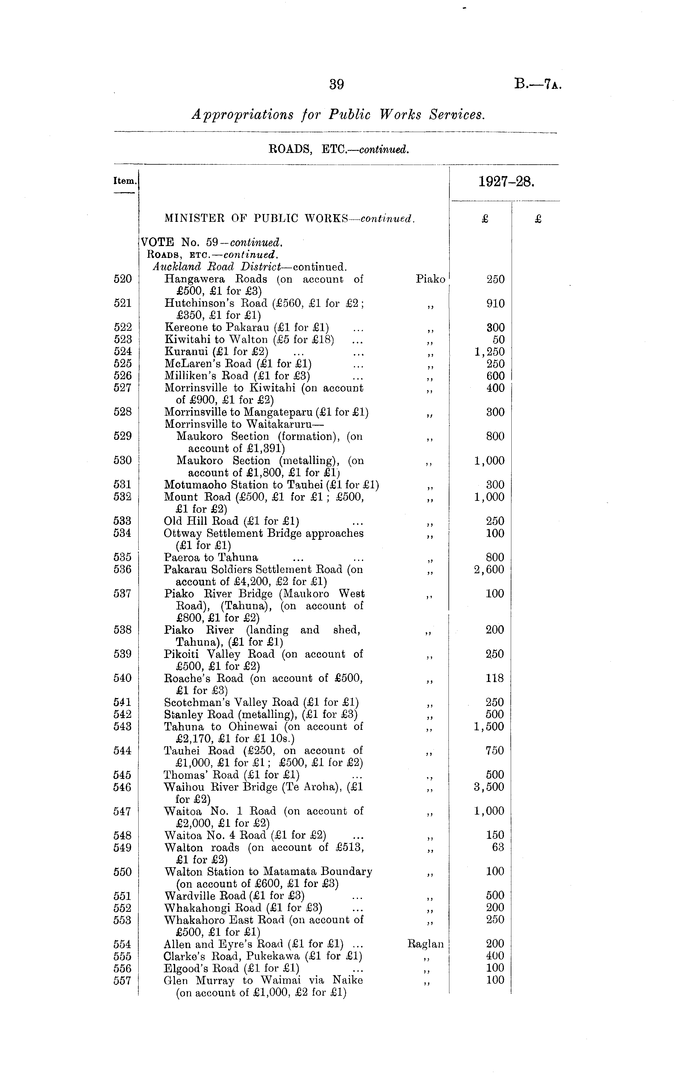 Item. 1927-28. MINISTER OF PUBLIC WORKS —continued. £ £ VOTE No. 59 — continued. Roads, etc. —continued. Auckland Road District—continued. 520 Hangawera Roads (on account of Piako 250 £500, £1 for £3) 521 Hutchinson's Road (£560, £1 for £2; ,, 910 £350, £1 for £1) 522 Kereone to Pakarau (£1 for £1) ... ,, 300 523 Kiwitahi to Walton (£5 for £18) ... ,, 50 524 Kuranui (£1 for £2) ... ... ,, 1,250 525 McLaren's Road (£1 for £1) ... ,, 250 526 Milliken's Road (£1 for £3) ... ,, 600 527 Morrinsville to Kiwitahi (on account ,, 400 of £900, £1 for £2) 528 Morrinsville to Mangateparu (£1 for £1) ,, 300 Morrinsville to Waitakaruru— 529 Maukoro Section (formation), (on ,, 800 account of £1,391) 530 Maukoro Section (metalling), (on ,, 1,000 account of £1,800, £1 for £lj 531 Motumaoho Station to Tauhei (£1 for £1) ,, 300 532 Mount Road (£500, £1 for £1; £500, „ 1,000 £1 for £2) 533 Old Hill Road (£1 for £1) ... ,, 250 534 Ottway Settlement Bridge approaches ,, 100 (£1 for £1) 535 Paeroa to Tahuna ... ... „ 800 536 Pakarau Soldiers Settlement Road (on ,, 2,600 account of £4,200, £2 for £1) 537 Piako River Bridge (Maukoro West ,, 100 Road), (Tahuna), (on account of £800, £1 for £2) 538 Piako River (landing and shed, ,, 200 Tahuna), (£1 for £1) 539 Pikoiti Valley Road (on account of ,, 250 £500, £1 for £2) 540 Roache's Road (on account of £500, ,, 118 £1 for £3) 541 Scotchman's Valley Road (£1 for £1) ,, 250 542 Stanley Road (metalling), (£1 for £3) ,, 500 543 Tahuna to Ohinewai (on account of ,, 1,500 £2,170, £1 for £1 10s.) 544 Tauhei Road (£250, on account of ,, 750 £1,000, £1 for £1; £500, £1 for £2) 545 Thomas' Road (£1 for £1) ... ,, 500 546 Waihou River Bridge (Te Aroha), (£1 ,, 3,500 for £2) 547 Waitoa No. 1 Road (on account of ,, 1,000 £2,000, £1 for £2) 548 Waitoa No. 4 Road (£1 for £2) ... ,, 150 549 Walton roads (on account of £513, ,, 63 £1 for £2) 550 Walton Station to Matamata Boundary ,, 100 (on account of £600, £1 for £3) 551 Wardville Road (£1 for £3) ... ,, 500 552 Whakahongi Road (£1 for £3) ... ,, 200 553 Whakahoro East Road (on account of ,, 250 £500, £1 for £1) 554 Allen and Eyre's Road (£1 for £1) ... Raglan 200 555 Clarke's Road, Pukekawa (£1 for £1) ,, 400 556 Elgood's Road (£1 for £1) ... „ 100 557 Glen Murray to Waimai via Naike ,, 100 (on account of £1,000, £2 for £1)