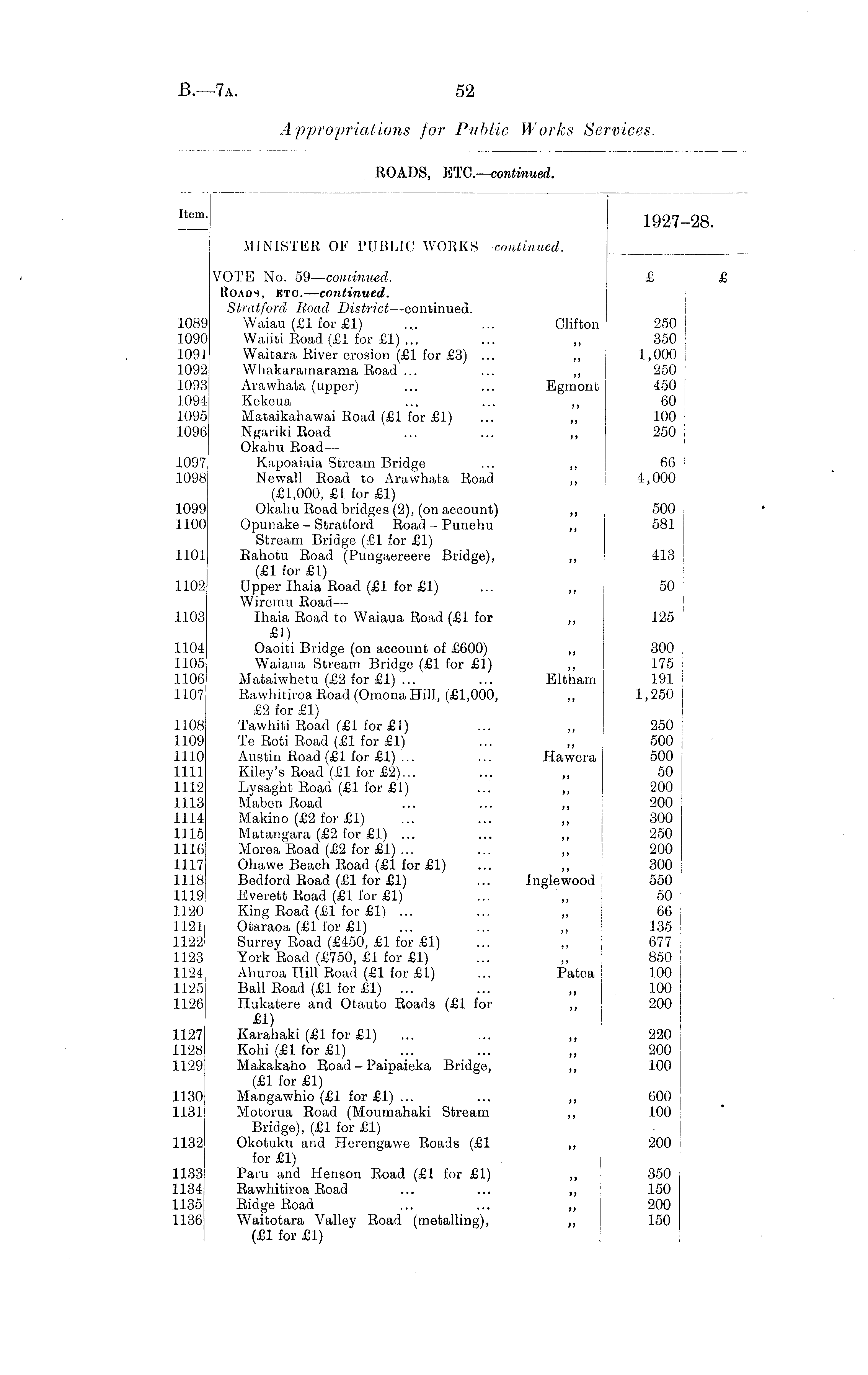 Item; 1927-28. MINISTER OF PUBLIC WORKS—continued. VOTE No. 59 —continued. £ 1 £ Roads, etc. —continued. Stratford Iioad District—continued. 1089 Waiau (£1 for £1) ... ... Clifton 250 1090 Waiiti Road (£1 for £1) ... ... „ 350 1091 Waitara River erosion (£1 for £3) ... ,, 1,000 1092 Whakaramarama Road ... ... ,, 250 1093 Arawhata (upper) ... ... Egmont 450 1094 Kekeua ... ... ,, 60 1095 Mataikahawai Road (£1 for £1) ... ,, 100 1096 Ngariki Road ... ... ,, 250 | Okahu Road—1097 Kapoaiaia Stream Bridge ... ,, 66 ; 1098 Newall Road to Arawhata Road ,, 4,000 (£1,000, £1 for £1) 1099 Okahu Road bridges (2), (on account) ,, 500 ; 1100 Opunake- Stratford Road-Punehu ,, 581 1 Stream Bridge (£1 for £1) 1101 Rahotu Road (Pungaereere Bridge), ,, 413 (£1 for £1) 1102 Upper Ihaia Road (£1 for £1) ... ,, 50 Wiremu Road— 1103 Ihaia Road to Waiaua Road (£1 for ,, 125 £1) 1104 Oaoiti Bridge (on account of £600) ,, 300 1105 Waiaua Stream Bridge (£1 for £1) ,, 175 1106 Mataiwhetu (£2 for £1) ... ... Eltham 191 j 1107 Rawhitiroa Road (Omona Hill, (£1,000, ,, 1,250 j £2 for £1) 1108 Tawhiti Road (£1 for £1) ... ,, 250 1109 Te Roti Road (£1 for £1) ... ,, 500 1110 Austin Road (£1 for £1) ... ... Hawera 500 1111 Kiley's Road (£1 for £2)... ... ,, 50 1112 Lysaght Road (£1 for £1) ... ,, 200 1113 Maben Road ... ... ,, 200 1114 Makino (£2 for £1) ... ... ,, 300 1115 Matangara (£2 for £1) ... ... ,, 250 1116 Morea Road (£2 for £1) ... ... ,, 1 200 1117 Ohawe Beach Road (£1 for £1) ... ,, 300 1118 Bedford Road (£1 for £1) ... Inglewood 550 1119 Everett Road (£1 for £1) ... ,, 50 : 1120 King Road (£1 for £1) ... ... ,, , 66 1121 Otaraoa (£1 for £1) ... ... ,, 135 1122 Surrey Road (£450, £1 for £1) ... ,, j 677 1123 York Road (£750, £1 for £1) ... „ 850 1124 Ahuroa Hill Road (£1 for £1) ... Patea 100 1125 Ball Road (£1 for £1) ... ... „ 100 1126 Hukatere and Otauto Roads (£1 for ,, 200 £1) 1127 Karahaki (£1 for £1) ... ... ,, 220 1128 Kohi (£1 for £1) ... ... „ 200 1129 Makakaho Road - Paipaieka Bridge, ,, 100 (£1 for £1) 1130 Mangawhio (£1 for £1) ... ... „ 600 1131 Motorua Road (Moumahaki Stream ,, 100 Bridge), (£1 for £1) 1132 Okotuku and Herengawe Roads (£1 ,, 200 for £1) 113-3 Paru and Henson Road (£1 for £1) ,, 350 1134 Rawhitiroa Road ... ... ,, 150 1135 Ridge Road ... ... ,, 200 1136 Waitotara Valley Road (metalling), ,, 150 (£1 for £1)